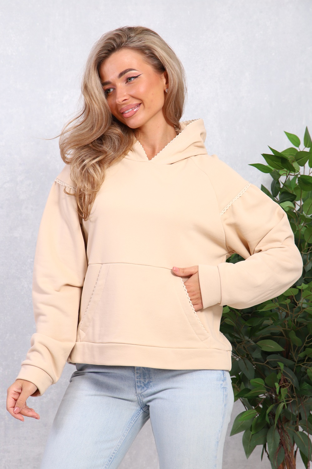 Женская толстовка с капюшоном, изюминка этой толстовки - стильный трендовый декор с винтажным мотивом - карманы, верх рукава и капюшон декорированы вязаным хлопковым кружевом. Универсальный комфортный крой обеспечивает удачную посадку на любой тип фигуры, капюшон обеспечит уют в прохладную погоду. Трикотаж премиального качества ("толстый" хлопок - петельчатый футер диагональ с 88% хлопка).