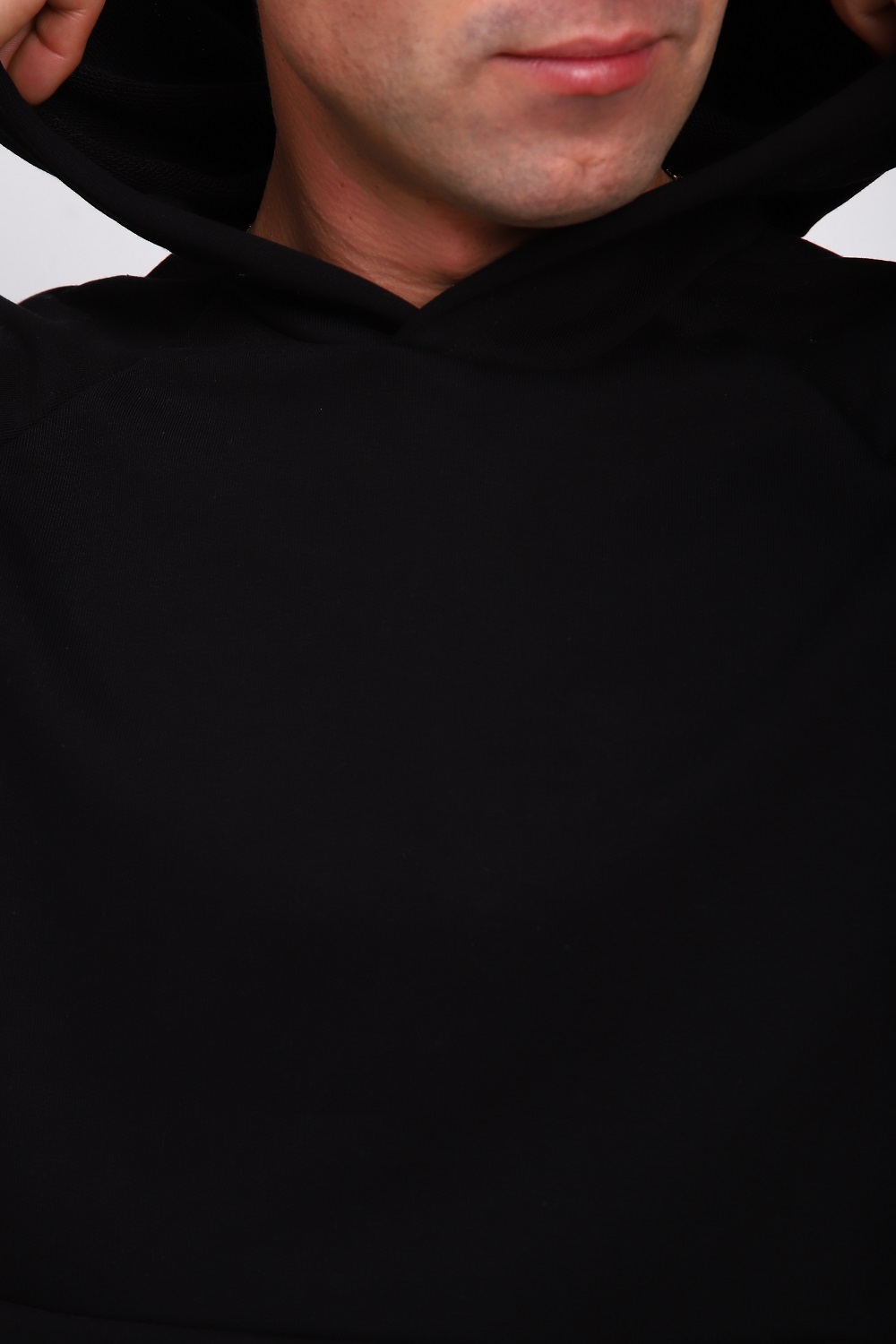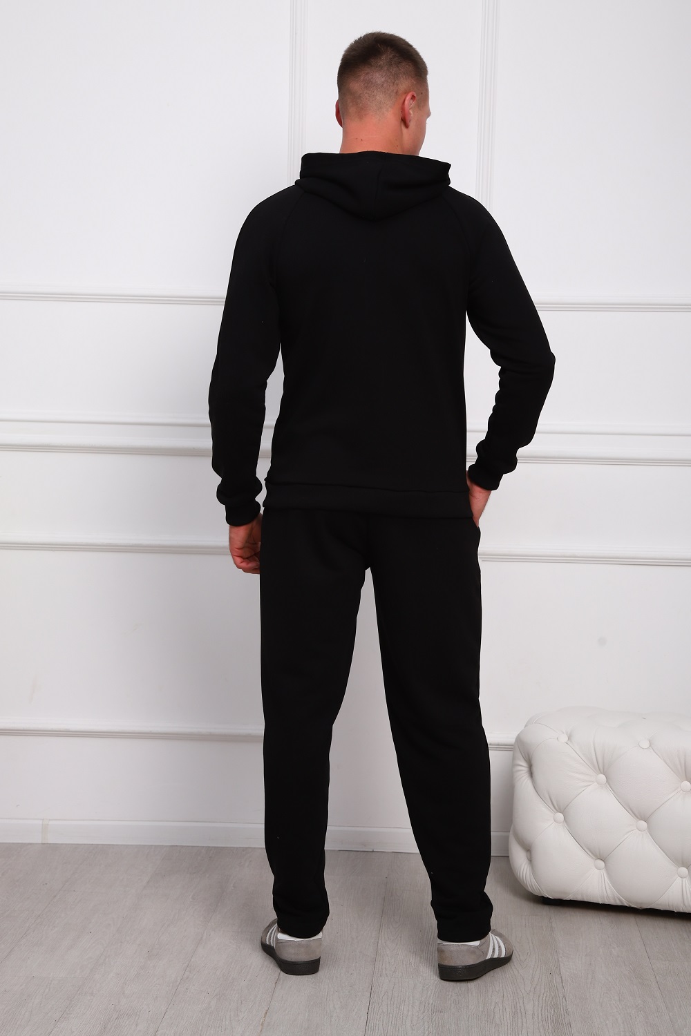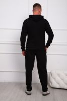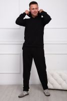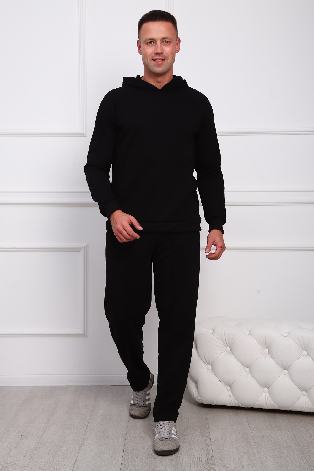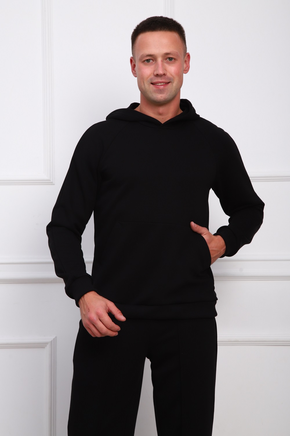 Костюм мужской: толстовка с брюками. Толстовка с карманом-кенгуру и с капюшоном. Рукава - реглан, на манжетах. Брюки на эластичном поясе, с боковыми карманами, с манжетами по низу брючин. Материал - плотный премиальный трикотаж с высоким содержанием хлопка (60%).
