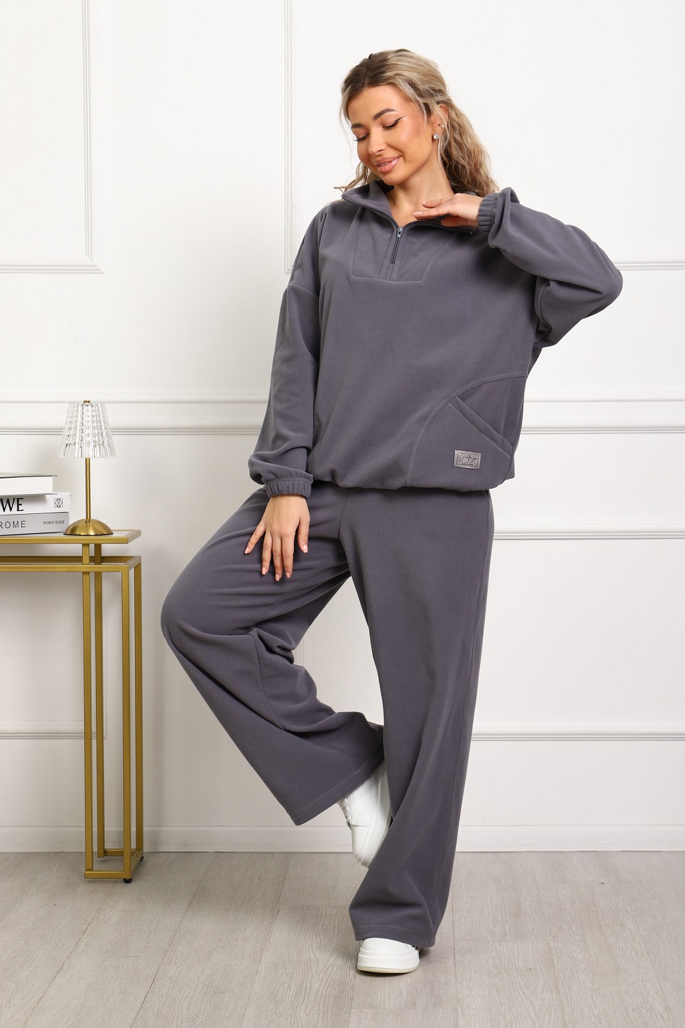 Костюм женский свободного силуэта: брюки широкие на эластичном поясе, с боковыми карманами; толстовка с воротником-стойкой на молнии, с оригинальными карманами, манжеты на резинке. Комфорт и тепло 100% флиса.