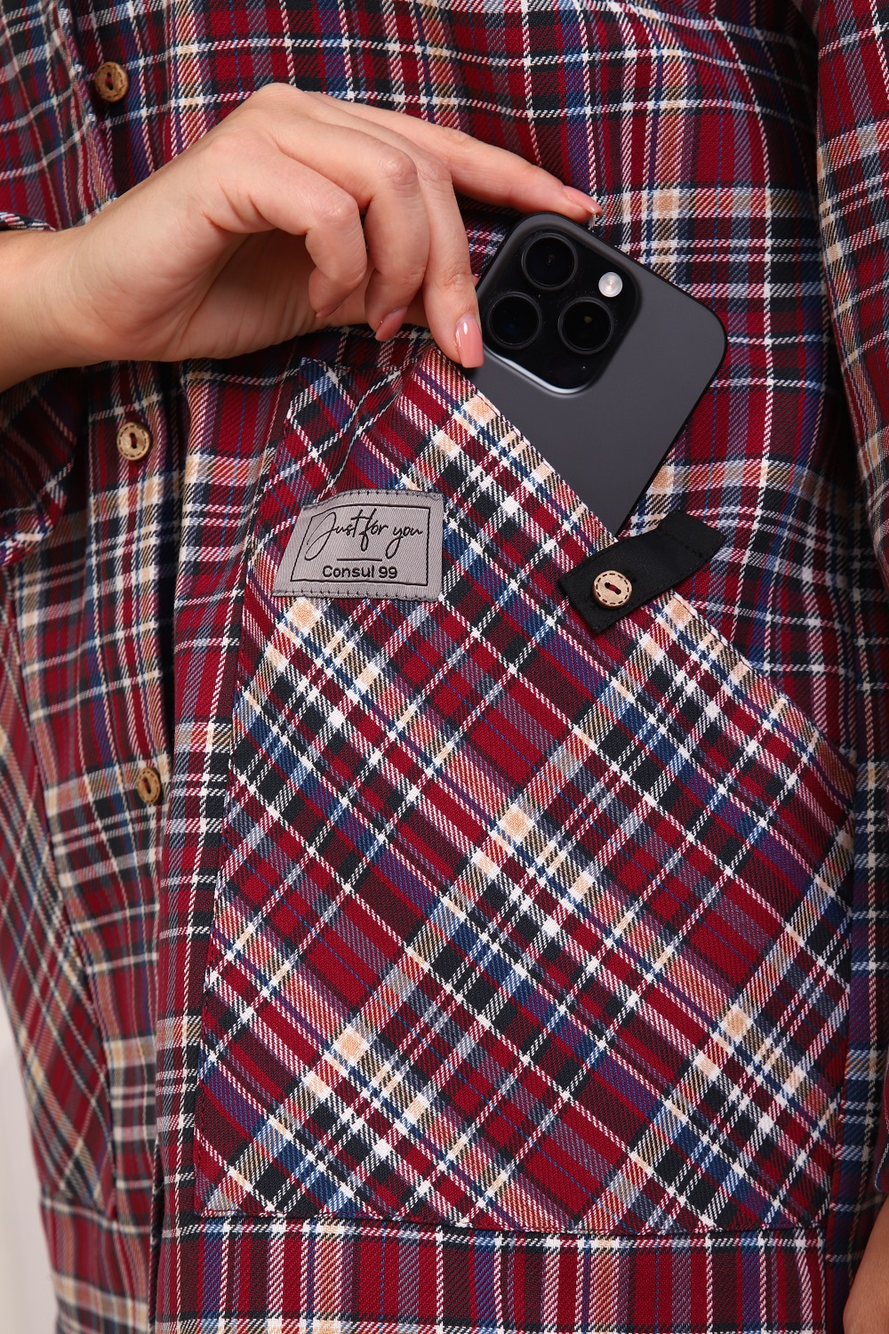 Женская теплая рубашка с очень удобными карманами-кенгуру и специальным акцентным чёрным карманом для смартфона (пластиковых карт, ручек, очков и т.п.), один из карманов-кенгуру можно застегивать петелькой на пуговицу. Рукава с манжетом, который подгибается - благодаря этому длина рукава регулируется в пределах 5 см (можно сделать чуть короче, чуть длинне). Крой рубашки очень комфортный, изделие не сковывает движений. Прямой силуэт стройнит. Ткань - фуле (относительно плотный материал, с небольшим начёсом с изнанки), 100% хлопок. Фуле легко утюжится, относительно не сильно мнётся, ткань устойчива к износу. Замечательный выбор для отдыха и работы. Наверняка, станет Вашей любимой рубашкой. Обратите, пожалуйста, внимание на рубашку аналогичного кроя, но из ткани шотландки - артикул 1072.