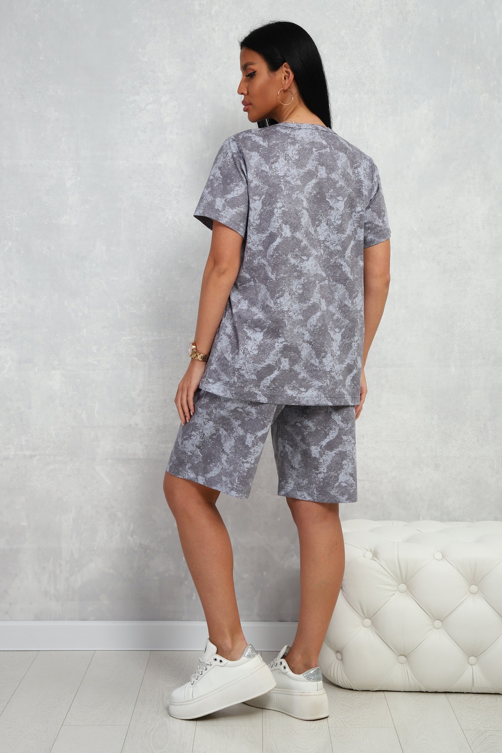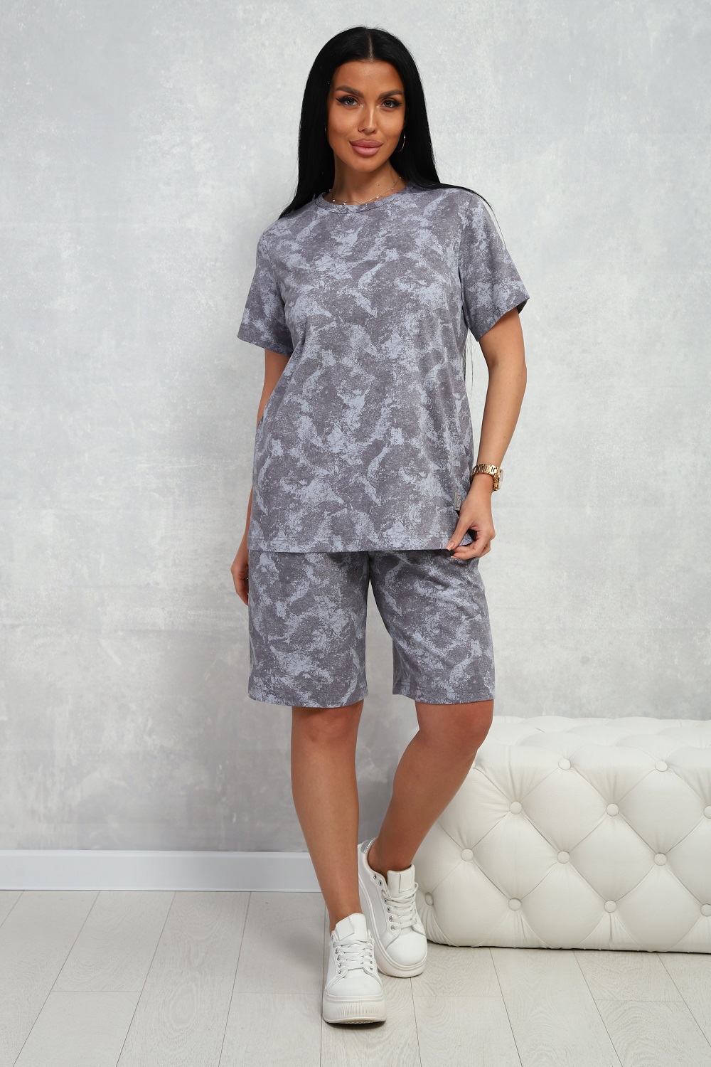 Костюм женский из 100% хлопка, стильная трендовая немаркая расцветка, футболка с короткими рукавами, шорты на эластичном поясе, с боковыми карманами. Универсальный выбор для дома, прогулок, занятий спортом.