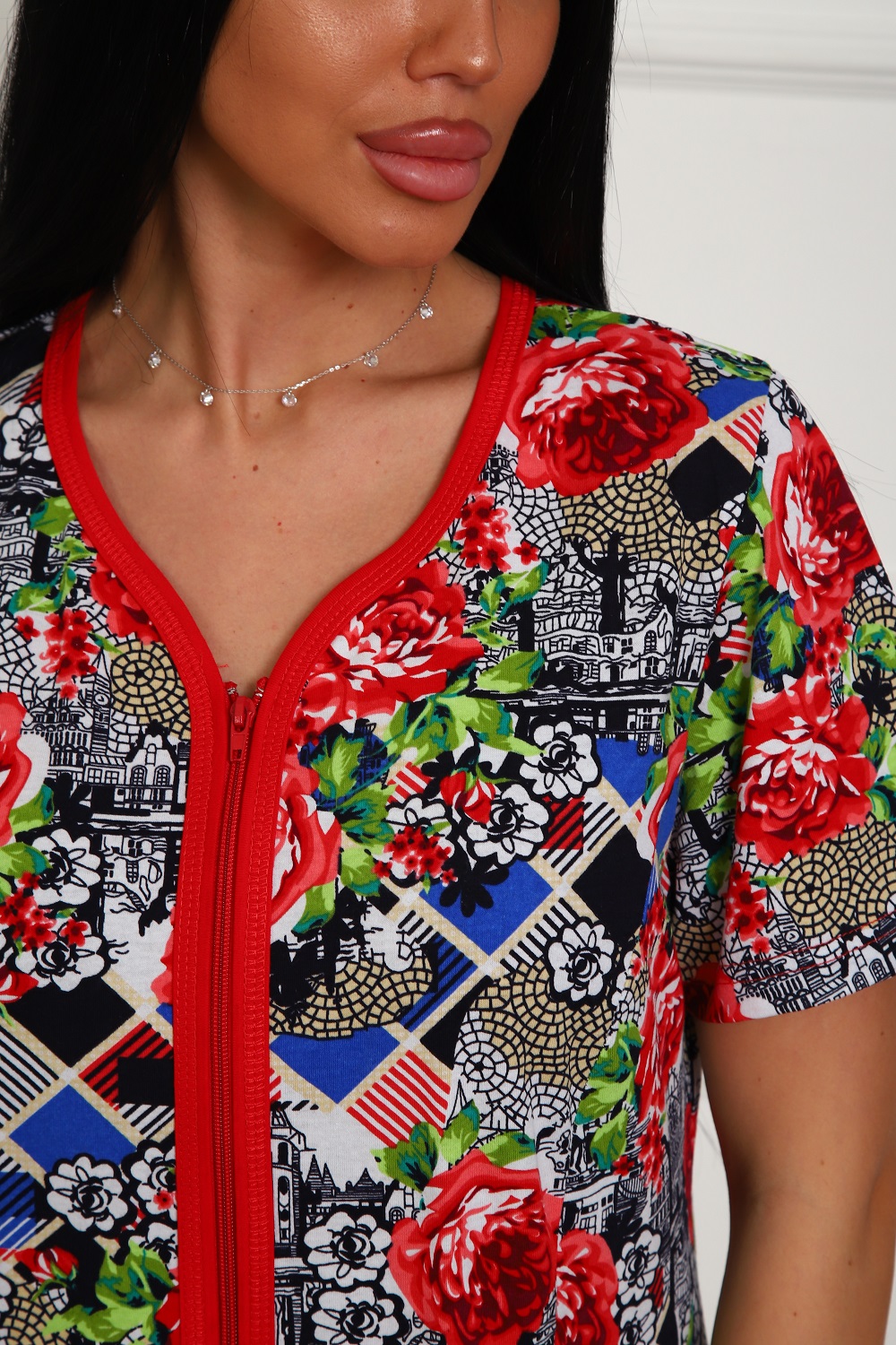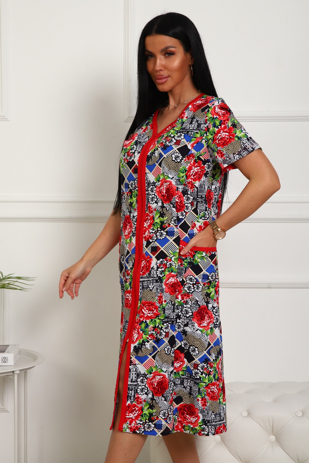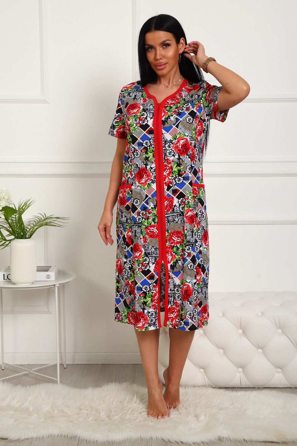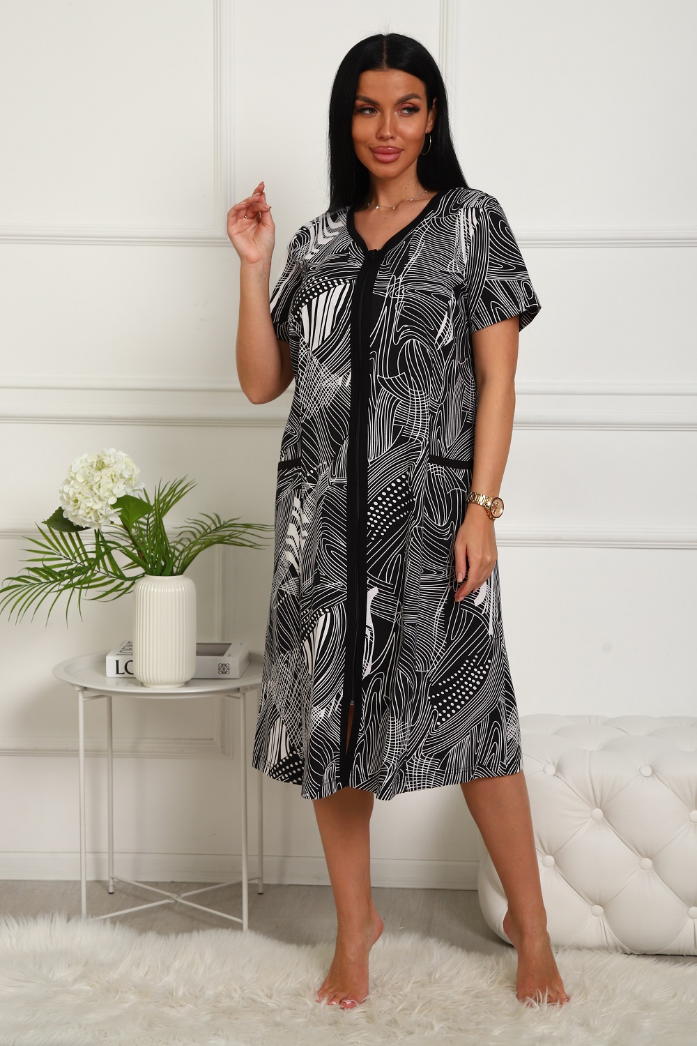 Халат женский трикотажный, с карманами, их 100% хлопка, немаркий. Внимание! Расцветки и рисунок - ассорти - цвет и рисунок поставляется рандомно. В размерах 52, 54, 60, 62, 64, 66, 68 рисунки разные, но цветовая гамма только черно-белая. В других размерах цветовая гамма и чёрно-белая, и других цветов согласно фото.