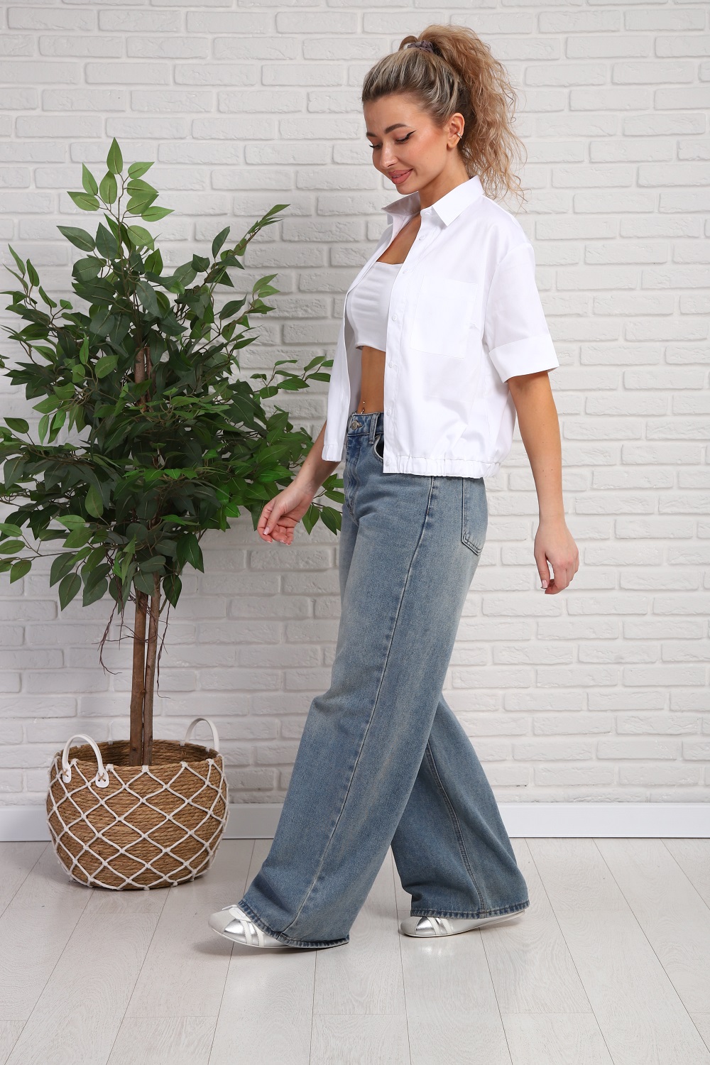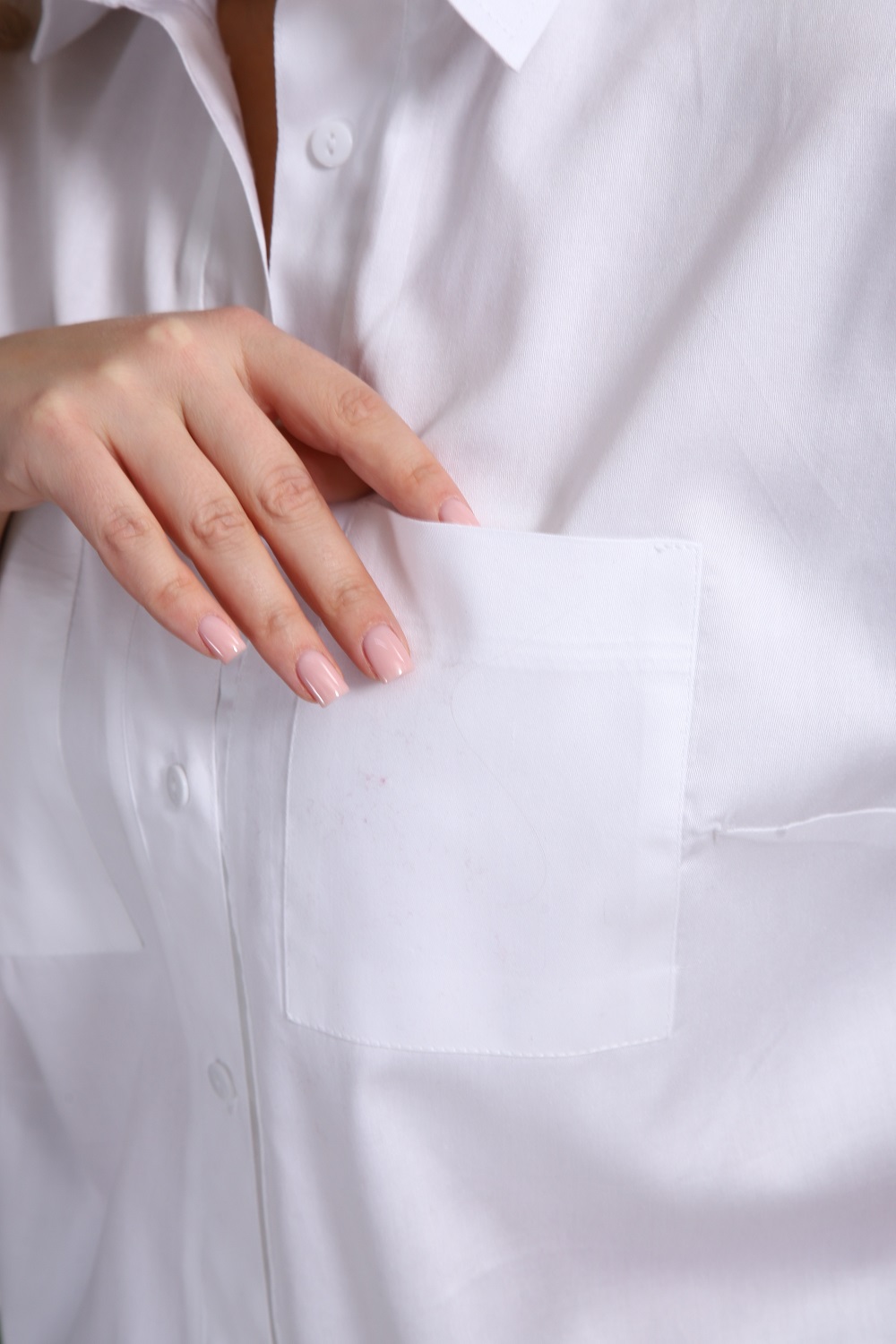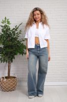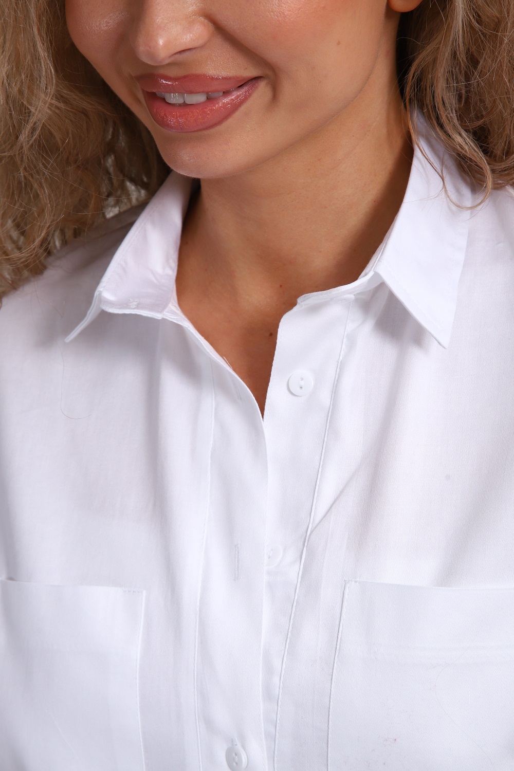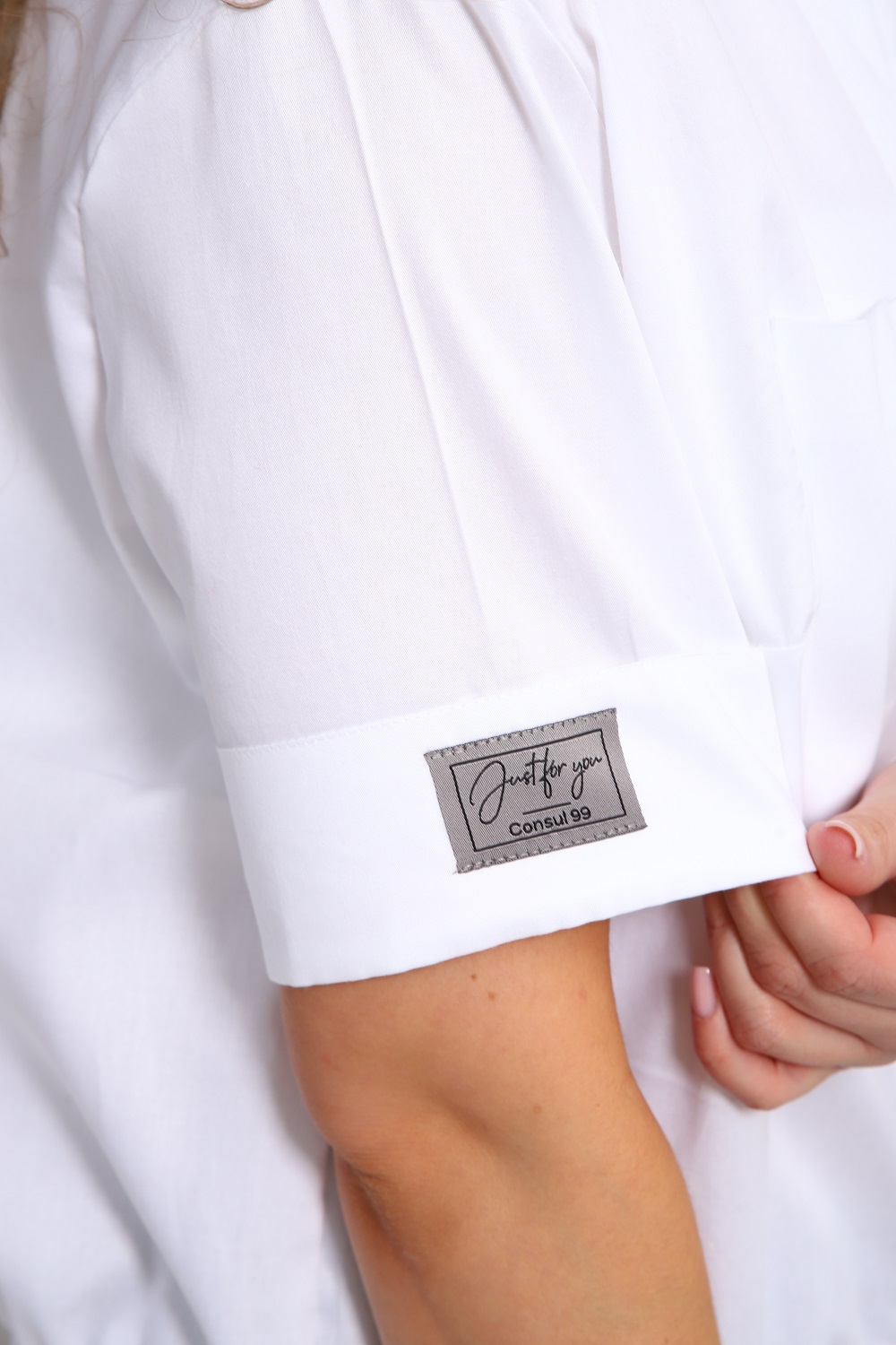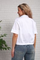 Бомбер-рубашка из премиального сатина, универсальный белый цвет. Короткий рукав (на одном из рукавов нашивка), пояс на резинке. Резинка по низу рубашки создаёт силуэт, посадка по фигуре задумана без натяжения резинки. Планка на пуговицах. Данная рубашка - универсальный выбор и для делового стиля (отлично сочетается с классическими юбками и брюками), и для повседневной одежды (сочетается с джинсами, спортивными штанами). В размерной сетке в объёме бёдер указанно два измерения: низ изделия в присборенном состоянии - низ изделия при растянутой резинке.