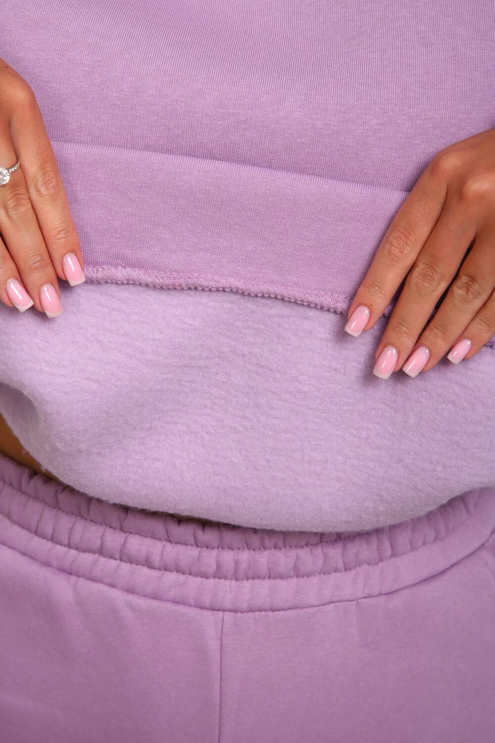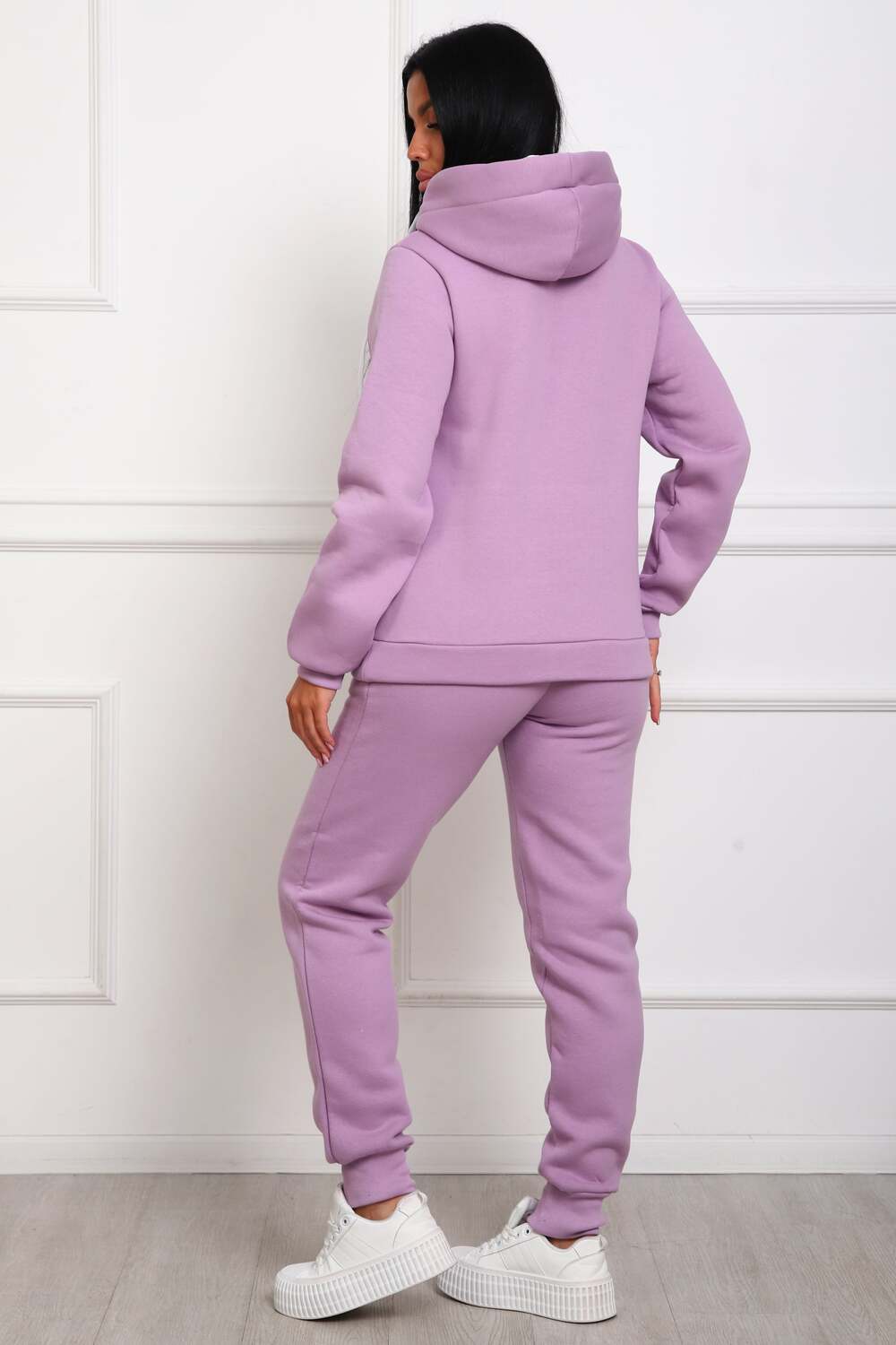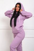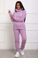Костюм женский из футера 3-х нитки с начесом. Состоит из толстовки с капюшоном и брюк. Толстовка прямого силуэта, низ на поясе. Рукав втачной на манжете. Капюшон - воротник хомут, с люверсами и шнуром. Подкапюшон из велсофта. Карманов нет. Брюки прямого кроя, на манжете по низу изделия. В боковых швах выполнены карманы. Пояс отрезной, на резинке 4см. шириной.