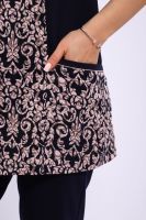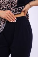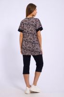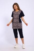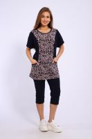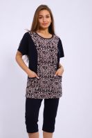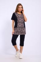 Костюм женский выполнен из трикотажного полотна кулирка. Костюм состоит из футболки и бридж. Футболка свободного силуэта. Подрезные бочка выполнены из гладкокрашенного полотна- компаньона. Карманы в подрезных бочках, спущенное плечо, углубленная пройма, горловина и рукава окантованы двойным кантом. Бриджи прямые, цельнокраенный пояс на резинке.