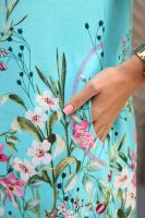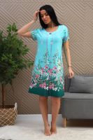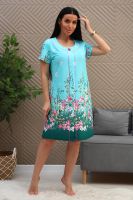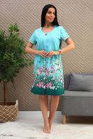 Халат женский из трикотажа. Хлопок 100%. Силуэт полуприлегающий, чуть расклешённый к низу. Горловина круглой формы. Рукав короткий. Низ изделия прямой. В боковых швах карманы. Застежка потайная, на тесьму молнию. Отделкой служит строчка контрастного цвета, в цвет обтяжной пуговицы.
