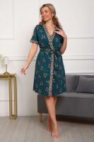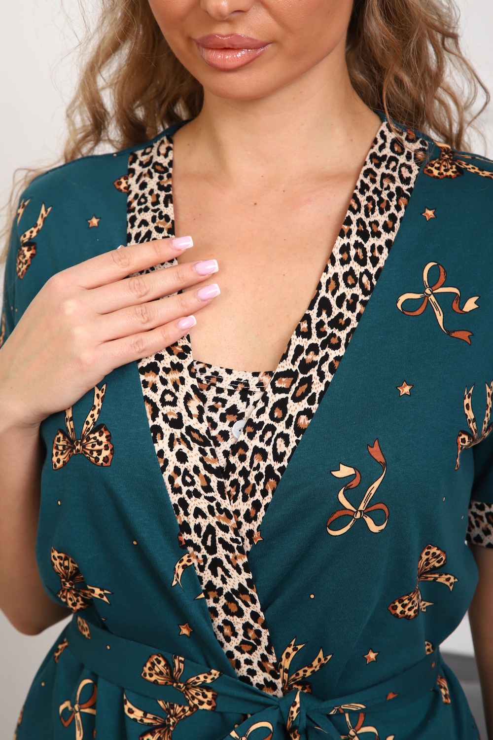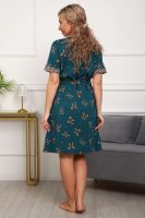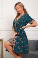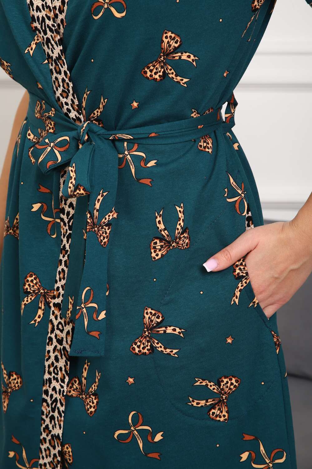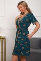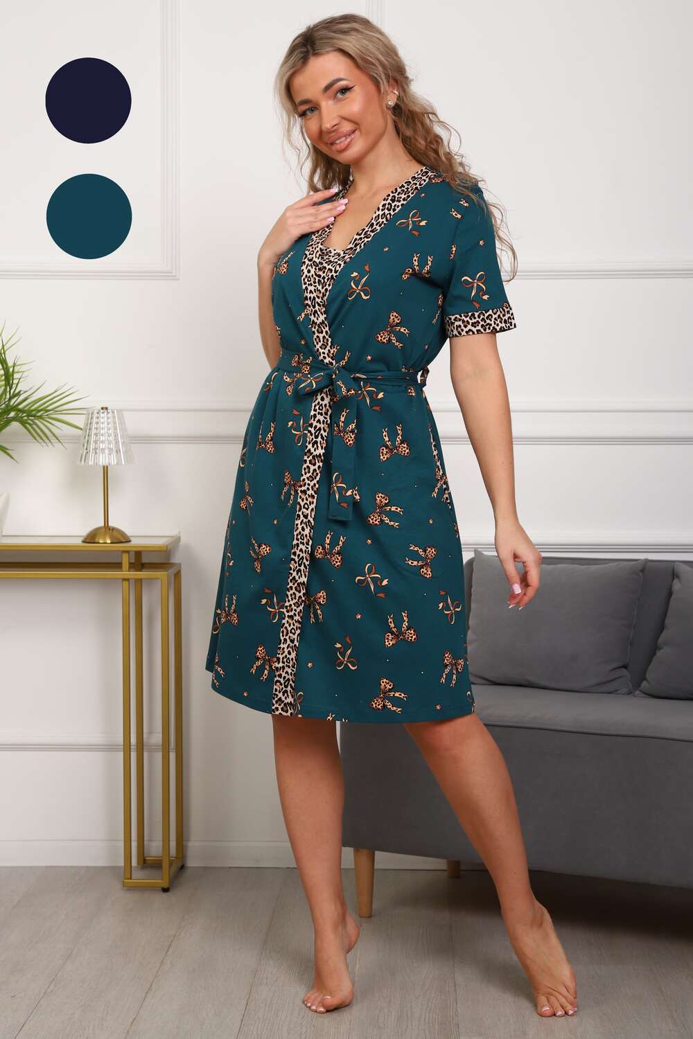 Комплект женский, из двух видов ткани, основной и компаньон, халат с сорочкой. Халат прямого силуэта, на запах. Рукав короткий. В боровых швах карманы, низ прямой. Сорочка на бретелях. Расклешённая к низу. Спинка гладкая. Перед с подрезом под грудью. Лиф с защипами по линии груди, и двумя декоративными пуговицами. Низ изделия прямой