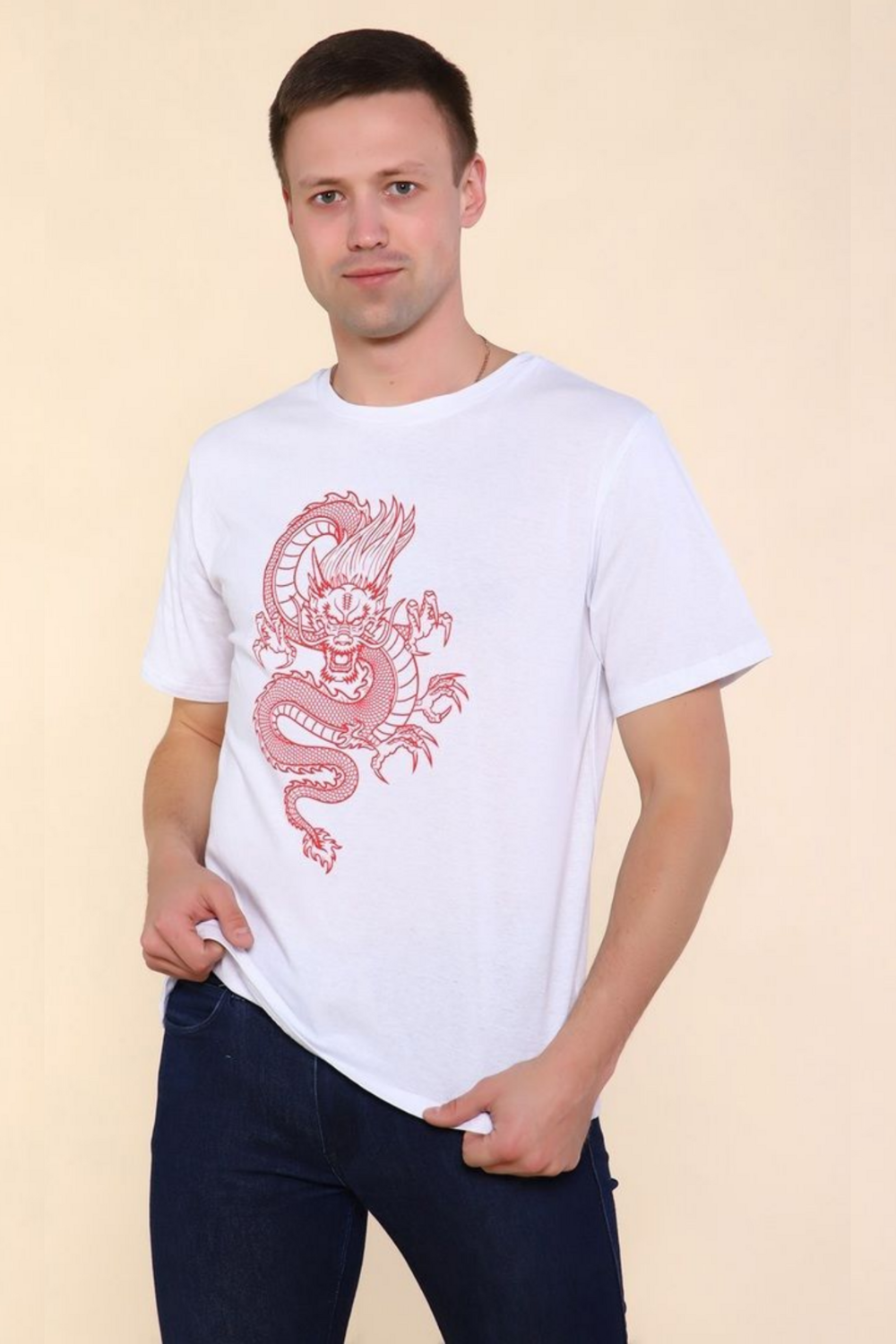 Мужские футболки из хлопка с принтами драконов в различных цветовых комбинациях и широким размерным рядом доступны для покупки. Белая футболка с красным или черным драконом Черная футболка с белым или красным драконом Такие футболки из 100% хлопка представлены в различных размерах, в том числе и больших (до 62 российского размера) Футболок много не бывает, отличный подарок на любой праздник.