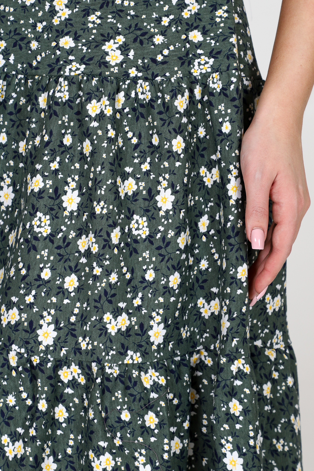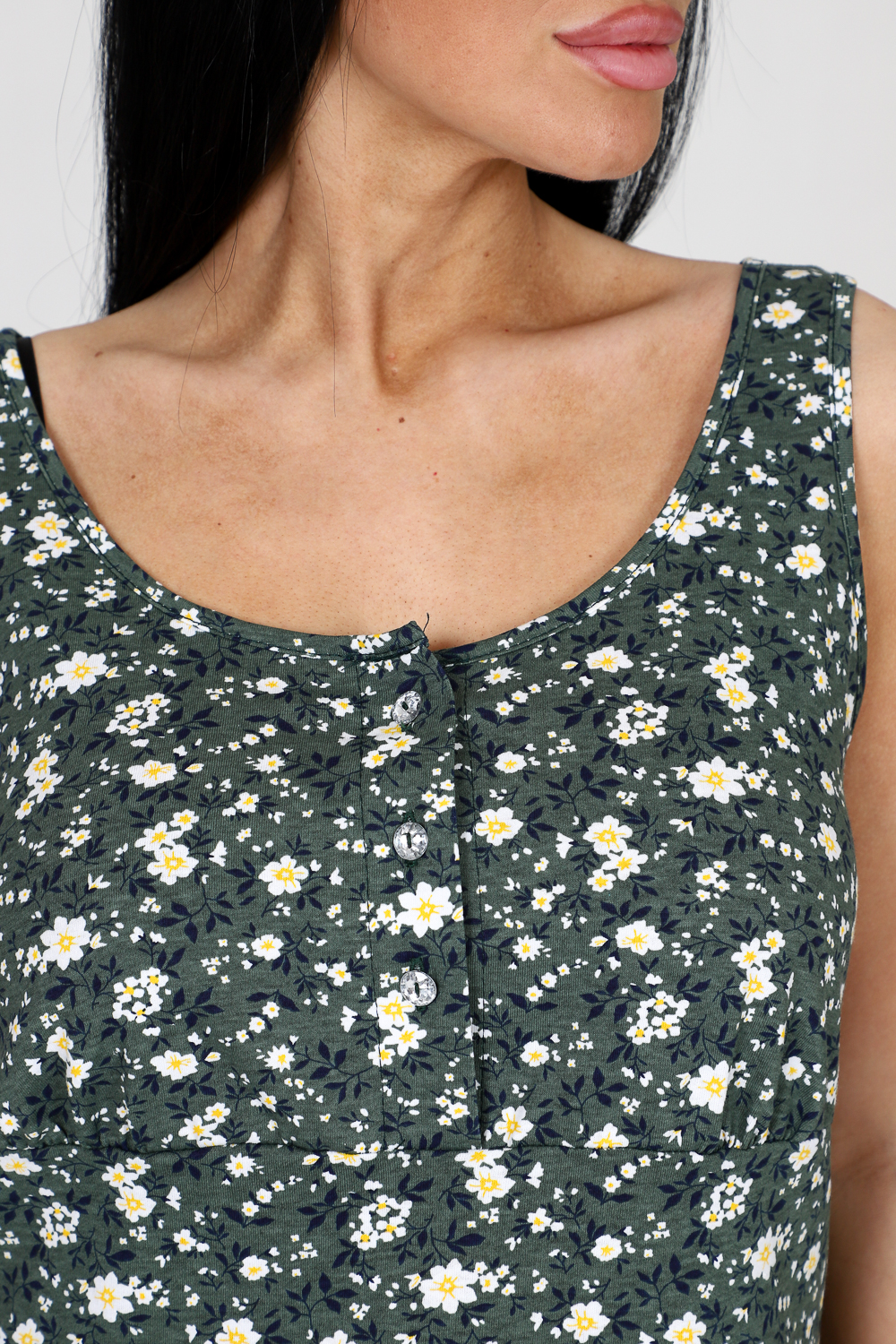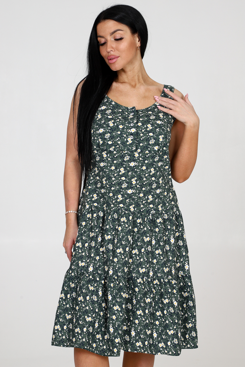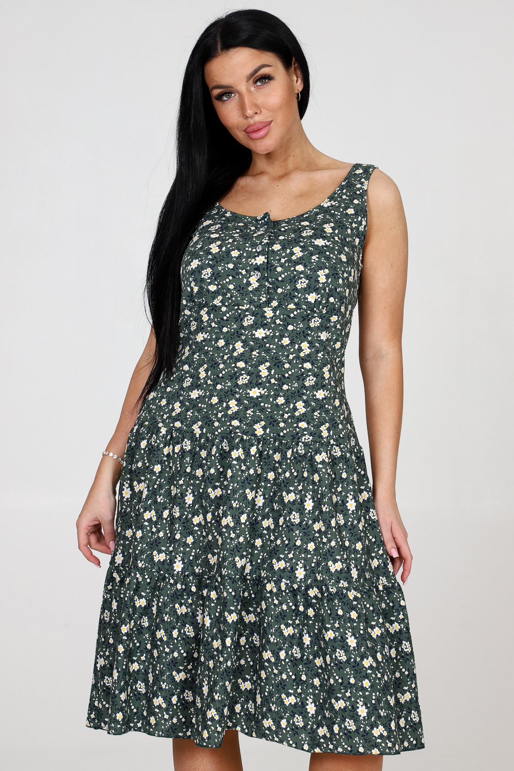 Сарафан женский из кулирки. Сарафан состоит из кокетки, которая застегивается на планку. Юбка изделия состоит из двух ярусов. Горловина и пройма изделия окантована.
