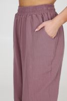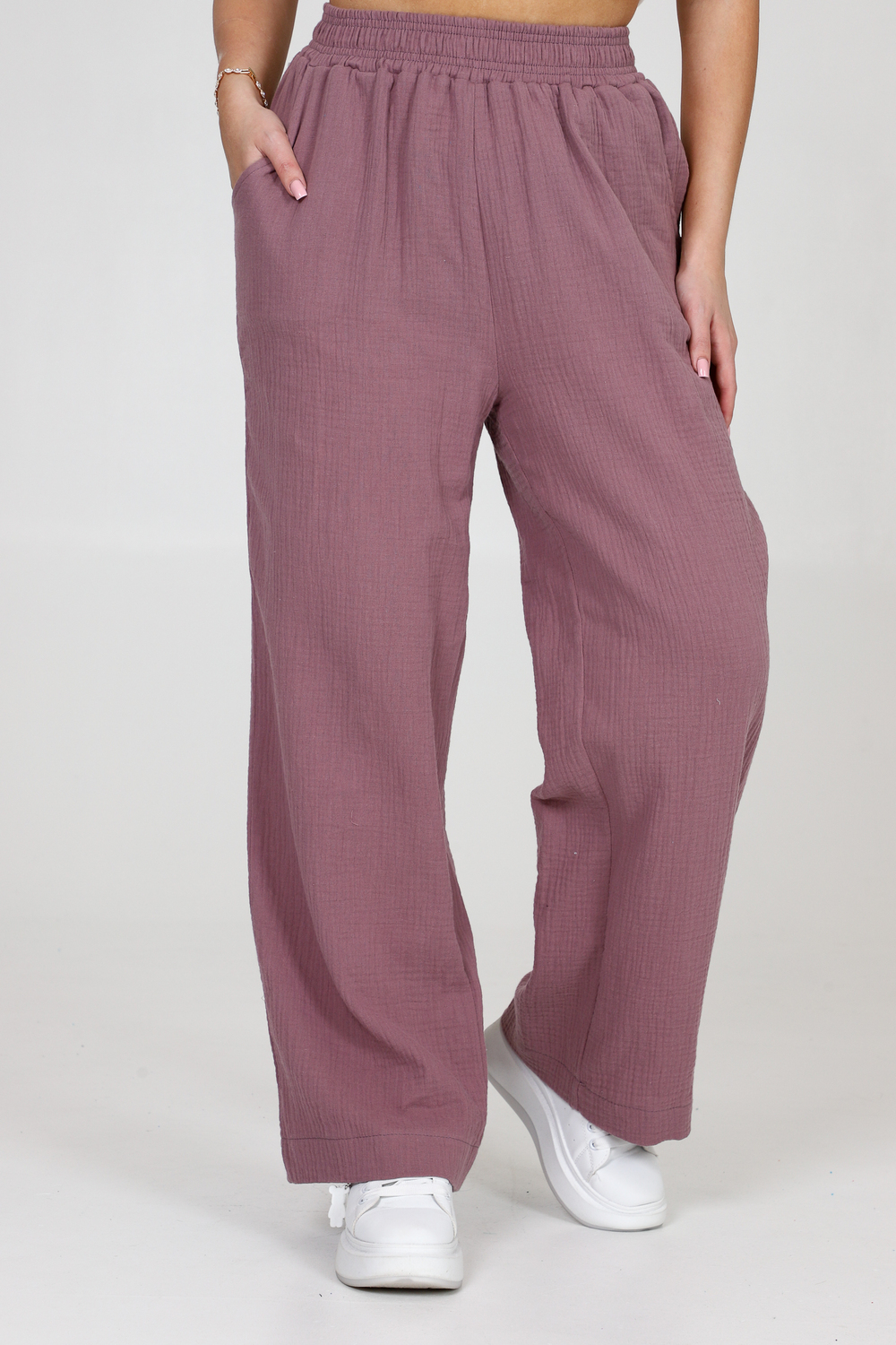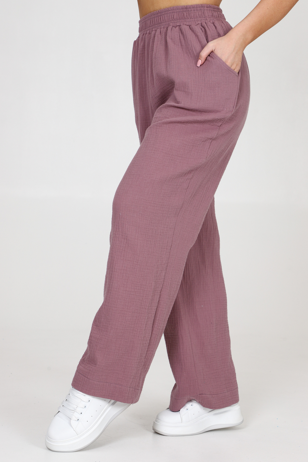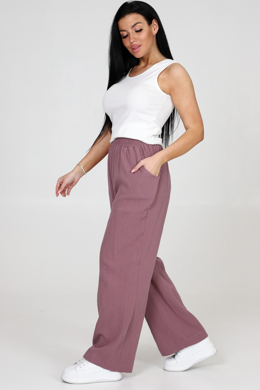 Брюки женские из муслина свободного покроя, на притачном поясе и с боковыми карманами.
