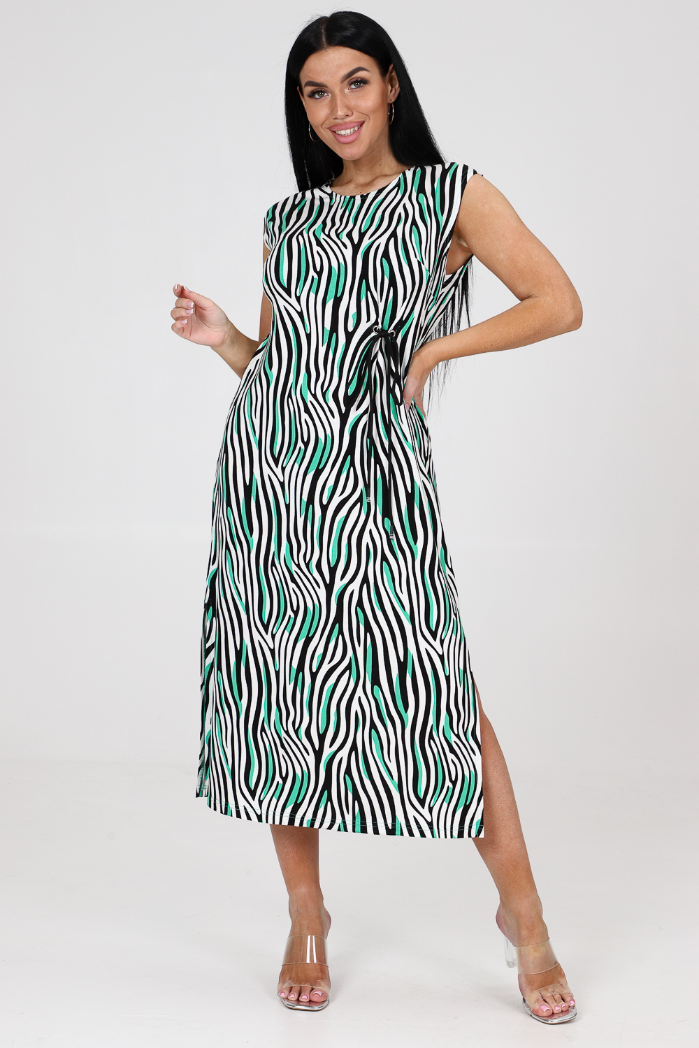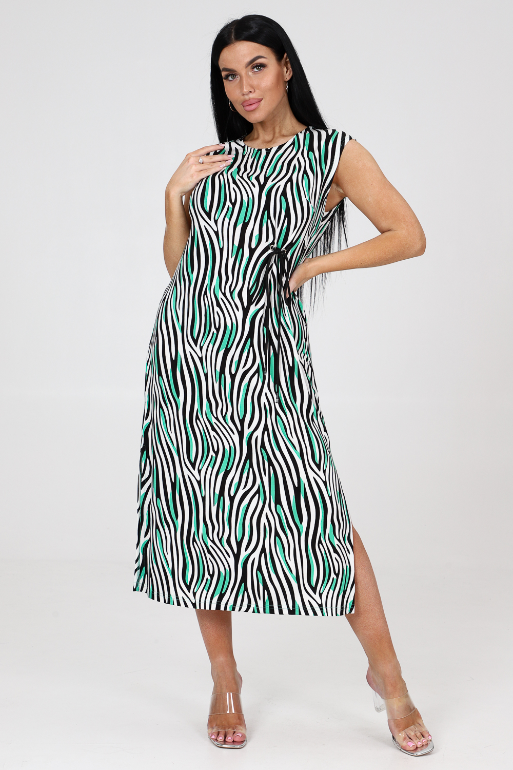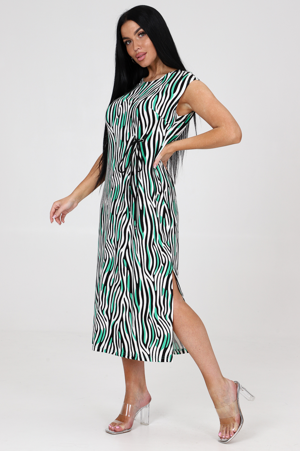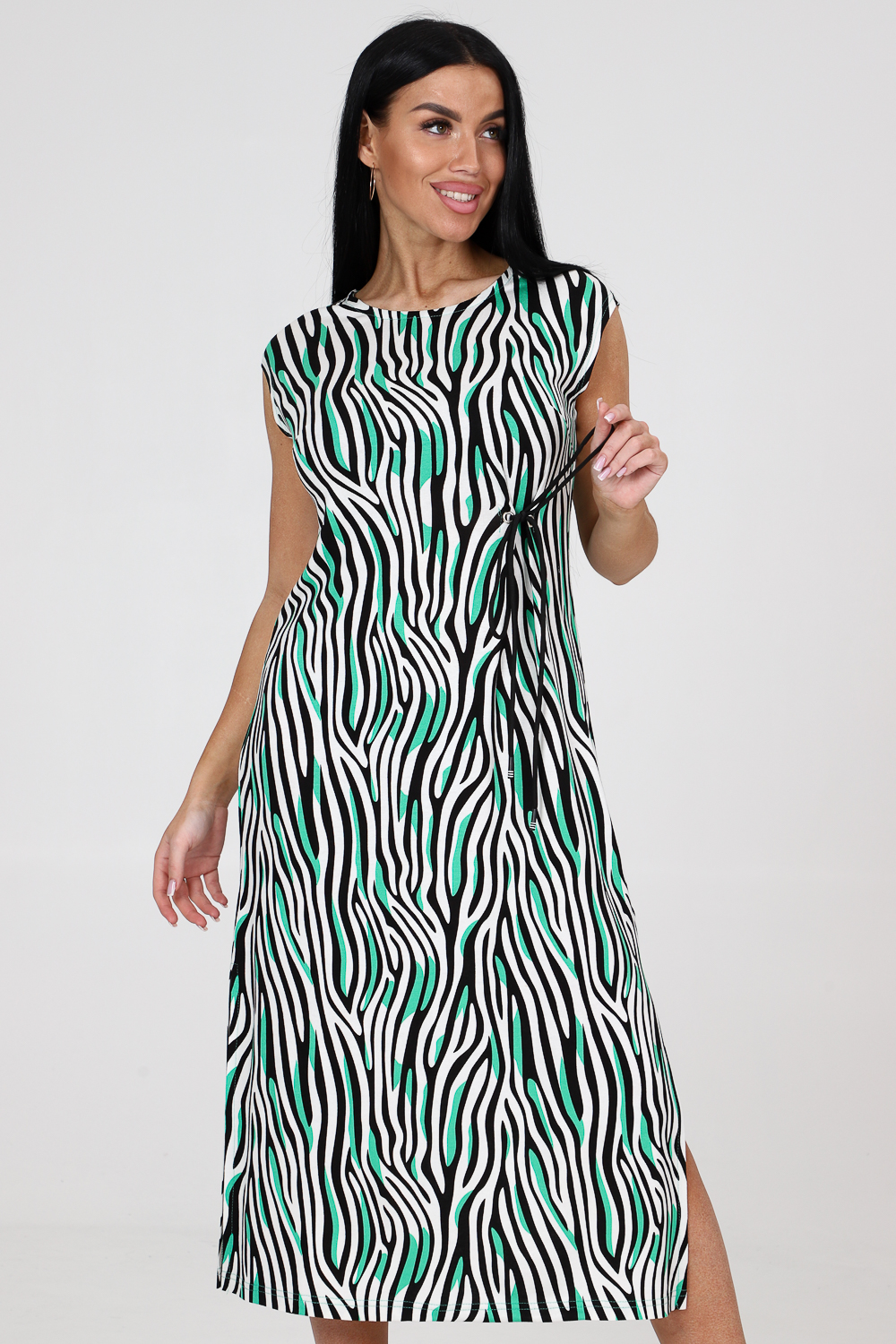 Платье женское из вискозы свободного покроя. Платье со спущенной проймой, с двумя боковыми разрезами, с вытачками.