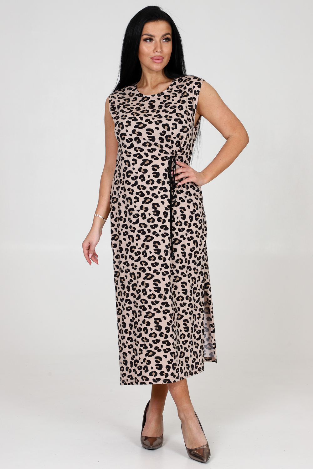 Платье женское из кулирки. Платье свободного покроя со спущенной проймой, с боковыми разрезами, с вытачками.