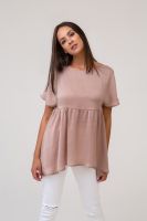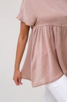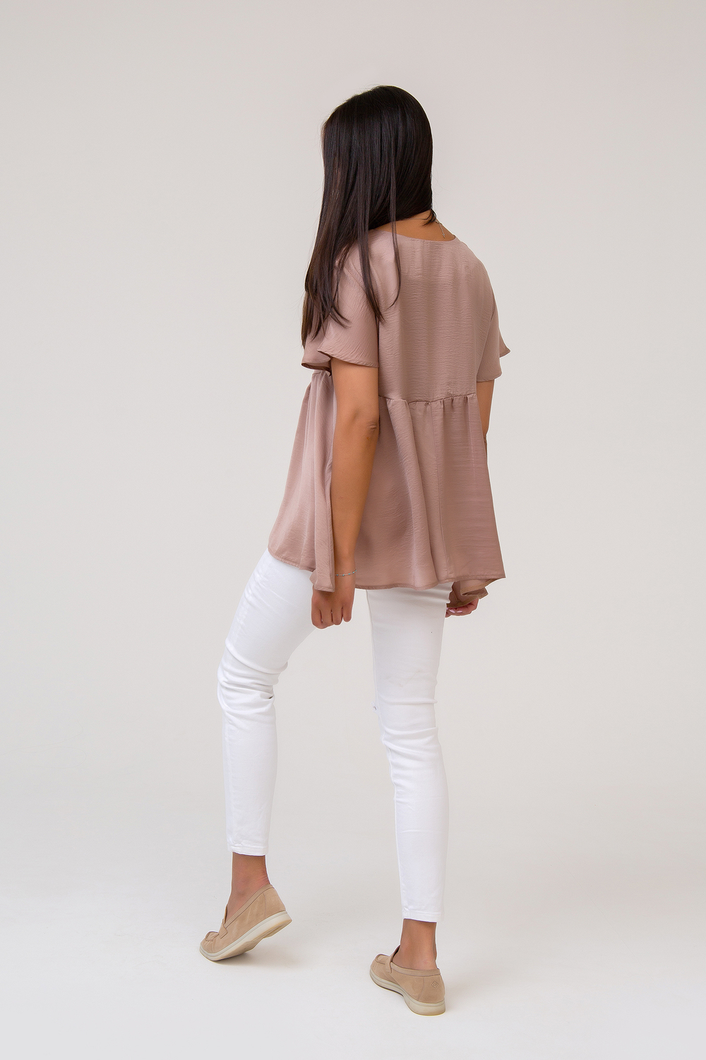 Лёгкая туника свободного кроя, выполненная в спокойном оттенке. Модель с отрезным, мягко струящимся подолом, что делает образ нежным и воздушным. Рукав короткий. Вырез горловины округлый. Изделие будет прекрасно сочетаться с узкими длинсами или, модными в этом сезоне, велосипедками. Ткань - шелк-атлас жатка. Состав - 100% полиэстер. Длина изделия 66 см. Рост модели на фото 173 см