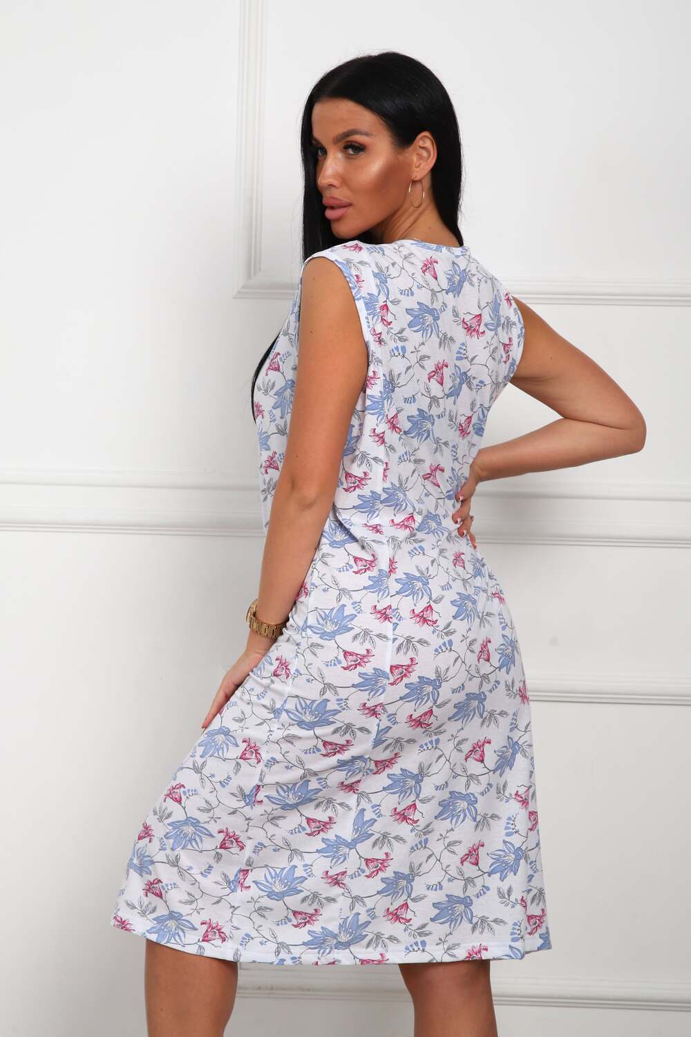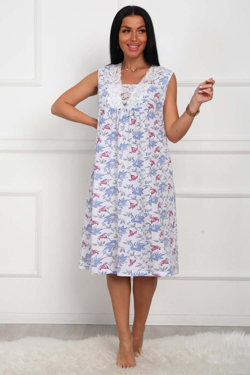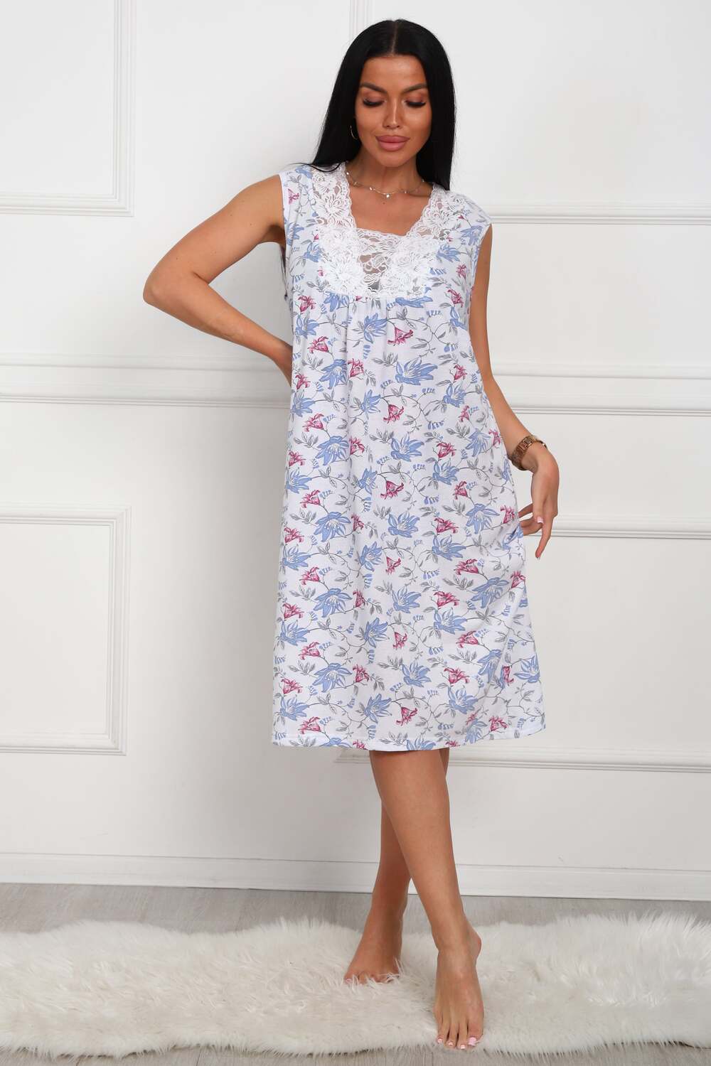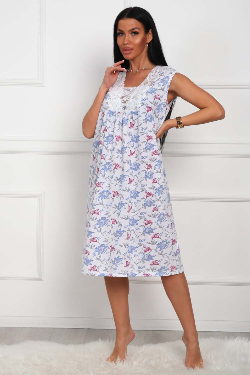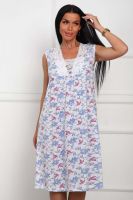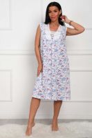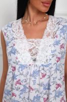 Сорочка женская из натурального набивного полотна. Хлопок 100%. Силуэт прямой. Длинна чуть ниже колена. Горловина фигурной формы, отделана кружевом. По линии груди легкая сборка. По спинке рельефы. Без рукава. Пройма и горловина спинки обработаны окантовкой. Низ изделия прямой.