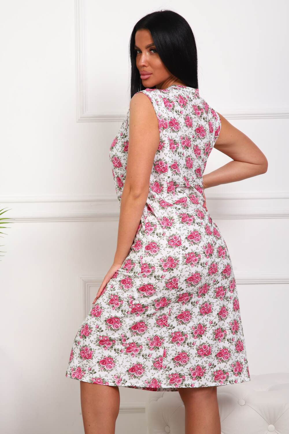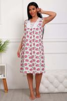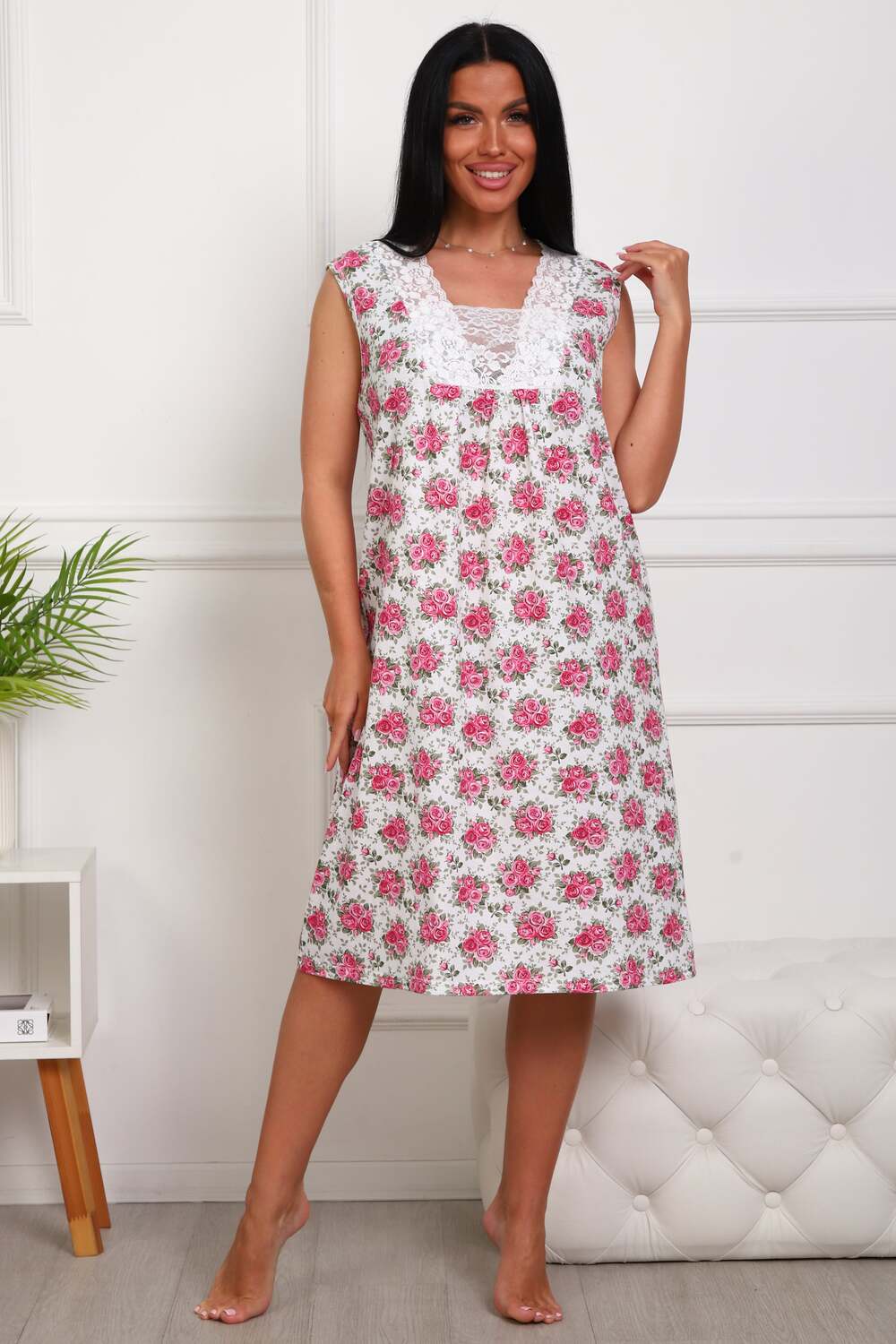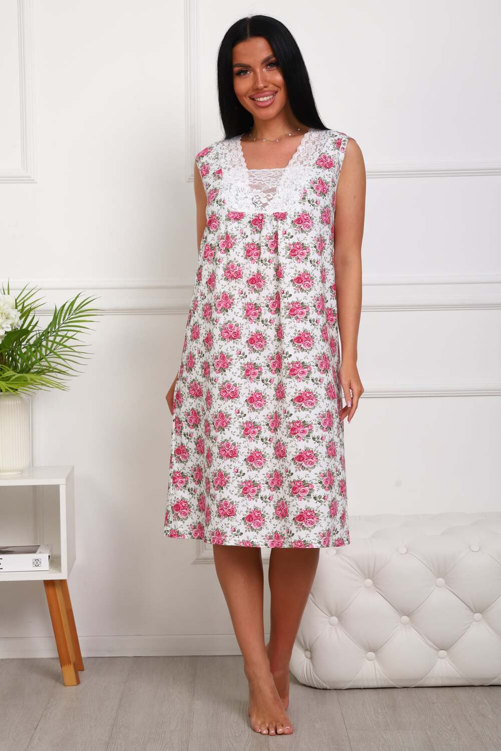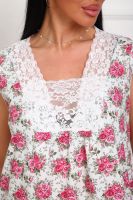 Сорочка женская из натурального набивного полотна. Хлопок 100%. Силуэт прямой. Длинна чуть ниже колена. Горловина фигурной формы, отделана кружевом. По линии груди легкая сборка. По спинке рельефы. Без рукава. Пройма и горловина спинки обработаны окантовкой. Низ изделия прямой.