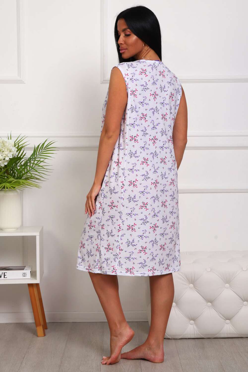 Сорочка женская из натурального набивного полотна. Хлопок 100%. Силуэт прямой. Длинна чуть ниже колена. Горловина фигурной формы, отделана кружевом. По линии груди легкая сборка. По спинке рельефы. Без рукава. Пройма и горловина спинки обработаны окантовкой. Низ изделия прямой.