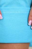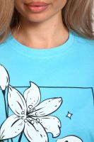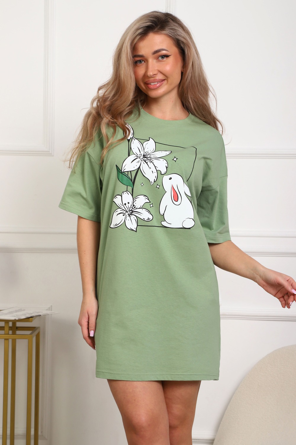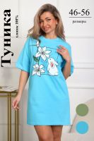 Туника женская прямого силуэта. Низ изделия прямой. Длинна выше колена, плечо спущенное, рукав короткий. Горловина круглой формы, обработана планкой с отделочной строчкой по шву притачивания. Принт (шелкография) располагается по центру переда.