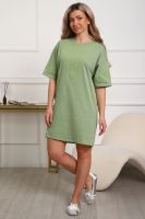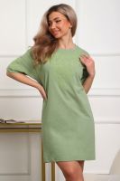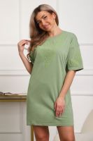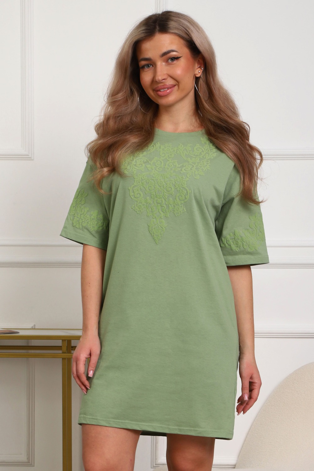 Туника женская прямого силуэта. Низ изделия прямой. Длинна выше колена, плечо спущенное, рукав короткий. Горловина круглой формы. Принт орнамент (шелкография пуф) располагается по центру переда и на рукавах.