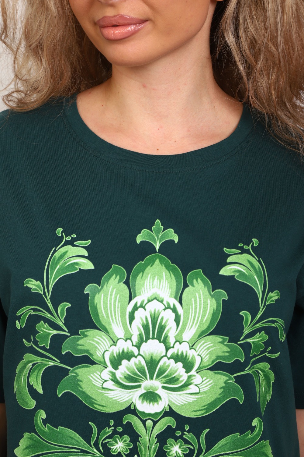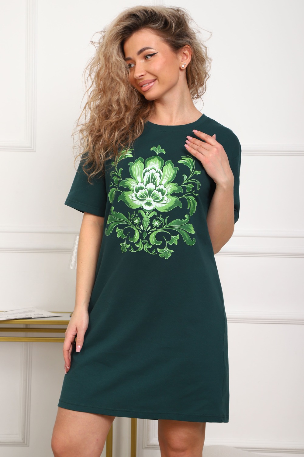 Туника женская прямого силуэта. Низ изделия прямой. Длинна выше колена, плечо спущенное, рукав короткий. Горловина круглой формы, обработана планкой с отделочной строчкой по шву притачивания. Принт (шелкография) располагается по центру переда.