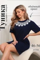 Туника женская прямого силуэта. Низ изделия прямой. Длинна выше колена, плечо спущенное, рукав короткий. Горловина круглой формы, обработана планкой с отделочной строчкой. Принт (шелкография пуф) в виде кружевного воротника.