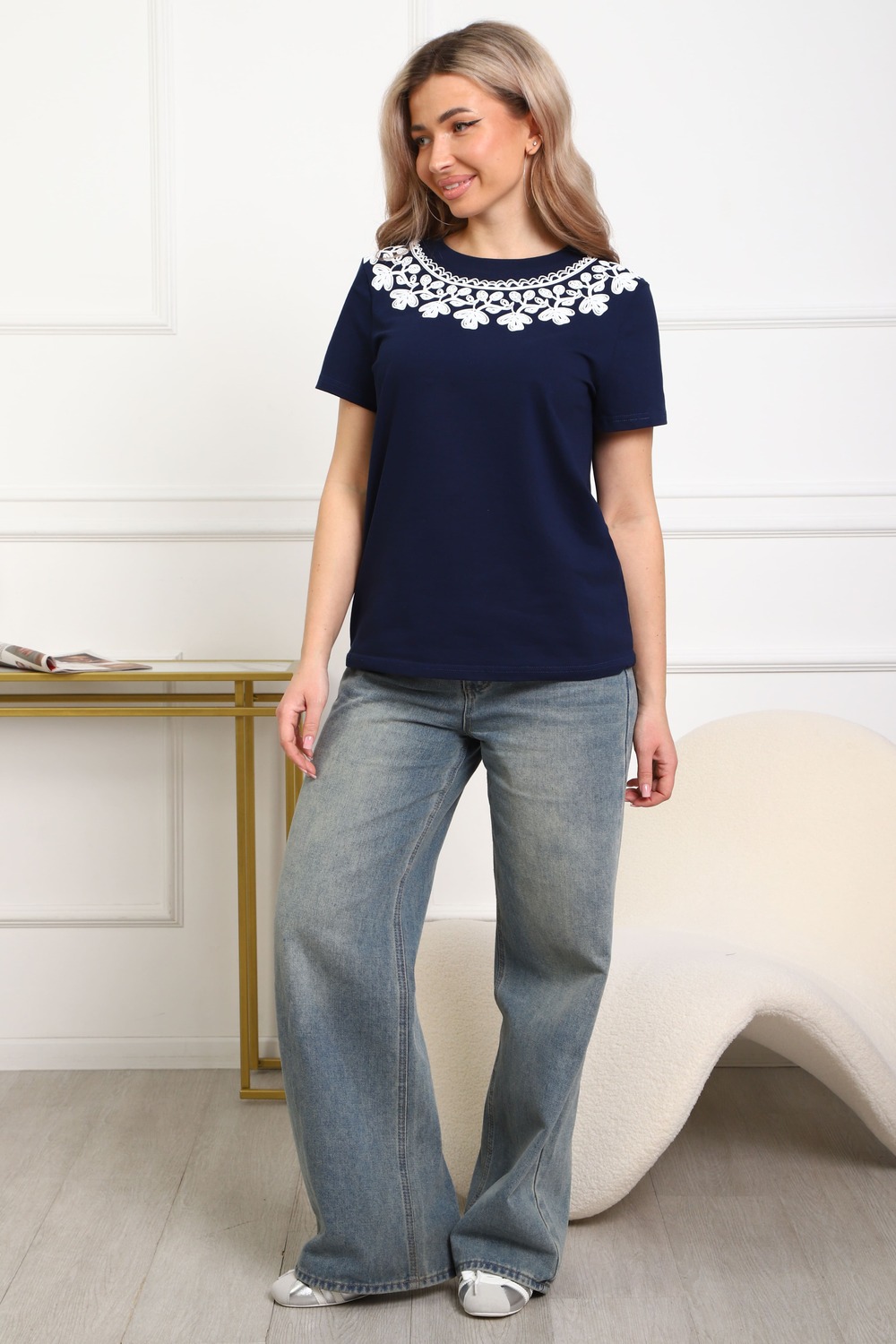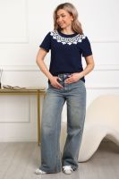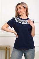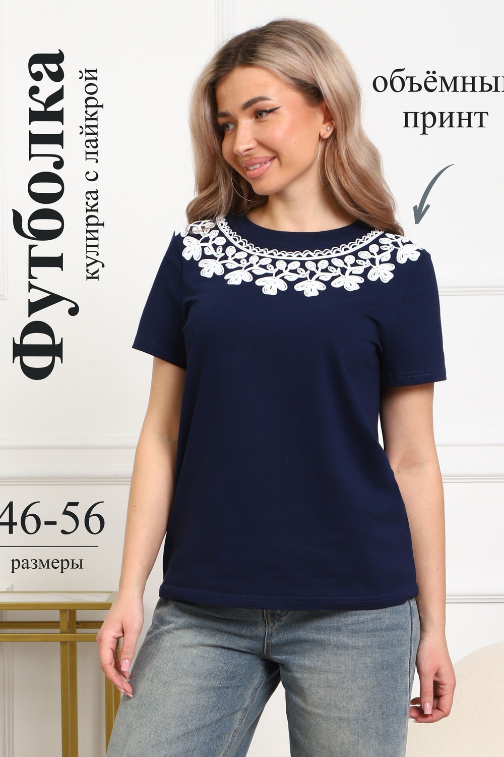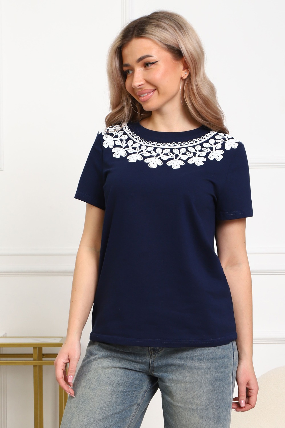 Футболка женская прямого силуэта. Низ изделия прямой. Длинна до середины бедра, плечо на естественном месте, рукав короткий. Горловина круглой формы, обработана планкой . Принт (шелкография пуф) в виде кружевного воротника.