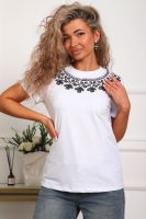 Футболка женская прямого силуэта. Низ изделия прямой. Длинна до середины бедра, плечо на естественном месте, рукав короткий. Горловина круглой формы, обработана планкой . Принт (шелкография пуф) в виде кружевного воротника.
