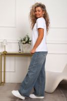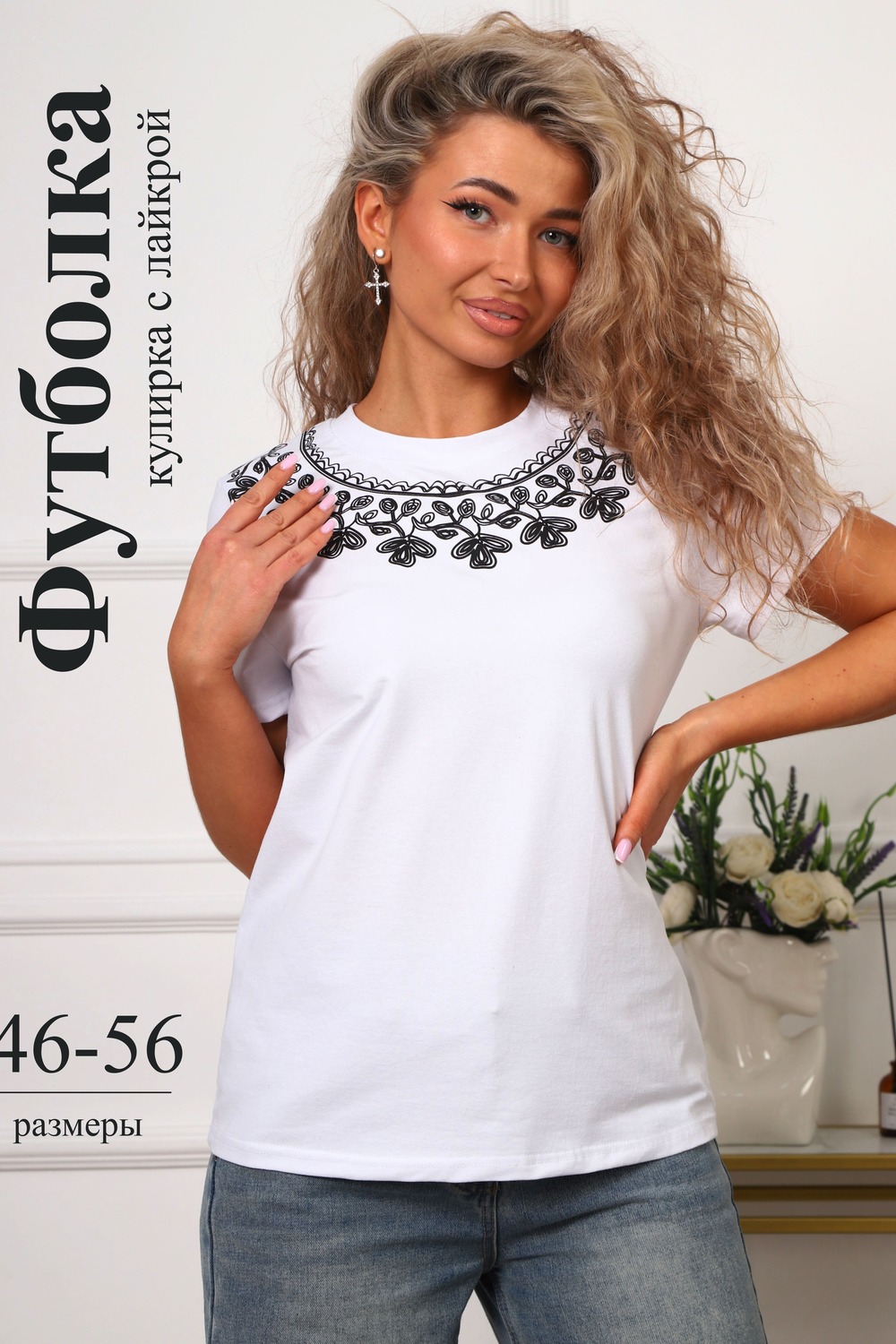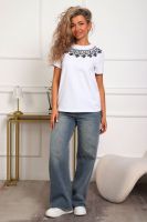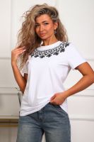 Футболка женская прямого силуэта. Низ изделия прямой. Длинна до середины бедра, плечо на естественном месте, рукав короткий. Горловина круглой формы, обработана планкой . Принт (шелкография пуф) в виде кружевного воротника.