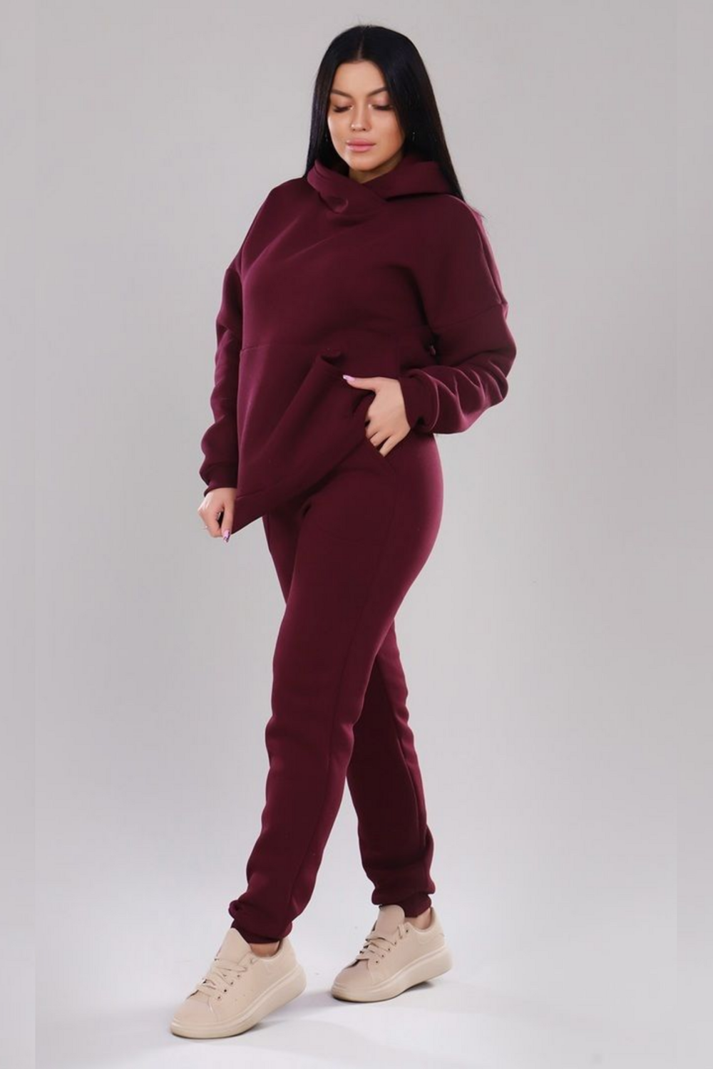 Утеплённый женский спортивный костюм: комфорт и стиль в каждом движении! Представляем универсальный костюм, который станет вашей любимой базовой вещью в прохладные дни. Комплект состоит из двух предметов: 1) худи оверсайз?силуэта; 2) свободных брюк на эластичной резинке. Почему этот костюм — must?have в вашем гардеробе? Универсальность. Подходит девушкам с любым типом фигуры, а также будущим мамам. Отдельные элементы костюма легко комбинируются с другой одеждой — создавайте разнообразные стильные образы! Комфорт. Оверсайзный крой худи и свободные брюки обеспечивают полную свободу движений. Эластичные манжеты на рукавах и штанинах надёжно фиксируют одежду и защищают от холода. Тепло и мягкость. Костюм изготовлен из качественного футера с начёсом — материала, который славится своей способностью сохранять тепло и приятной текстурой. Вы будете чувствовать себя уютно в любую погоду! Практичность. Идеален для повседневной носки: подойдёт для работы, прогулок, домашнего отдыха. Ключевые особенности: однотонное исполнение — легко сочетается с аксессуарами и другой одеждой; эластичная резинка на талии брюк — комфортная посадка; качественный футер с начёсом — долговечность и приятные тактильные ощущения; широкий размерный ряд, включая большие размеры. Сезонность: весна, осень, зима. Подарите себе комфорт и стиль — выбирайте утеплённый спортивный костюм, в котором вы будете выглядеть безупречно и чувствовать себя максимально уютно!
