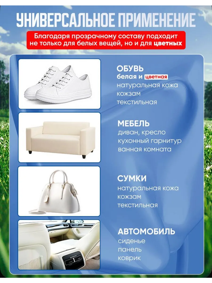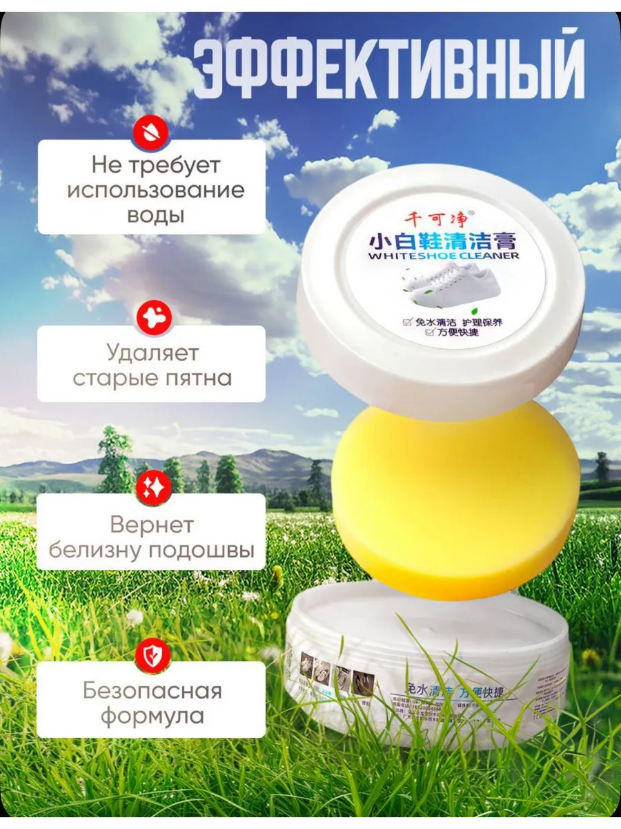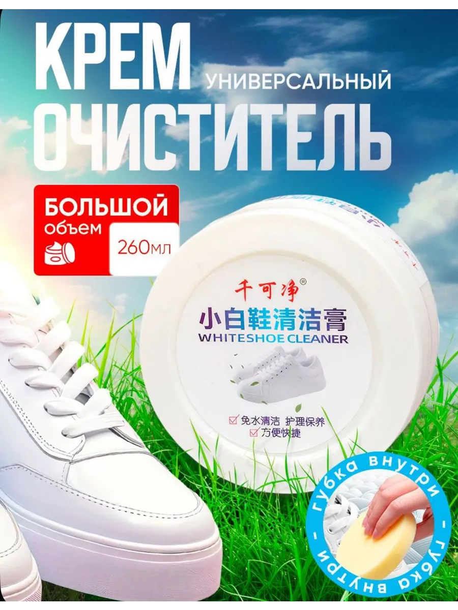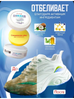 Очищающий бесцветный крем для обуви легко справляется с различными типами загрязнений без использования воды и моющих средств. Это средство идеально подходит для ухода за белыми кроссовками. Очиститель облегчает процесс очищения обуви от грязи без необходимости мыть её под краном. Брызги воды не летят на одежду, и не нужно ждать, когда обувь высохнет. Очищающая паста подходит для обуви из натуральной и искусственной кожи, эффективно чистит белые кроссовки и подошву. Благодаря натуральному составу, крем не портит обувь, не повреждает цвет, не оставляет следов и не наносит вред вашим рукам. Ваша белая обувь будет сиять. Перед нанесением крема, удалите песок и землю с обуви влажной салфеткой. Затем нанесите небольшое количество крема на губку и протрите поверхность. Крем очиститель для кожаной обуви справляется с загрязнениями эффективнее, чем пена или спрей для отбеливания обуви, создавая защитную влагоотталкивающую пленку. Наш крем для белой обуви популярен среди жителей Москвы, Санкт-Петербурга и других регионов. Уход за белой подошвой станет намного проще. Этот белый крем для кроссовок можно использовать не только для очищения обуви, но и для чистки мебели, салона автомобиля, сумок, бытовой техники и других типов поверхностей. Также его можно использовать как защитный бесцветный воск для обуви. Средство не чистит краску, клей, сверхтяжелые масляные пятна и застарелые пятна. Перед использованием крема отбеливателя рекомендуем протестировать его на небольшом невидимом участке изделия.