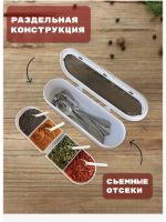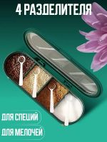 Контейнер для хранений специй-отличный кухонный прибор, помощник для хозяйки, а для дома красивый товар для интерьера. Стильное хранение сыпучих продуктов для вашей кухни. Преимущества органайзера - легко заменит множество банок, правильно организует пространство и подарит порядок и стиль на кухне, дома. Кухонный набор, органайзер для хранения состоит из 4-х отсеков с 4 ложками в комплекте. Ложки позволят правильно дозировать порции специй. Органайзер для специй, набор пластиковый изготовлен из высококачественного и безопасного пластика, не имеет запаха и не меняет вкус продуктов, есть прозрачная удобная крышка. Крышка герметично закрывает специи и создает удобное хранение и функционал. Благодаря вместительности каждой секции контейнера и удобному открыванию диспенсера, ускорит процесс готовки. Контейнер с разделителями очень удобен ещё и тем, что отсеки легко вынимаются и очищаются. Емкость можно использовать как для специй, для хранения сыпучих продуктов, так и в качестве солонки, сахарницы, перечницы, а также для хранения чая/кофе и много другого. Цвет приходит рандомно.