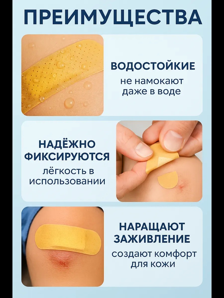 Медицинский пластырь — обязательный элемент каждой домашней аптечки. Этот универсальный набор из 100 гипоаллергенных пластырей включает 4 вида, обеспечивая защиту от порезов, ссадин, мозолей и других мелких повреждений кожи. Пластыри изготовлены из мягкого, дышащего материала, который бережно прилегает к коже, не вызывает раздражения и обеспечивает комфорт даже при длительном ношении. Клейкий слой надёжно фиксирует пластырь, предотвращая его смещение и защищая рану от попадания пыли, грязи и бактерий. Благодаря разнообразным формам и размерам, вы легко подберёте подходящий вариант под любой тип ранения — будь то палец, колено или другая часть тела.