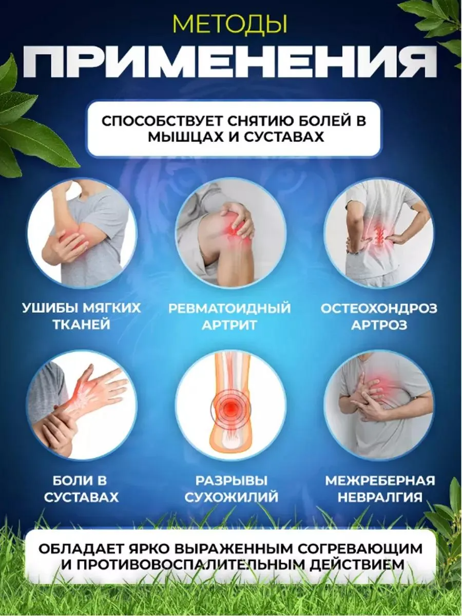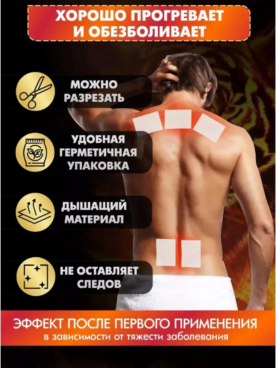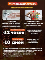 Тигровый пластырь - это необычное целебное средство, которое поможет вам справиться с болями в спине, мышцах и суставах. Пластырь содержит только натуральные лечебные компоненты - они полностью безопасны для здоровья и обеспечат благотворное влияние на организм без раздражения и дискомфорта. В составе содержится азиатская центелла, которая улучшает упругость и увлажняет кожу, а также улучшает микроциркуляцию крови. Масла мяты и корицы обеспечивают антибактериальное и спазмолитическое действие, а хондроитин отвечает за увлажнение суставов и связок, восстанавливает хрящевую ткань и защищает ее от разрушения. Клубни аконита имеют противовоспалительное и обезболивающее свойство, а камфора является природным антисептиком. Пластырь станет отличной альтернативой мази и поможет вам при остеохондрозе, артрозе и простуде. Наклеивать его можно на шею, ноги и руки, поясницу, а при необходимости можно разрезать средство на части и приклеить сразу на несколько зон. Набор для оздоровления подойдет людям в период реабилитации, после спортивных упражнений или в качестве профилактики. Позаботьтесь о здоровом теле уже сегодня - попробуйте наш согревающий тигровый пластырь и наслаждайтесь благом восточной медицины!