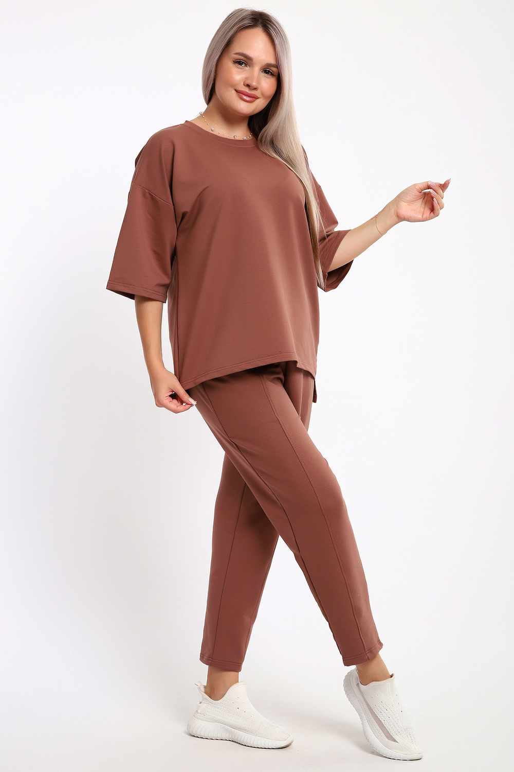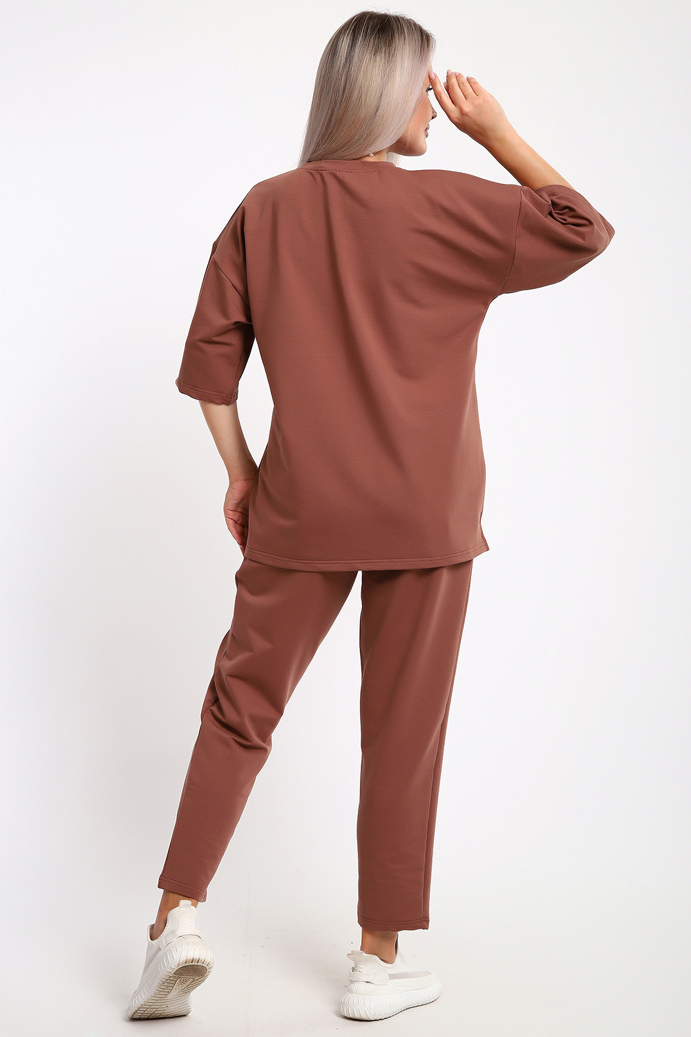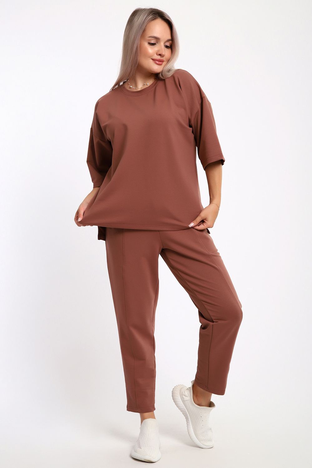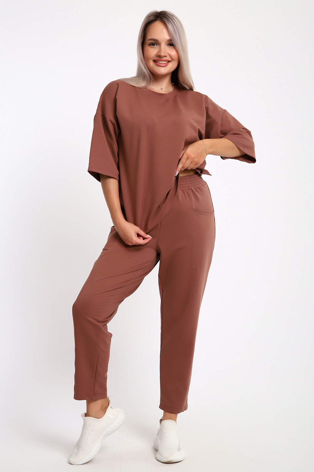 Этот женский костюм в благородном шоколадном оттенке — идеальное сочетание комфорта и современного стиля. Благодаря продуманному составу ткани и свободному крою, он станет незаменимой базой для повседневного гардероба. Описание фасона: Верх (Кофта): Крой: Свободный силуэт (oversize-эффект), который мягко скрывает нюансы фигуры и не стесняет движений. Рукав: Укороченный, что придает образу легкость и позволяет демонстрировать аксессуары на запястьях. Горловина: Аккуратная обработка, обеспечивающая комфортную посадку. Низ (Брюки): Стиль: Комфортные брюки свободного кроя. Детали: Оснащены глубокими и функциональными карманами. Посадка: Эластичный пояс обеспечивает надежную фиксацию на талии без лишнего давления.