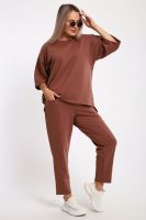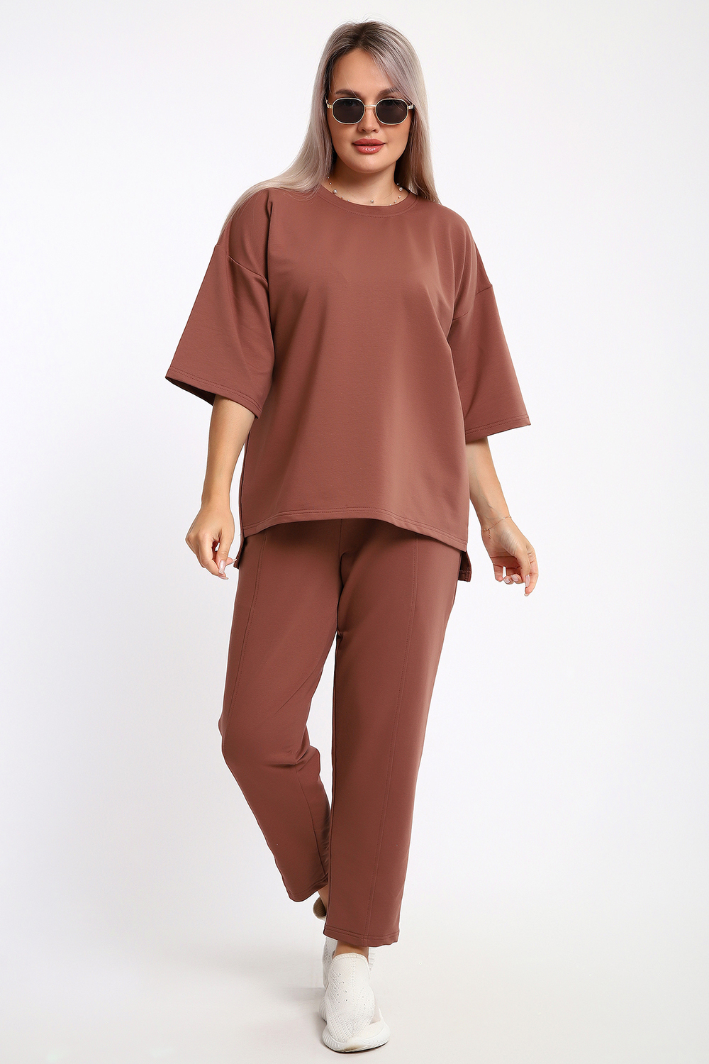 Этот женский костюм в благородном шоколадном оттенке — идеальное сочетание комфорта и современного стиля. Благодаря продуманному составу ткани и свободному крою, он станет незаменимой базой для повседневного гардероба. Описание фасона: Верх (Кофта): Крой: Свободный силуэт (oversize-эффект), который мягко скрывает нюансы фигуры и не стесняет движений. Рукав: Укороченный, что придает образу легкость и позволяет демонстрировать аксессуары на запястьях. Горловина: Аккуратная обработка, обеспечивающая комфортную посадку. Низ (Брюки): Стиль: Комфортные брюки свободного кроя. Детали: Оснащены глубокими и функциональными карманами. Посадка: Эластичный пояс обеспечивает надежную фиксацию на талии без лишнего давления.