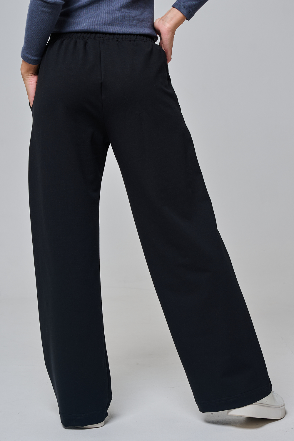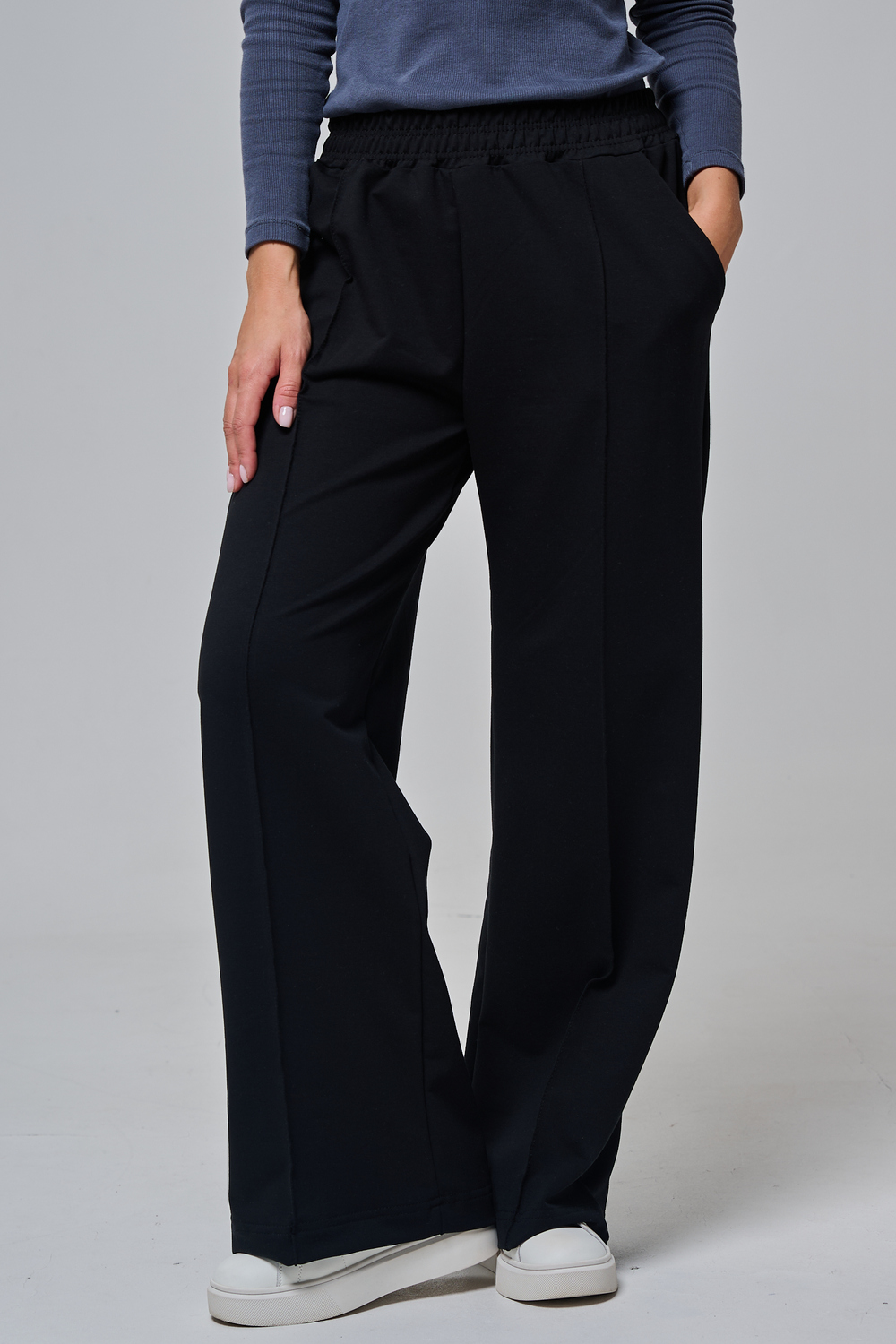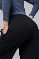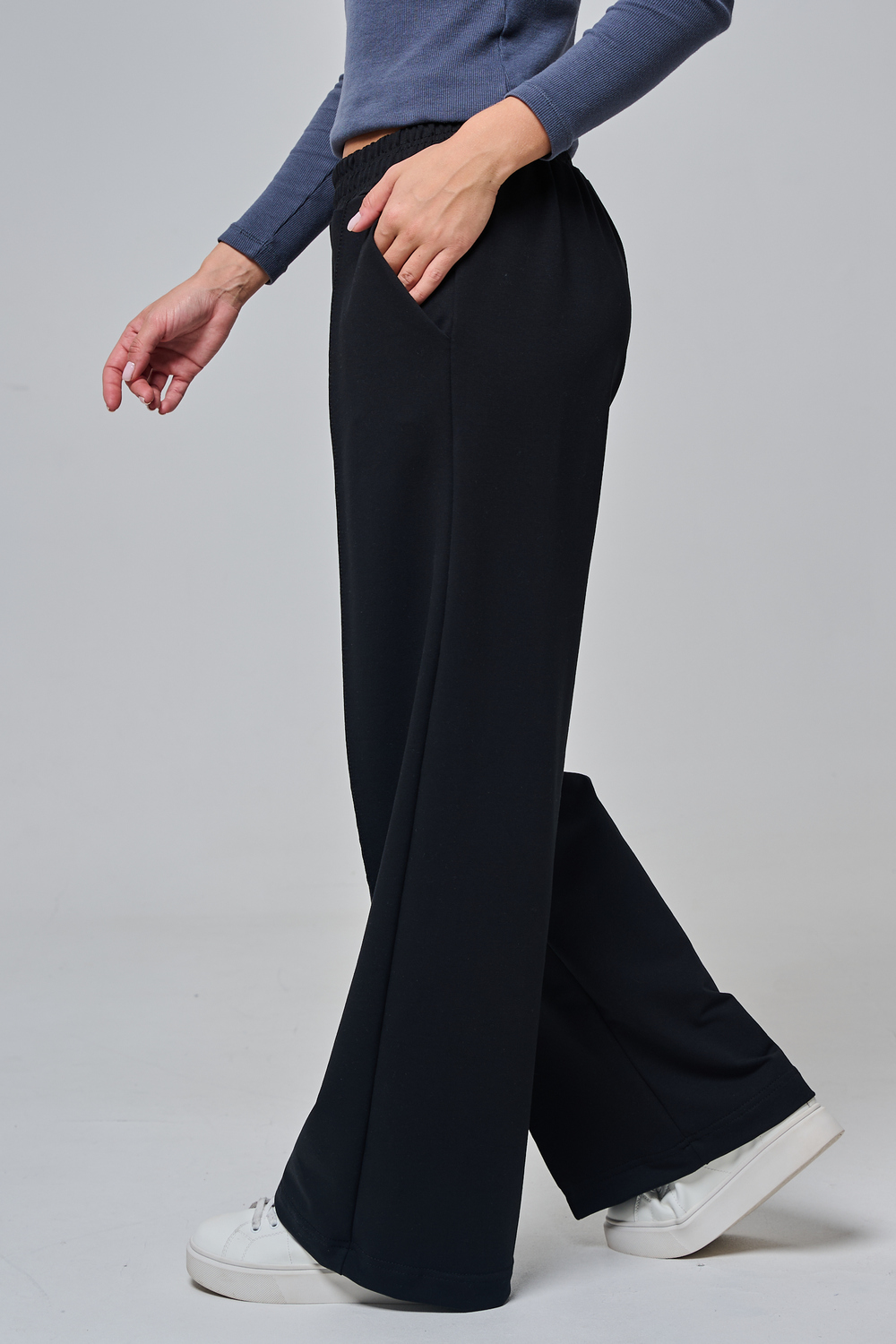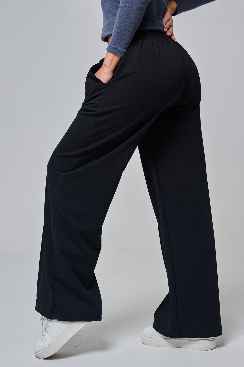Эти элегантные широкие брюки "Urban Flow" — идеальный выбор для современного городского стиля, сочетающего комфорт и утонченность. Выполненные в классическом черном цвете, они созданы из мягкой, эластичной ткани (смесь хлопка и эластана), которая обеспечивает свободу движений и приятное ощущение на коже, словно вторая кожа. Дизайн подчеркивает женственность: высокая посадка с удобным эластичным поясом на шнуровке позволяет легко регулировать посадку, а объемные, струящиеся штанины от бедра до щиколотки создают эффектный силуэт, визуально удлиняющий ноги. Практичные боковые карманы добавляют функциональности, не нарушая минималистичный вид. Брюки "Urban Flow" универсальны: сочетайте их с облегающим топом и кроссовками для casual-образа или с блузкой и туфлями на каблуке для офисного шика.