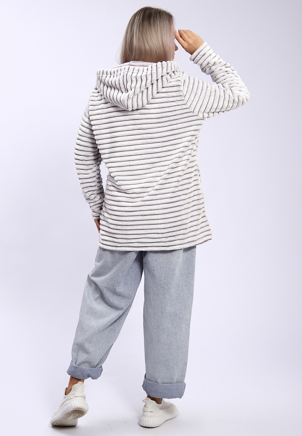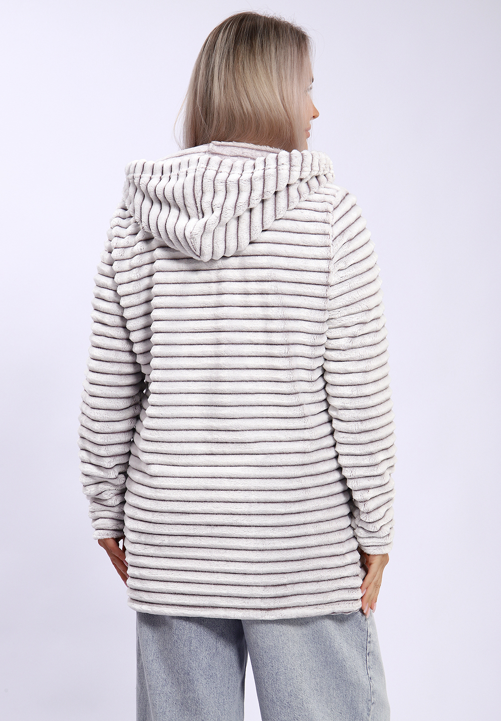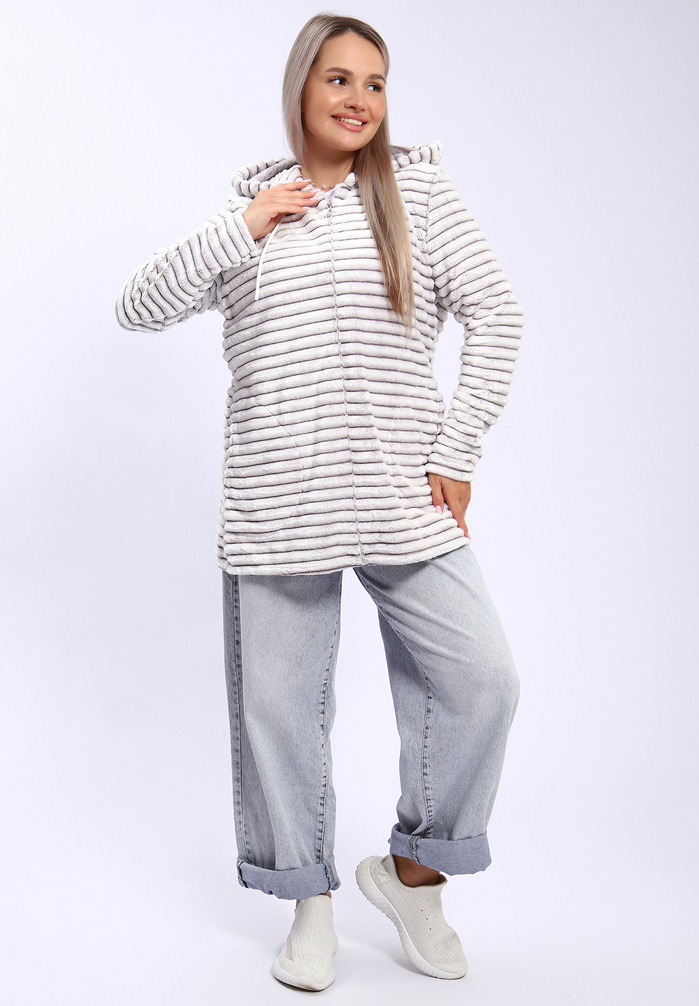 Толстовка с капюшоном на молнии и двумя карманами выполнена из мягкого и теплого велсофта, похожего на шиншиллу. Удлиненная модель обеспечивает дополнительное тепло и комфорт, идеально подходит для холодных дней. Мягкая текстура и приятное ощущение на ощупь делают эту толстовку стильным и уютным элементом гардероба.