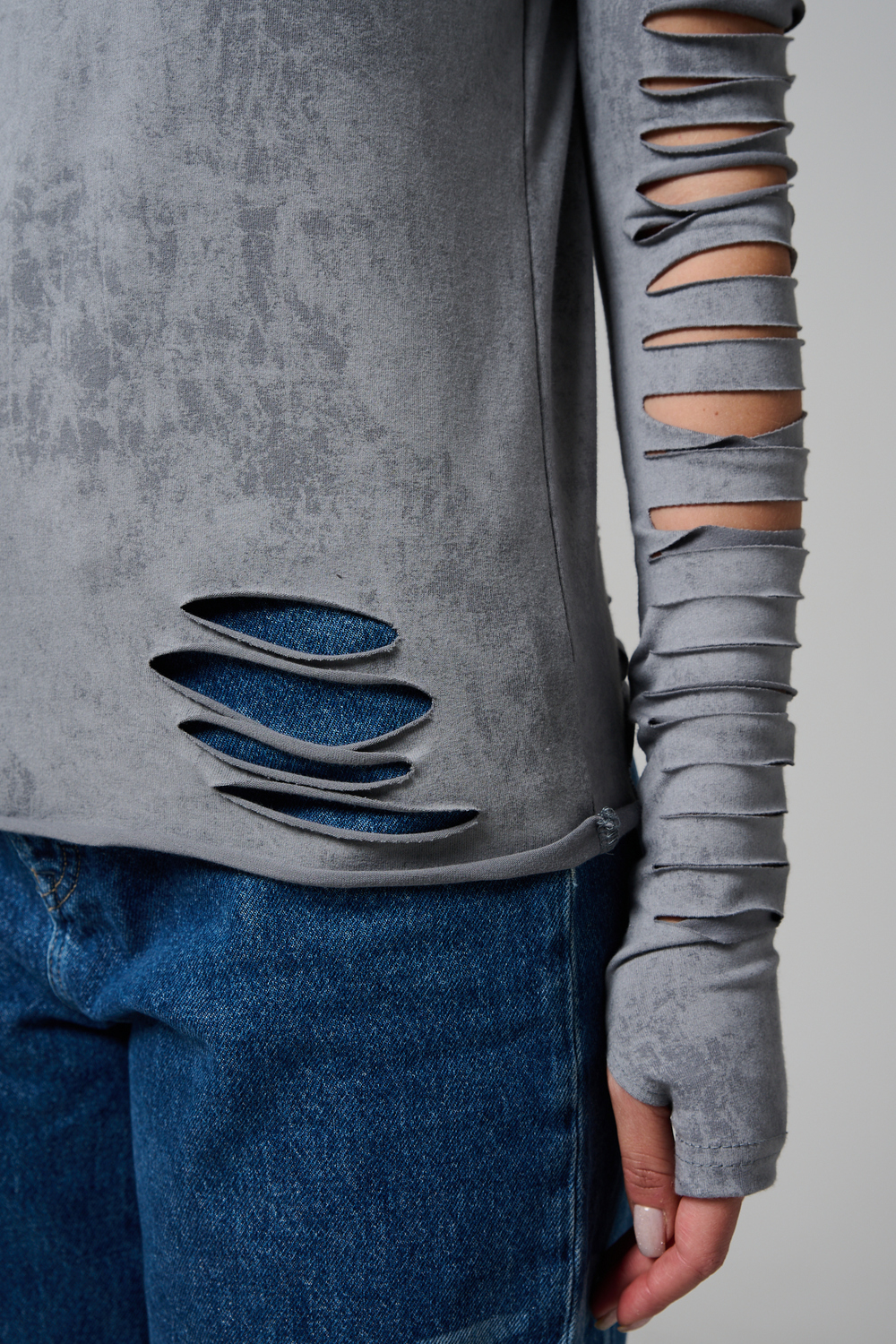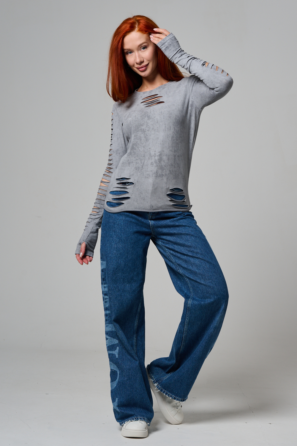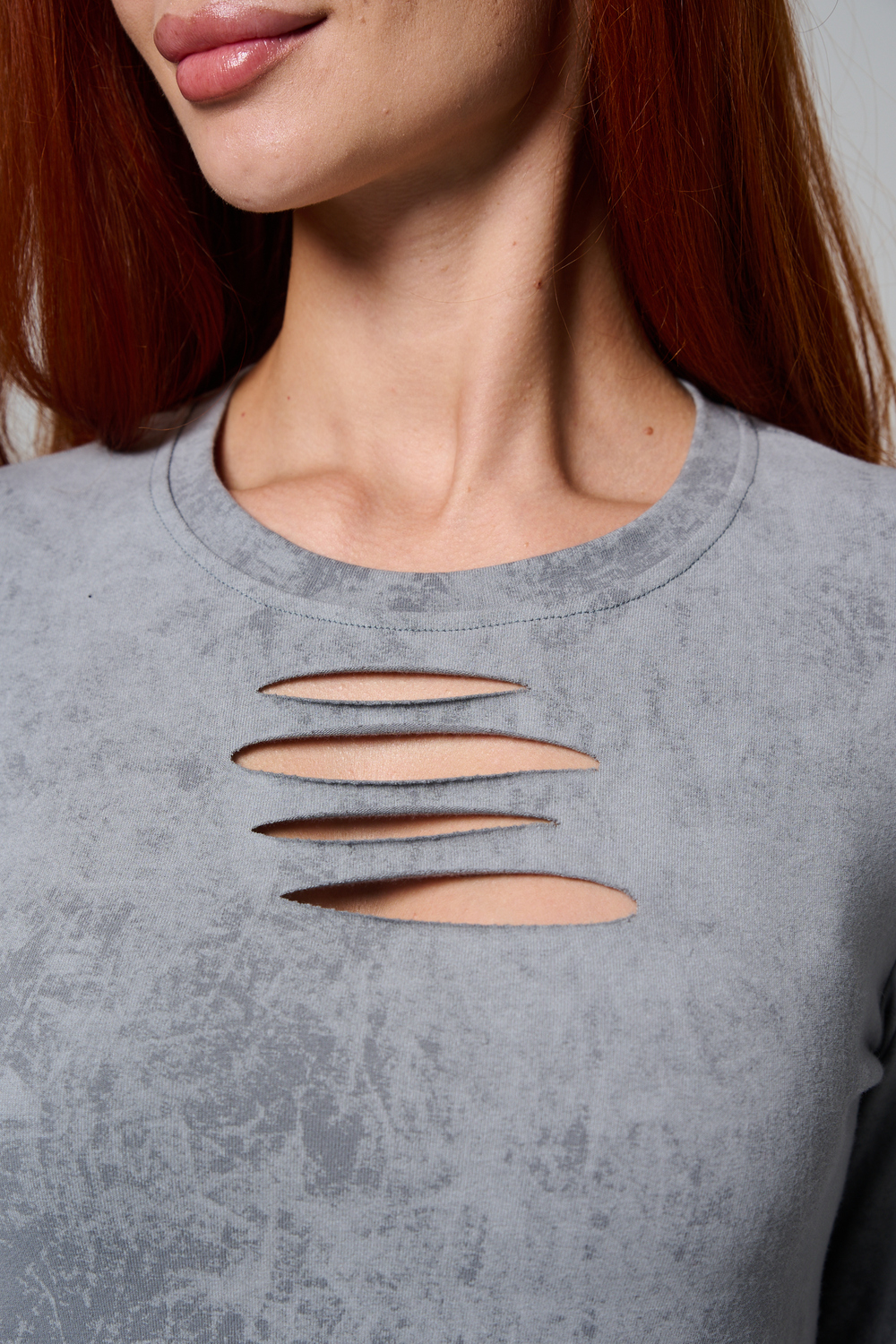 Женский лонгслив с длинными рукавами с из качественного хлопкового трикотажа. Необычный дизайнерский лонгслив с декоративным разрезами станет ярким дополнением к Вашему образу.