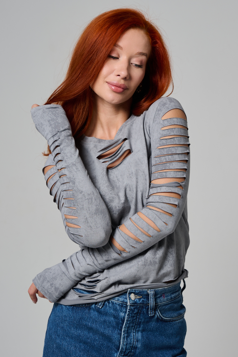 Женский лонгслив с длинными рукавами с из качественного хлопкового трикотажа. Необычный дизайнерский лонгслив с декоративным разрезами станет ярким дополнением к Вашему образу.