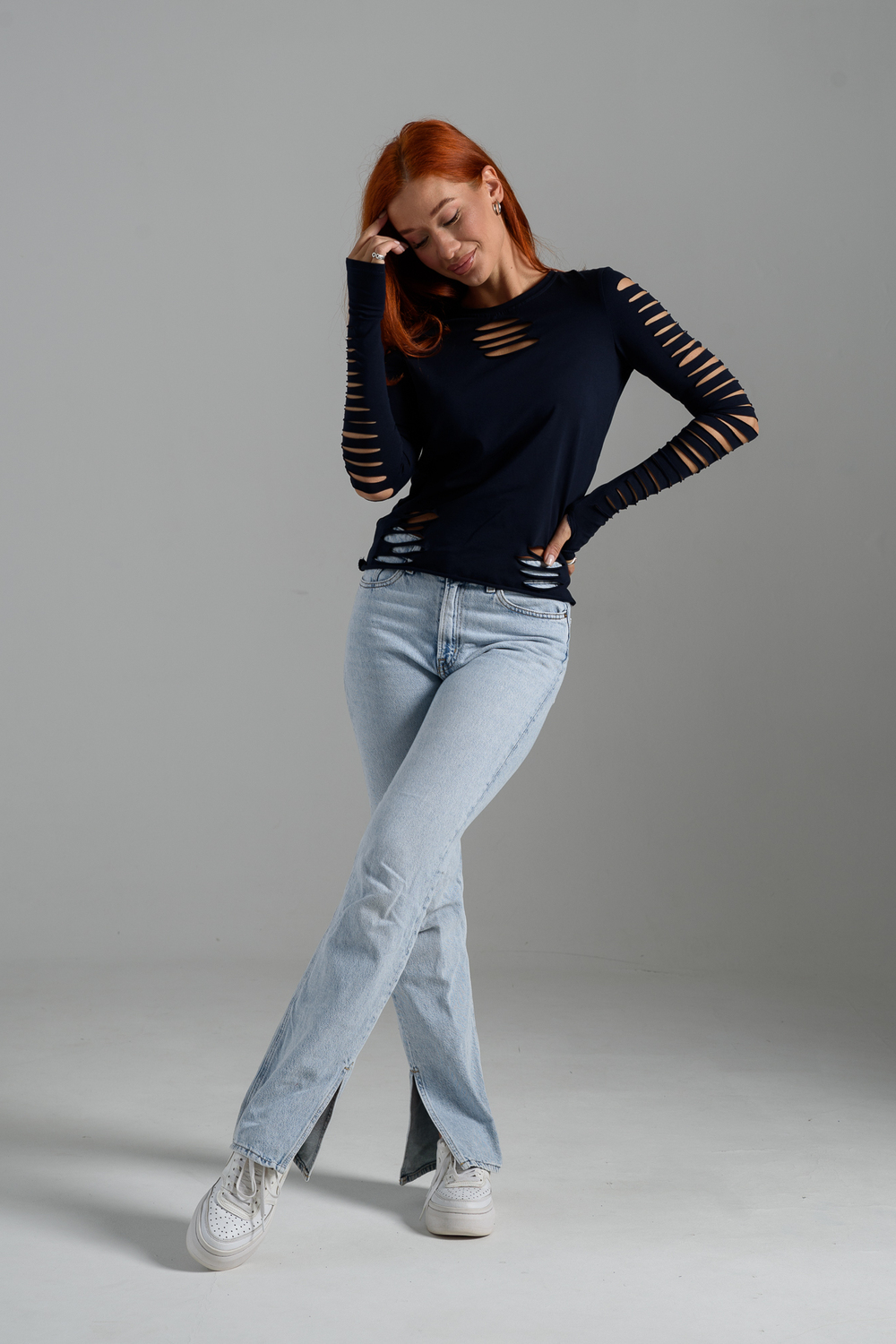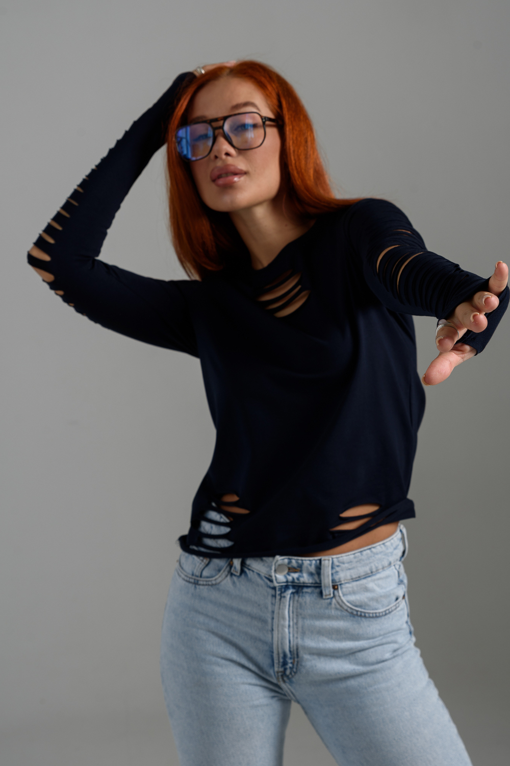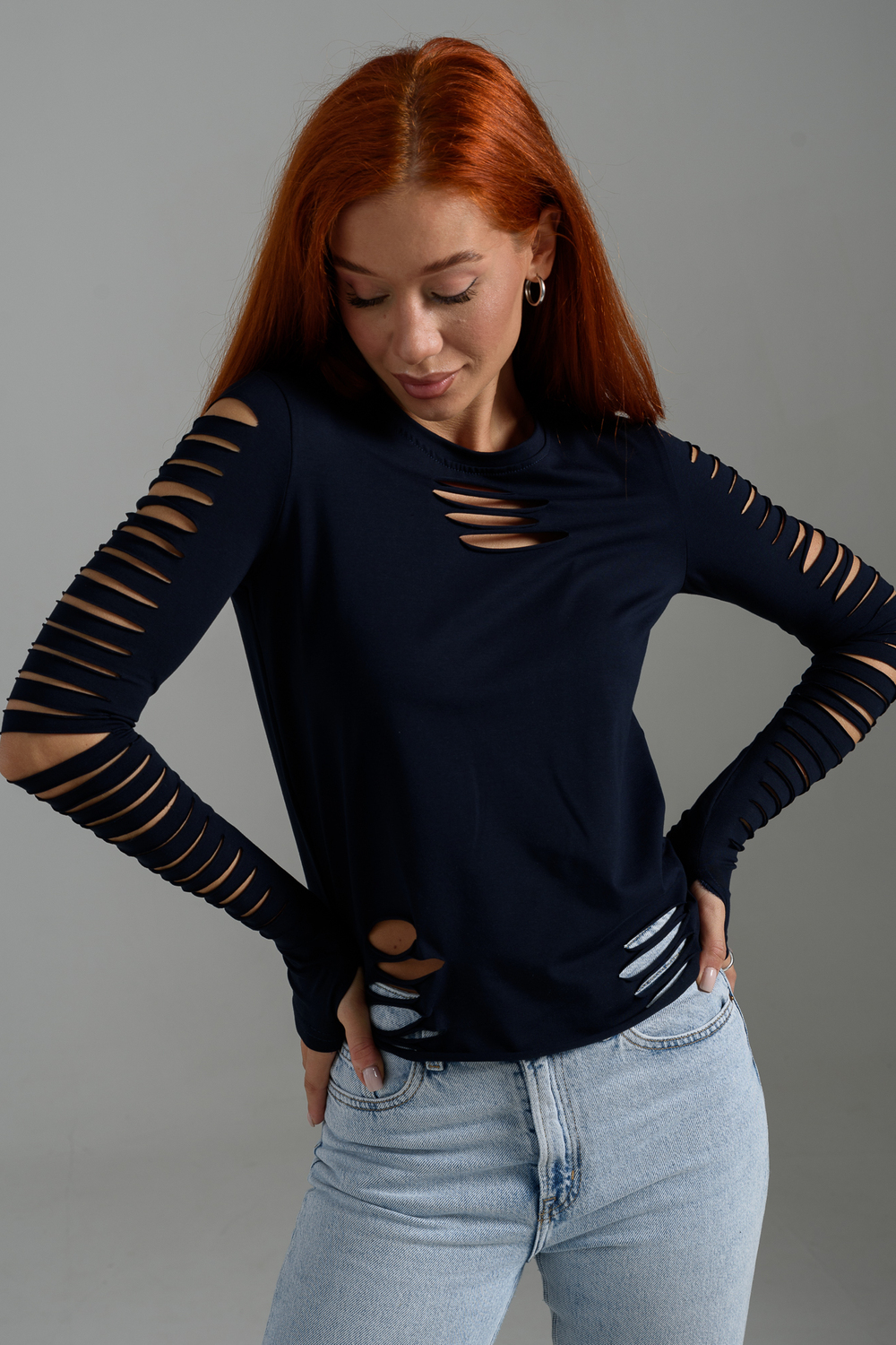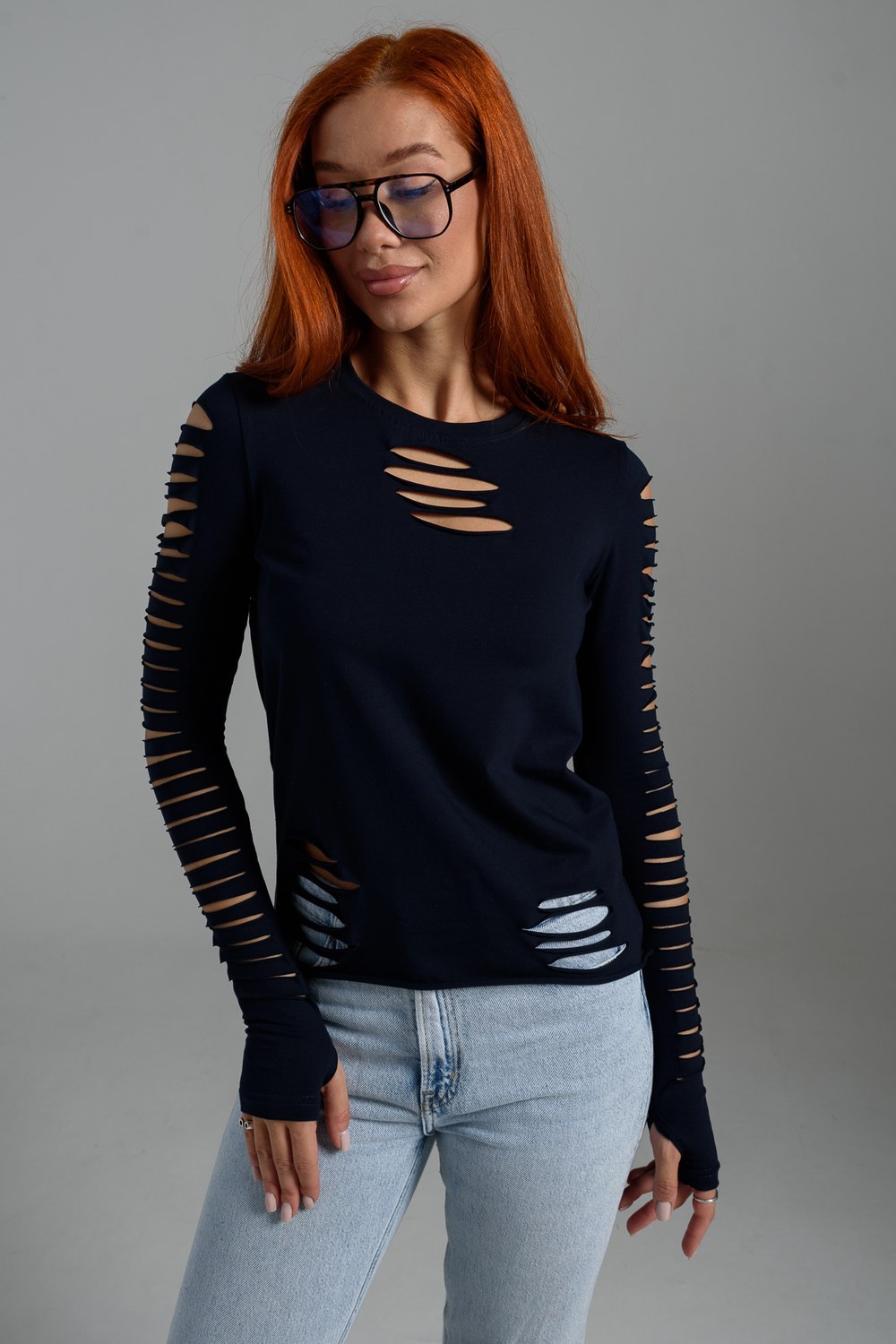Женский лонгслив с длинными рукавами с из качественного хлопкового трикотажа. Необычный дизайнерский лонгслив с декоративным разрезами станет ярким дополнением к Вашему образу.