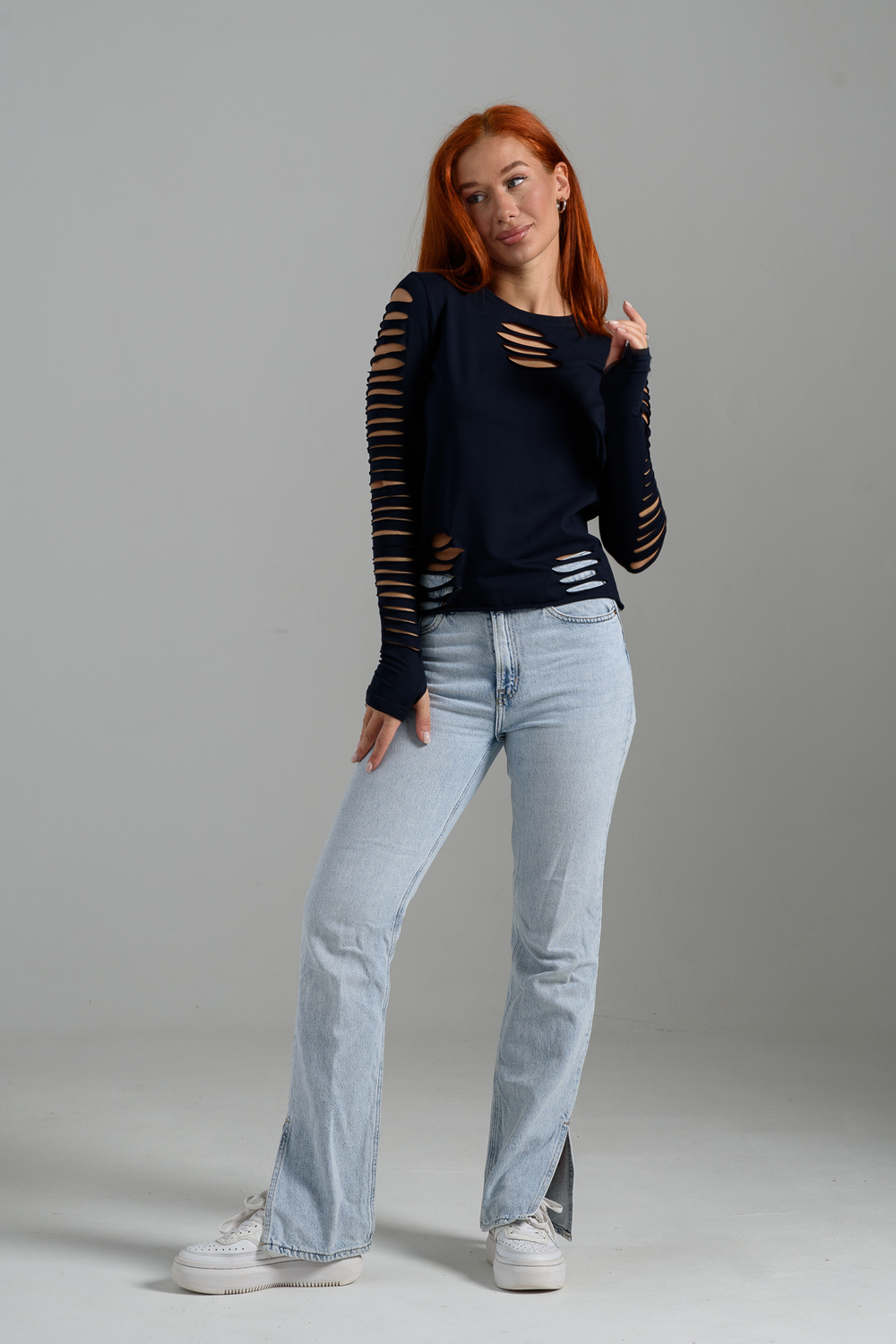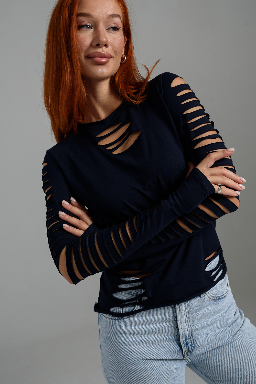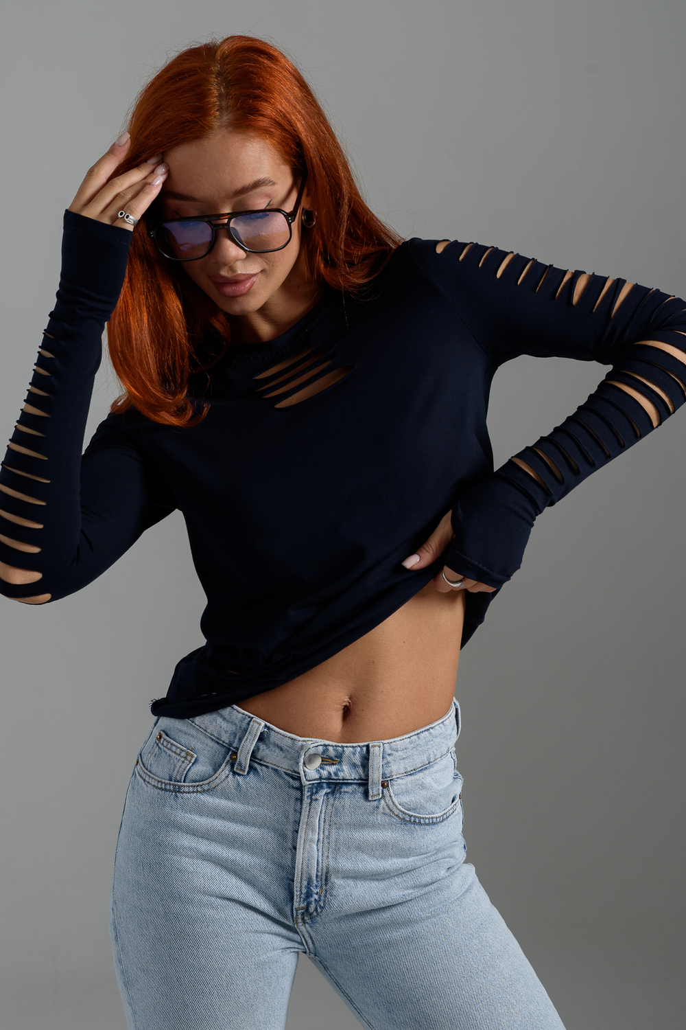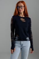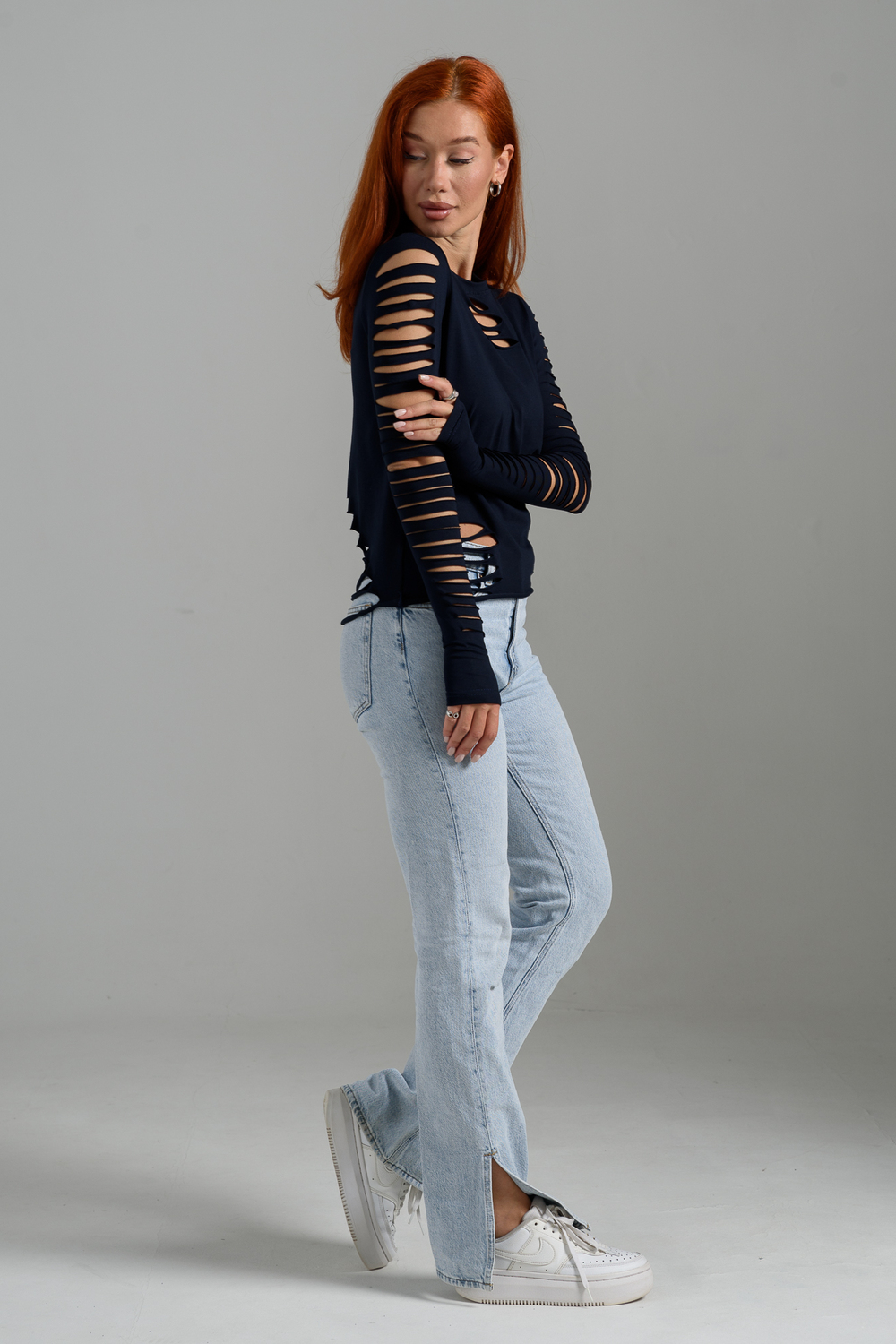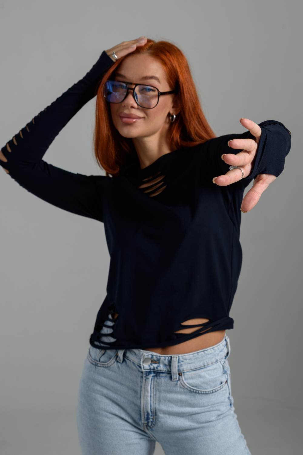 Женский лонгслив с длинными рукавами с из качественного хлопкового трикотажа. Необычный дизайнерский лонгслив с декоративным разрезами станет ярким дополнением к Вашему образу.