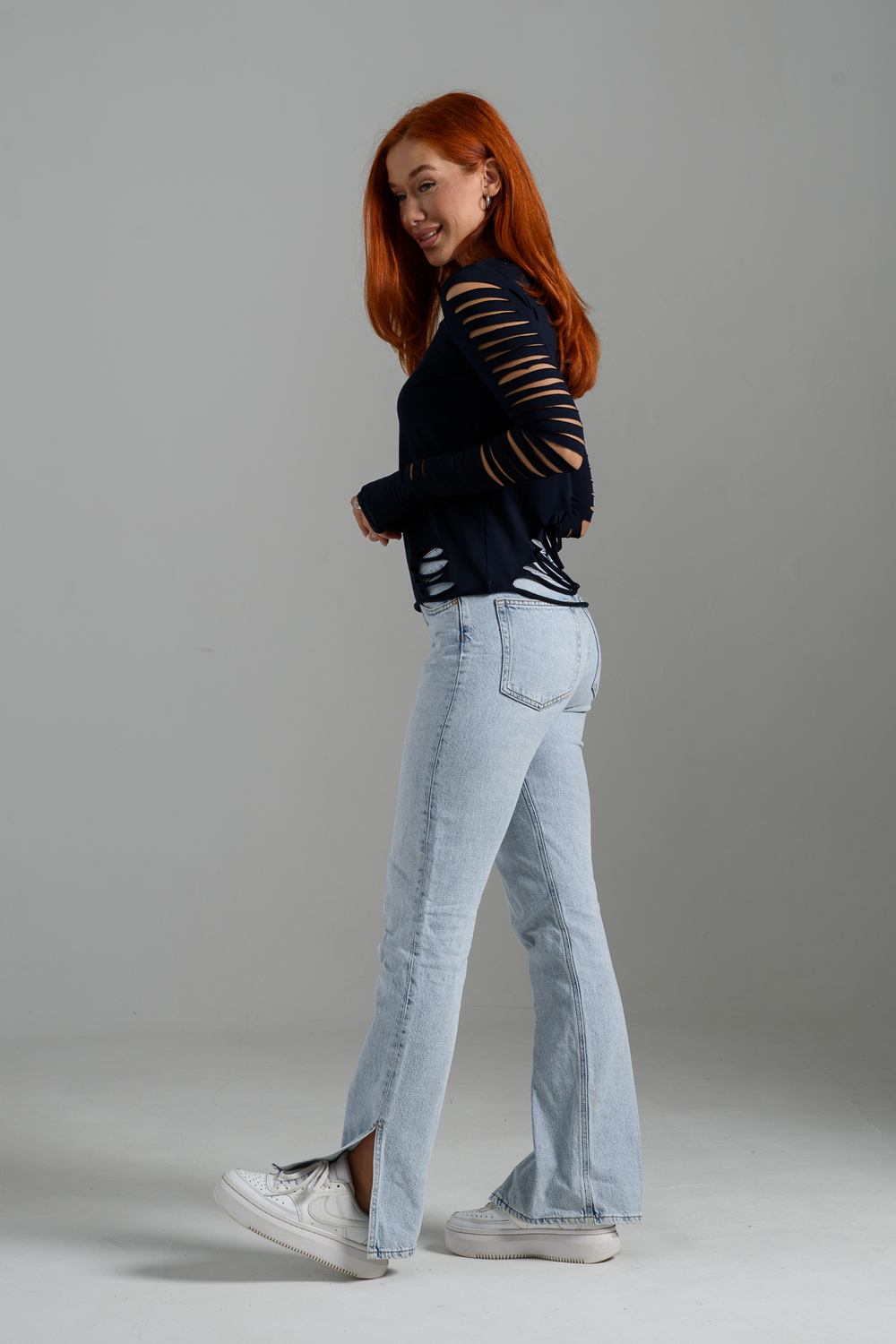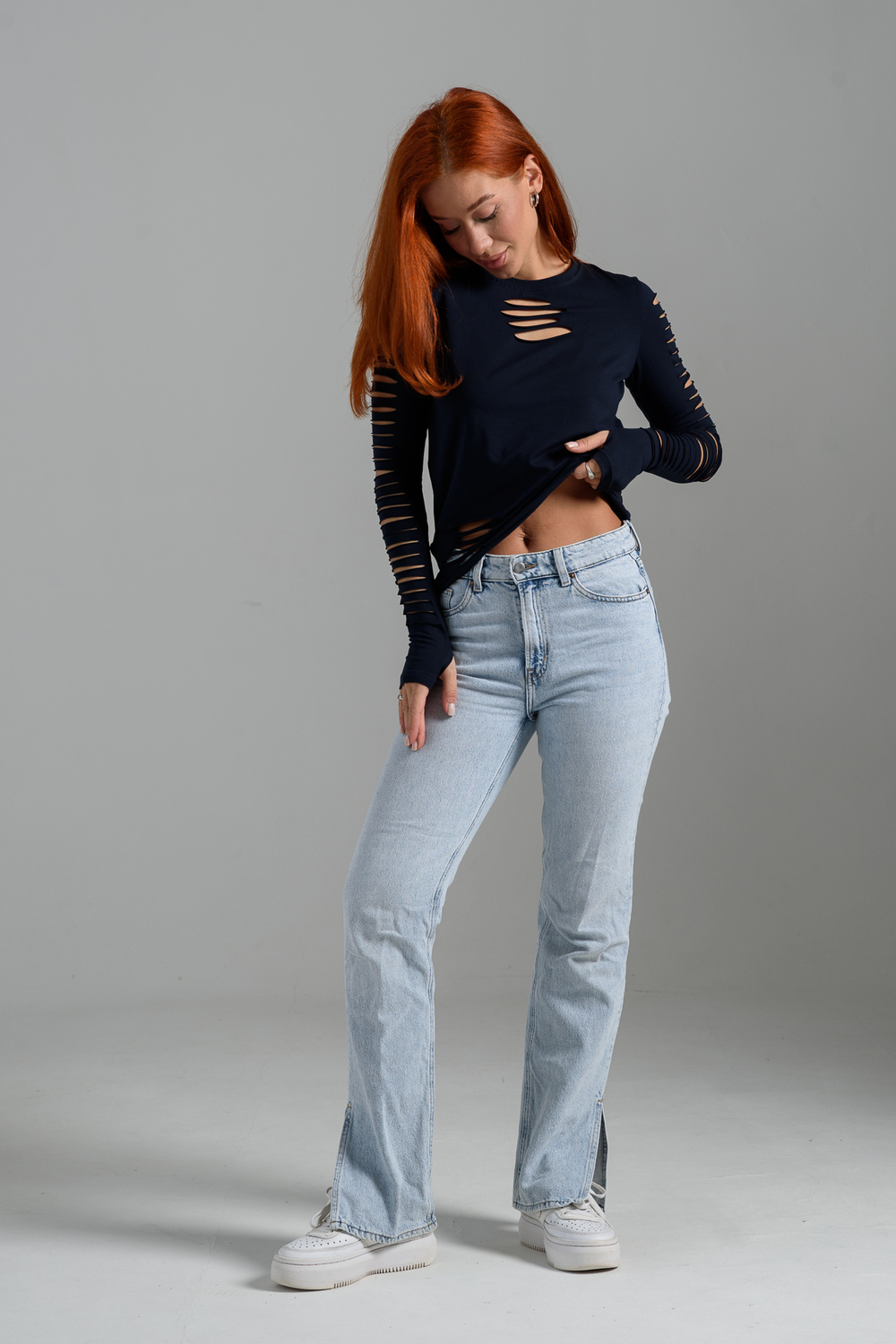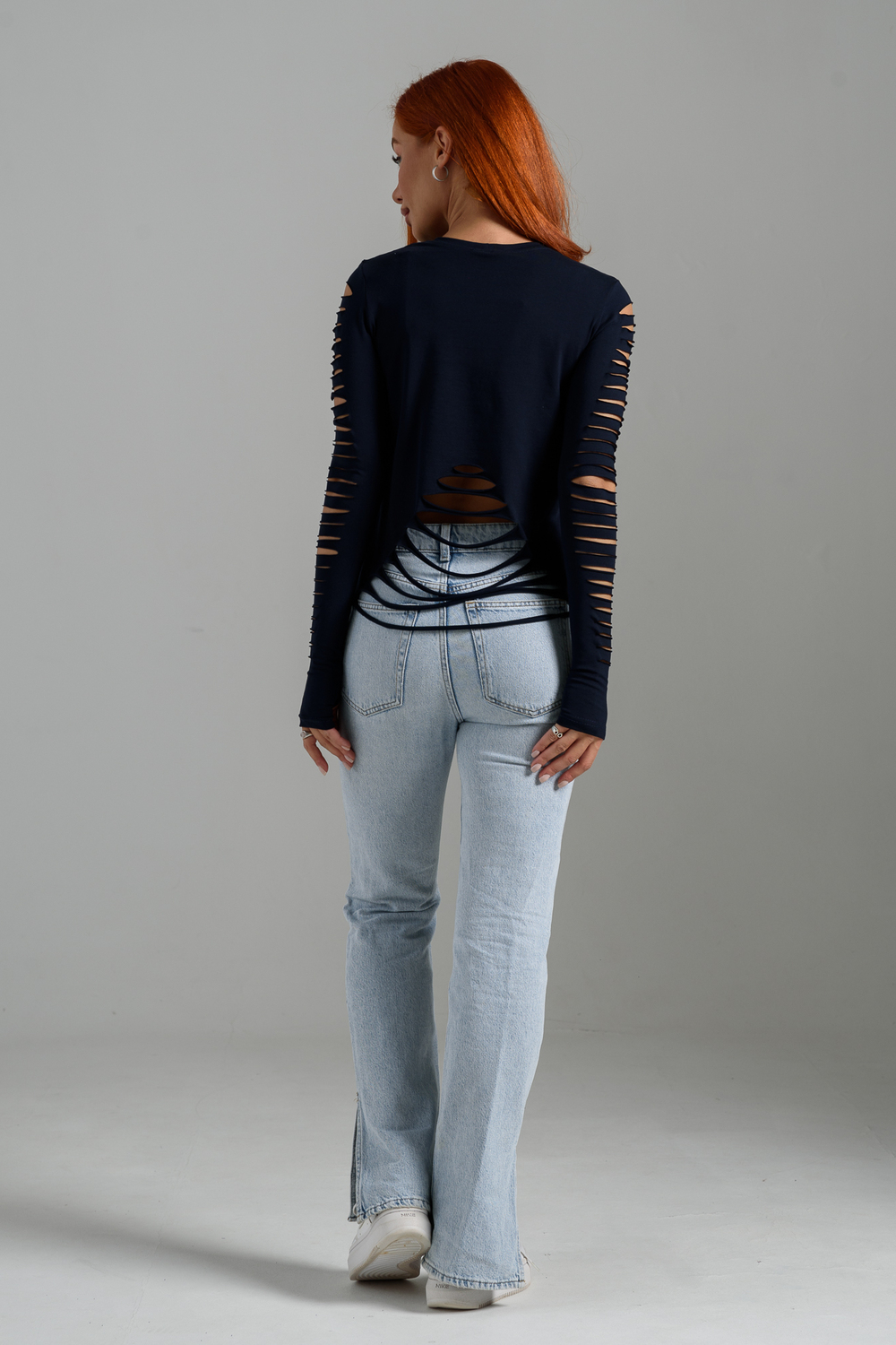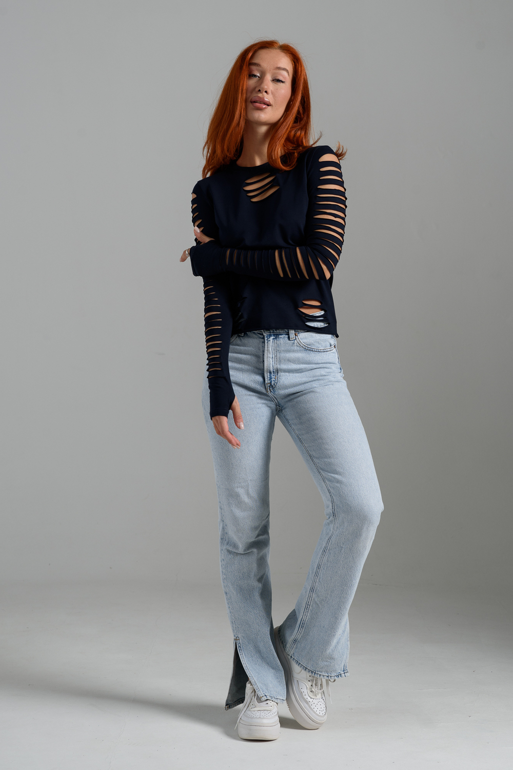 Женский лонгслив с длинными рукавами с из качественного хлопкового трикотажа. Необычный дизайнерский лонгслив с декоративным разрезами станет ярким дополнением к Вашему образу.