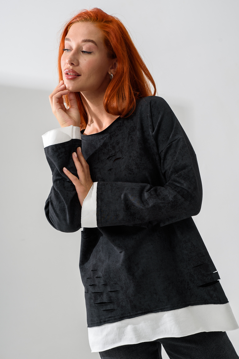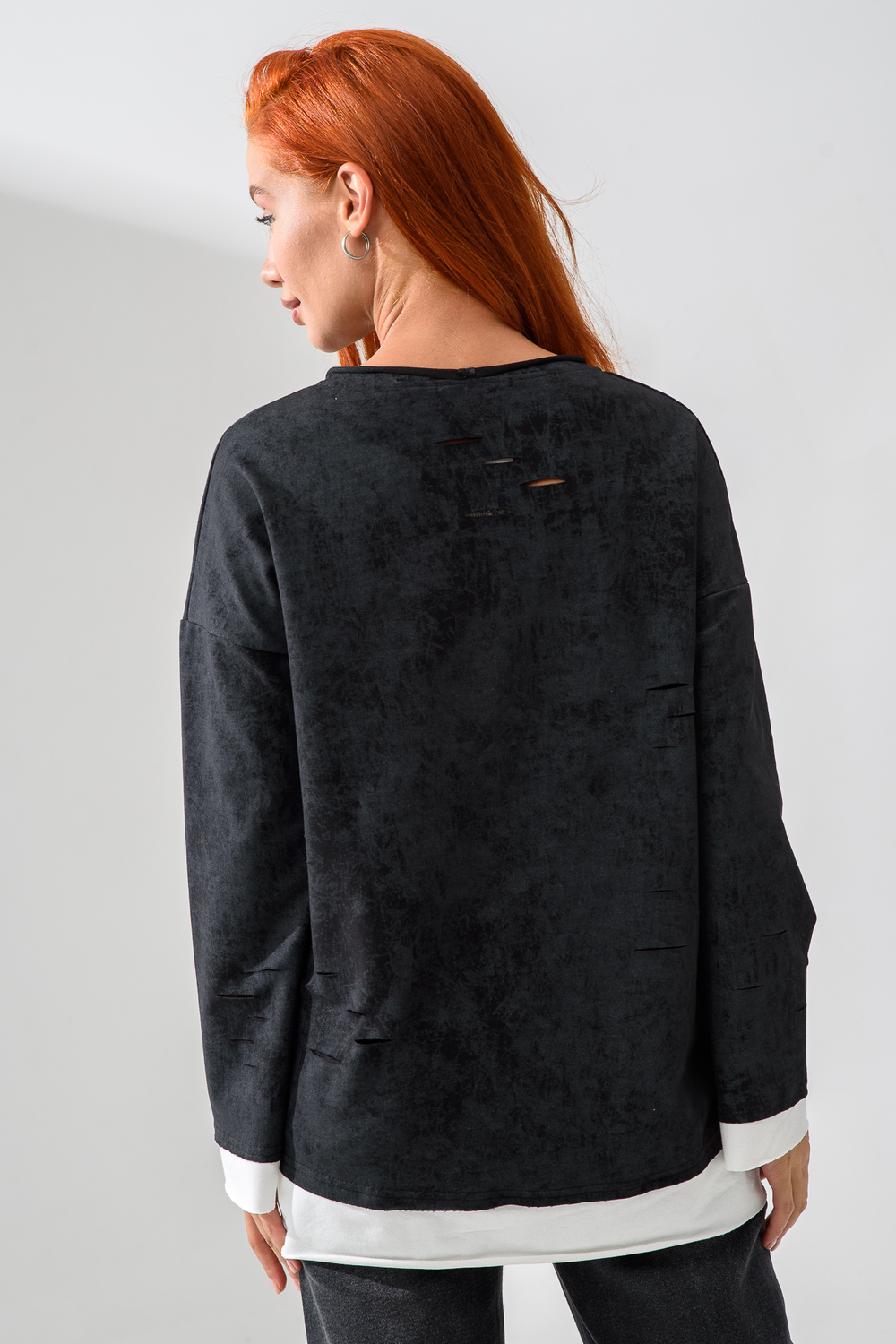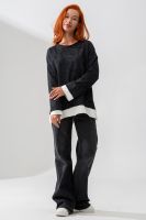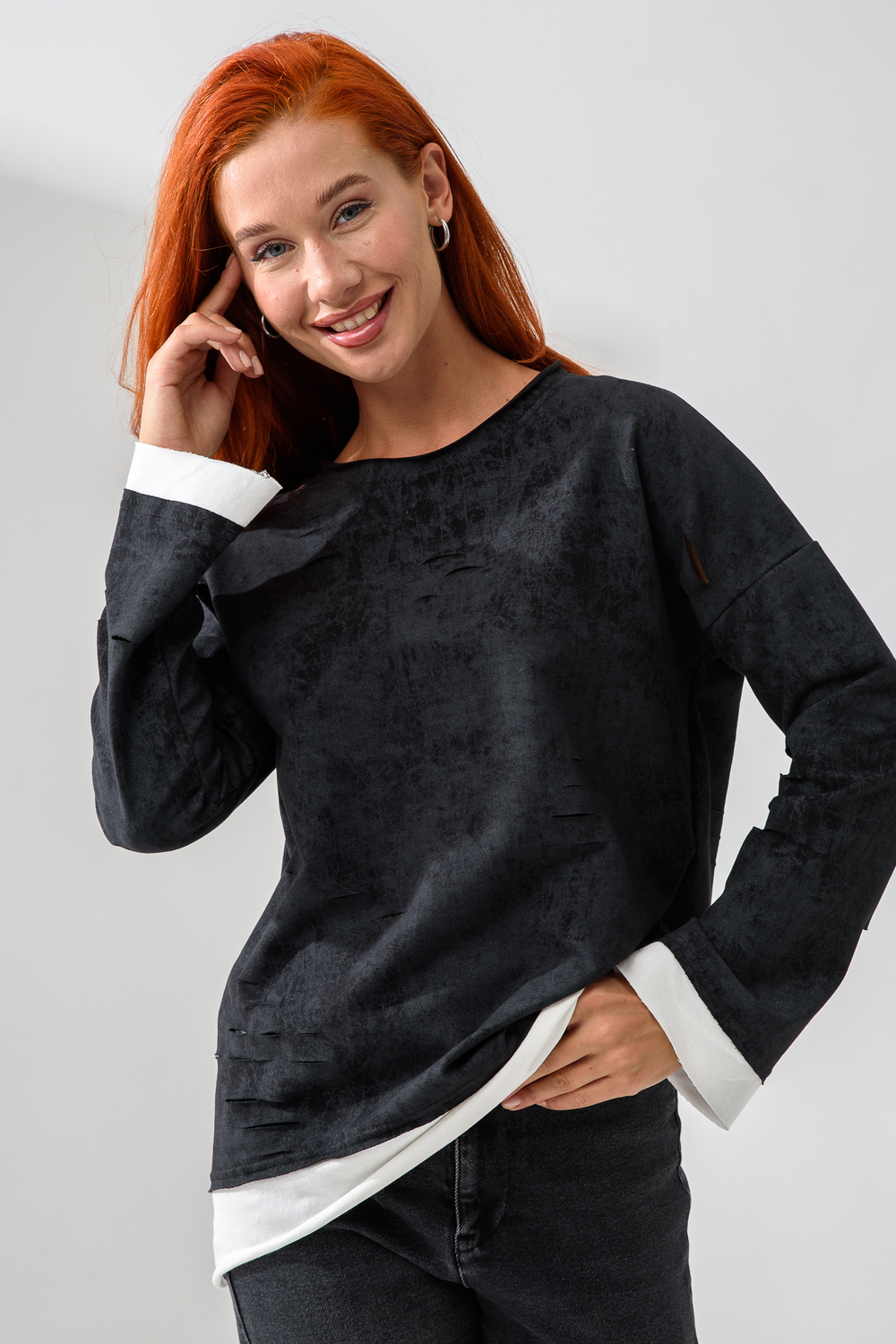 Женский лонгслив свободного кроя - эксклюзивная разработка с эффектом второго слоя. Очень современный дизайн! Особое внимание уделено деталям: необработанная горловина, края рукавов и низа, эффект многослойности придает изделию современный минимализм.