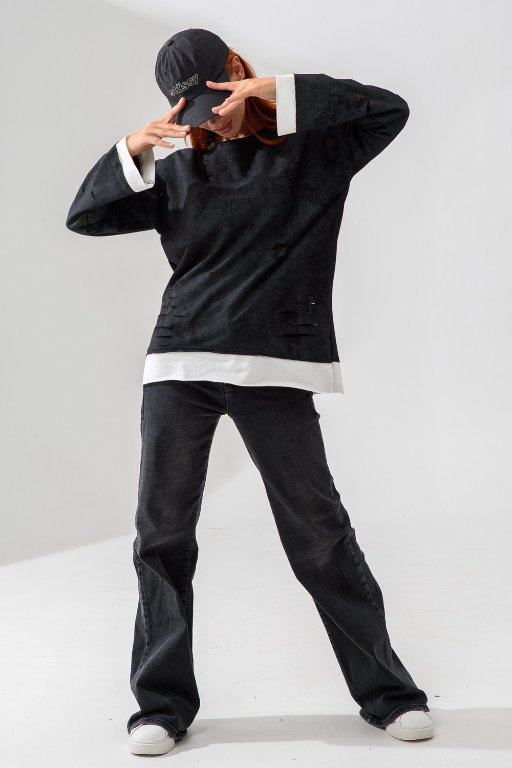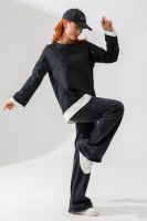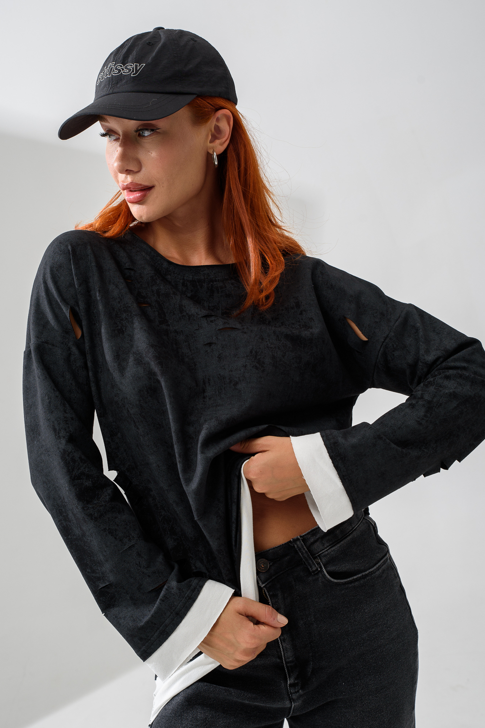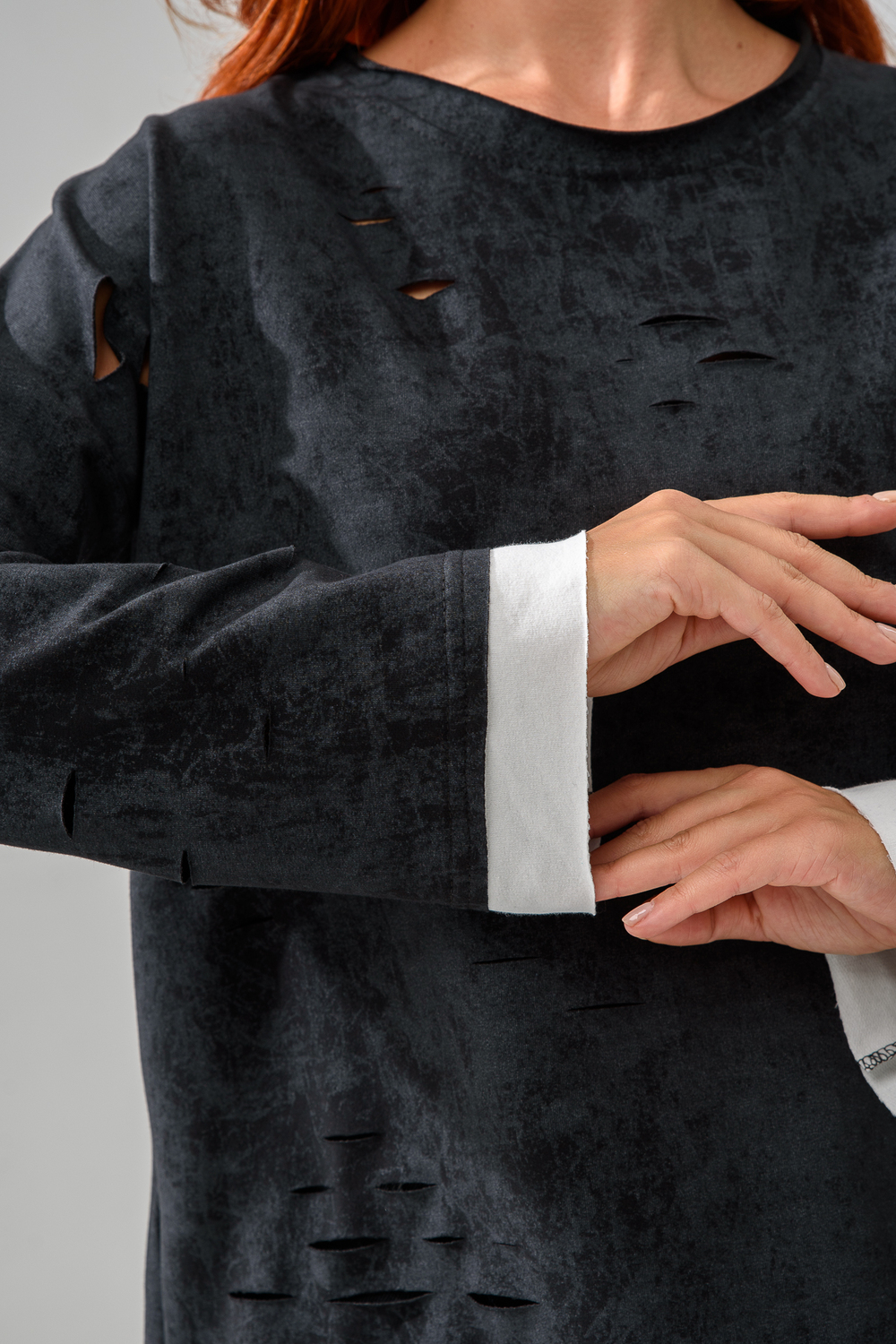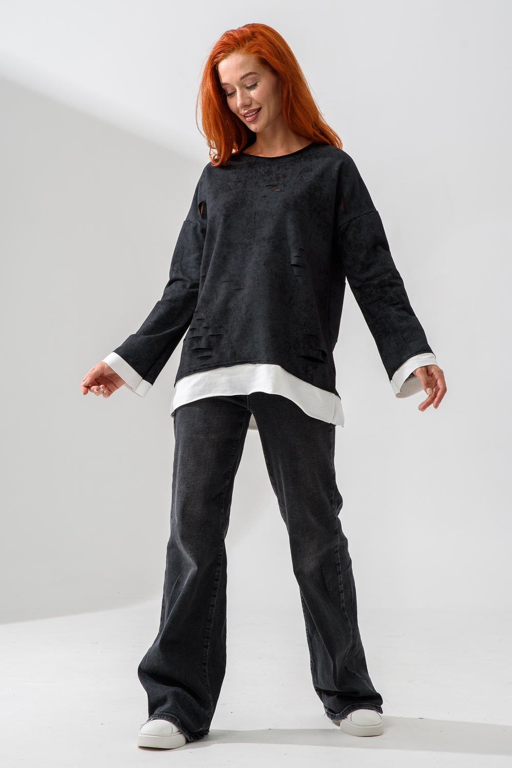 Женский лонгслив свободного кроя - эксклюзивная разработка с эффектом второго слоя. Очень современный дизайн! Особое внимание уделено деталям: необработанная горловина, края рукавов и низа, эффект многослойности придает изделию современный минимализм.