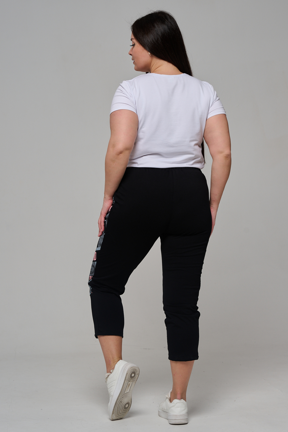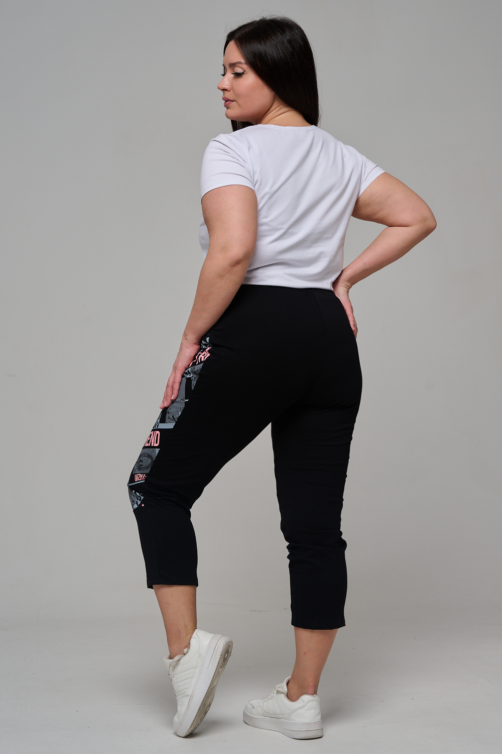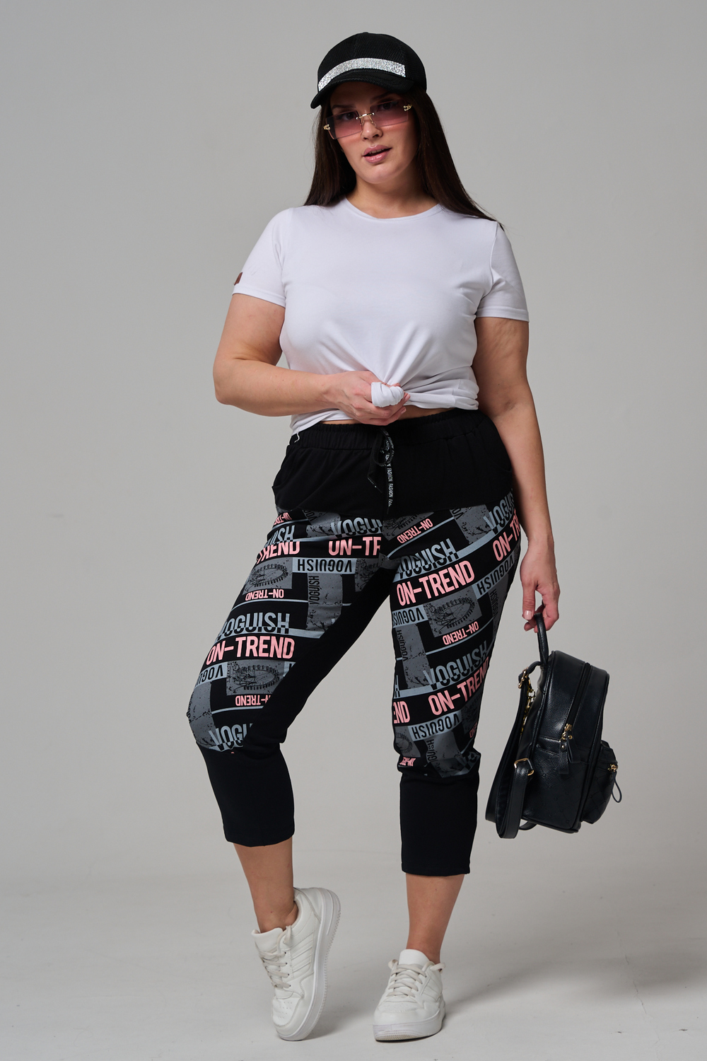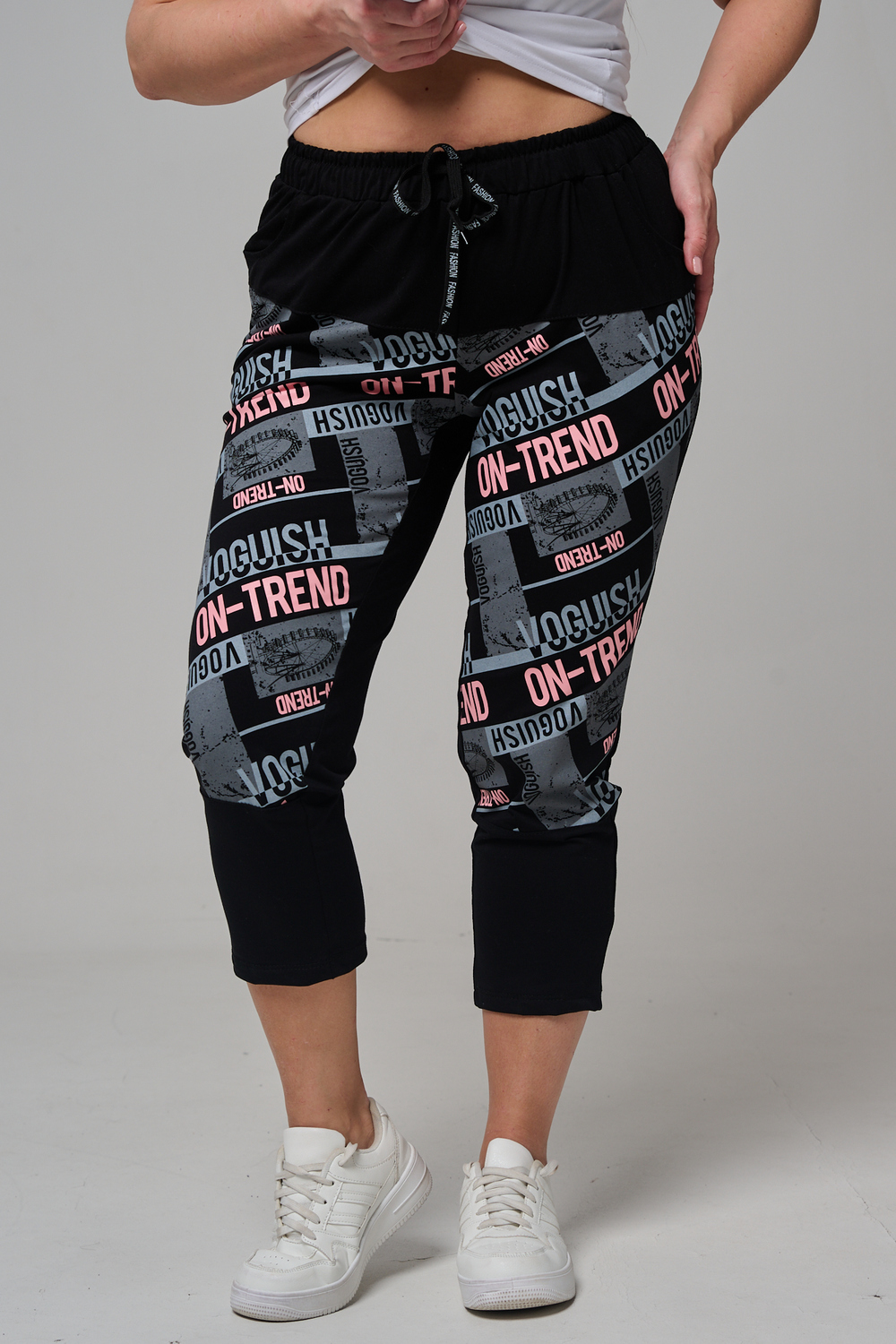 Брюки женские, свободные по бедрам, зауженные к низу. Спереди внутренние карманы, пояс эластичный со шнуром. На передних половинках брюк принт. Идеальны для повседневной носки.