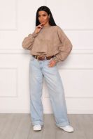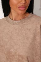 Свитшот женский сложного кроя, из трикотажного полотна с напылением, которое создает эффект стиля винтаж. Свитшот свободного облегания, рукав летучая мышь, на манжете. Горловина круглой формы, обработана обтачкой. Низ изделия на регулируемой кулисе со шнуром. Манжеты и обтачка горловины выполнены из кашкорсе в цвет основной ткани.