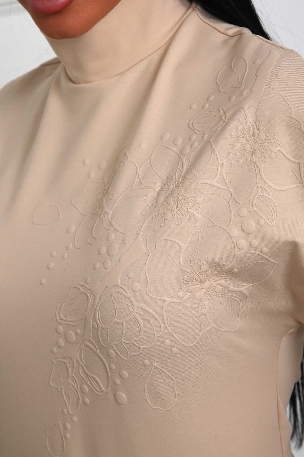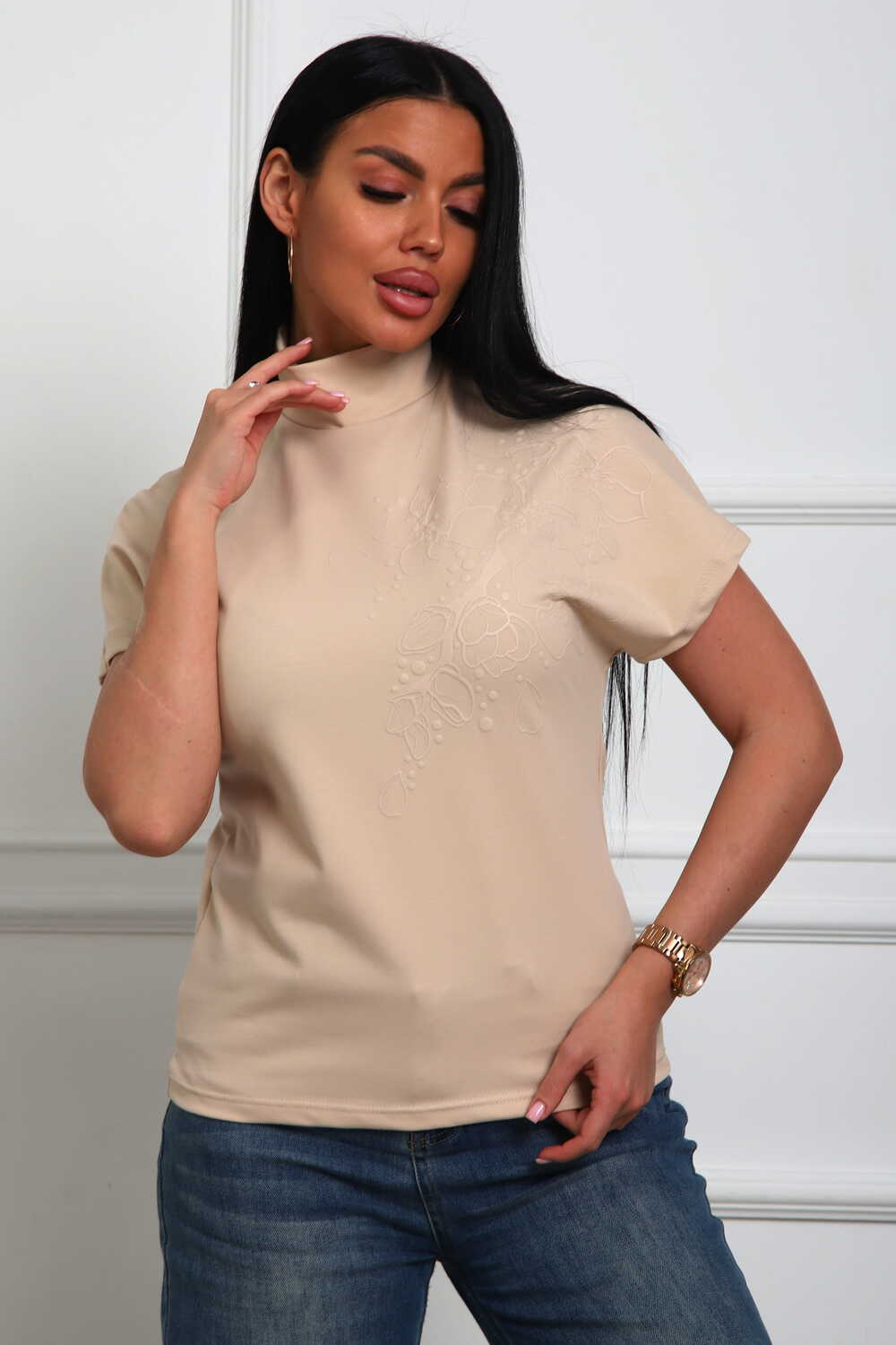 Блуза женская из трикотажного полотна. Силуэт полуприлегающий. Без рукава. Линия плечь спущенна. Воротник стойка. Низ изделия прямой. На полочке цветочный принт, пуф.