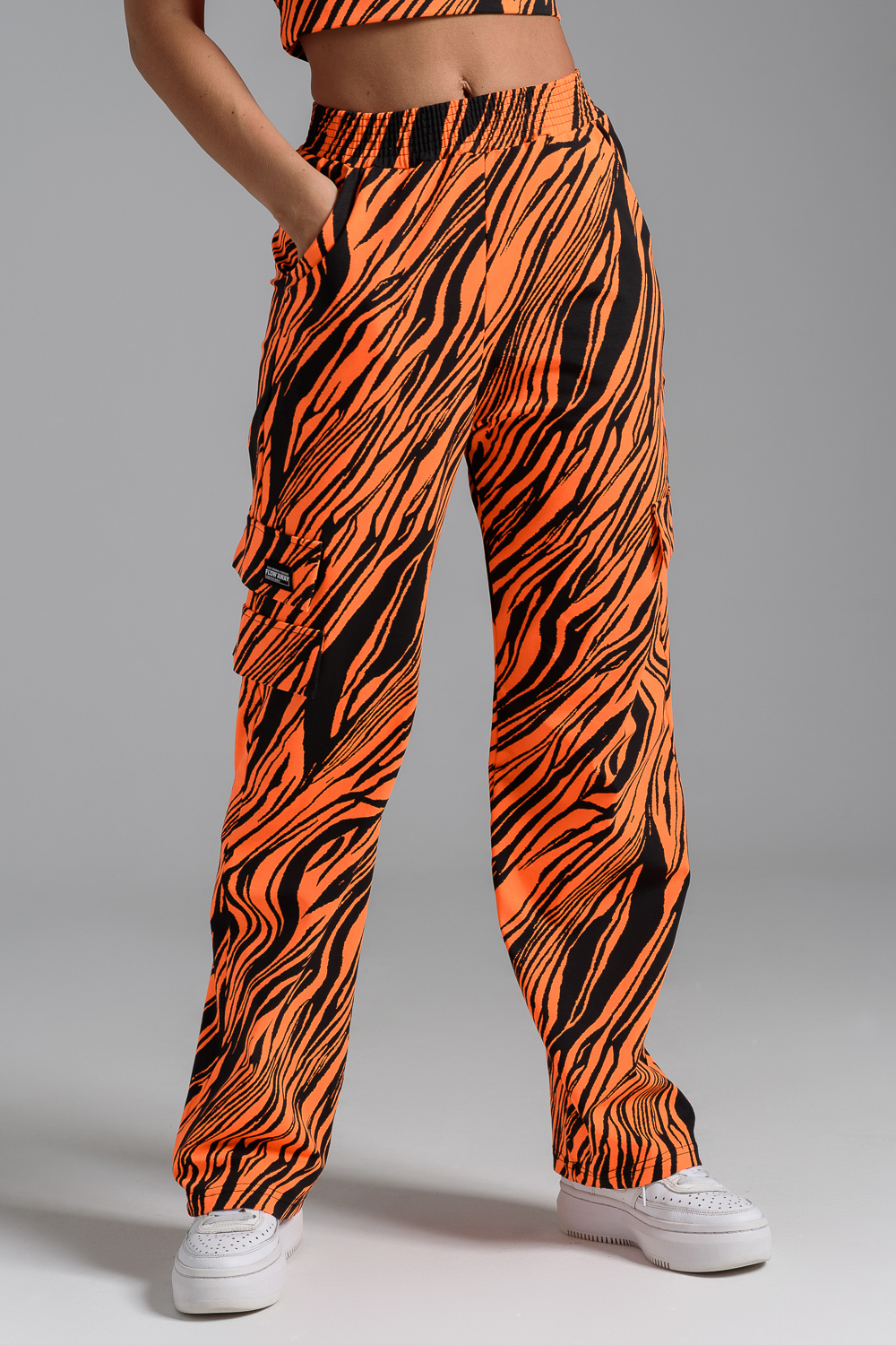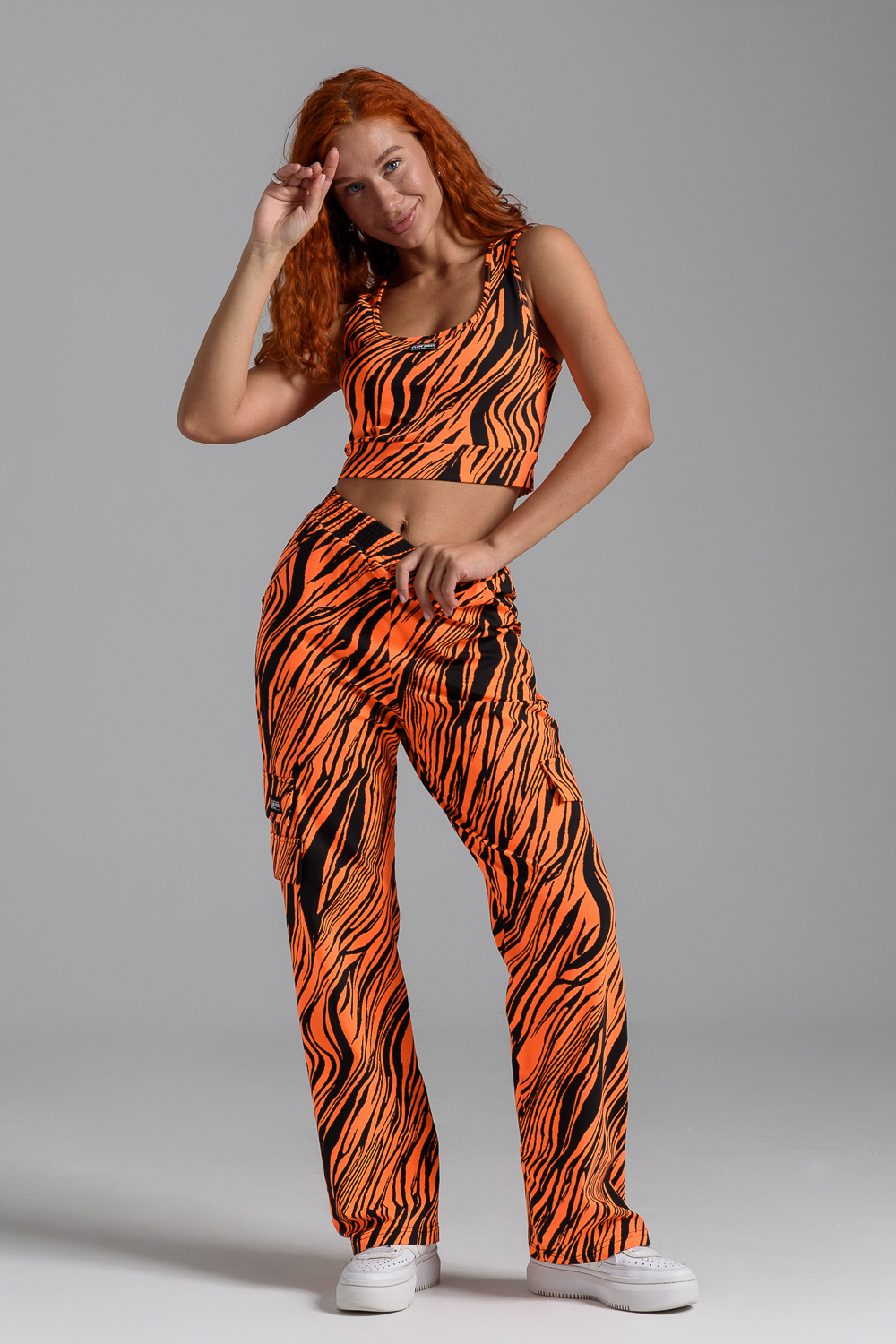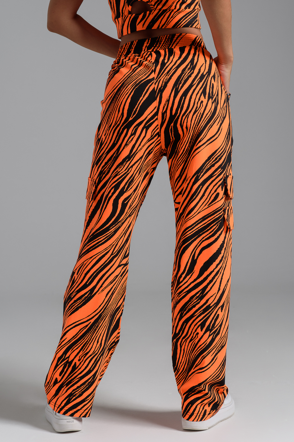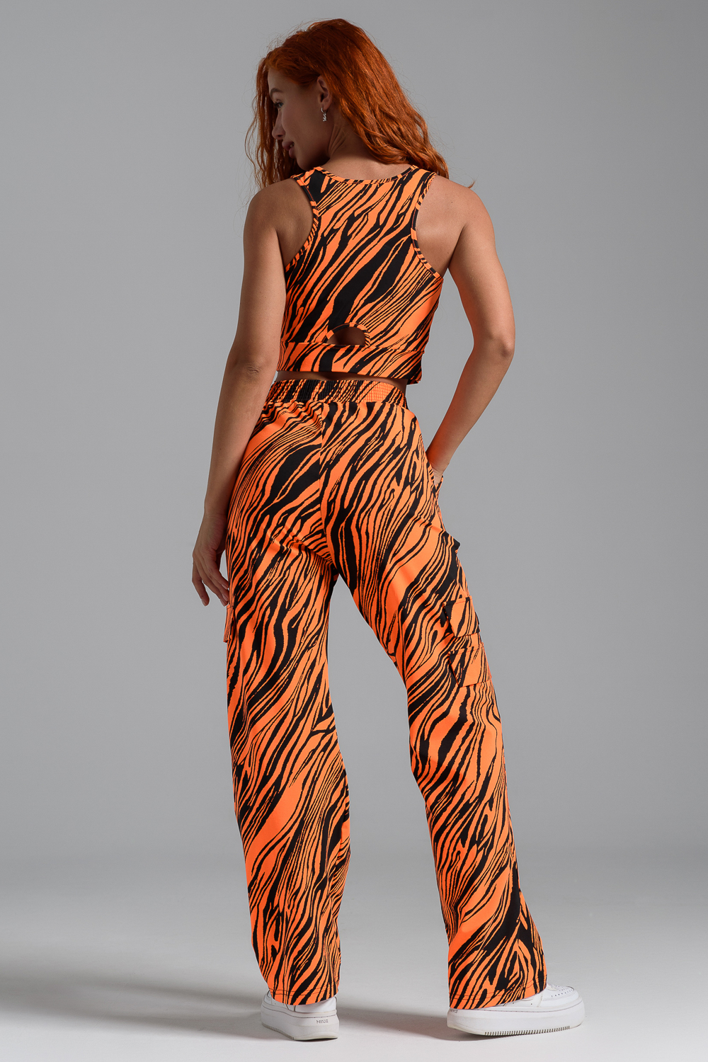 Брюки прямые, на поясе, с боковыми карманами. Декоративные клапаны расположены по бокам брюк.