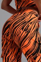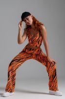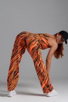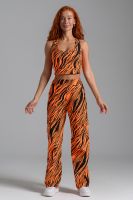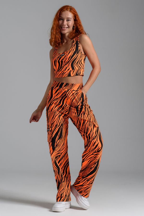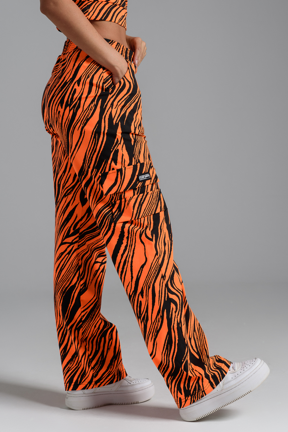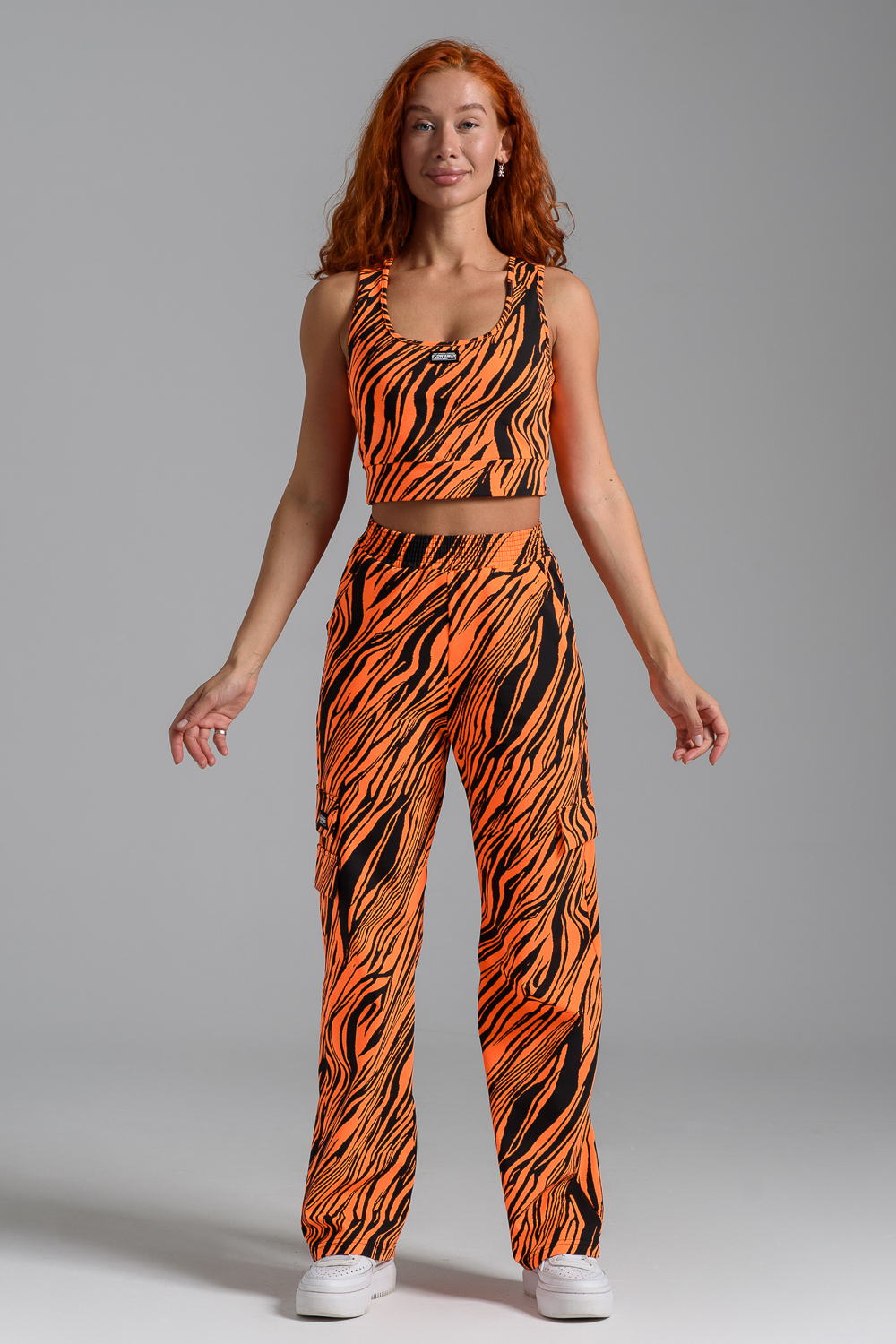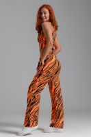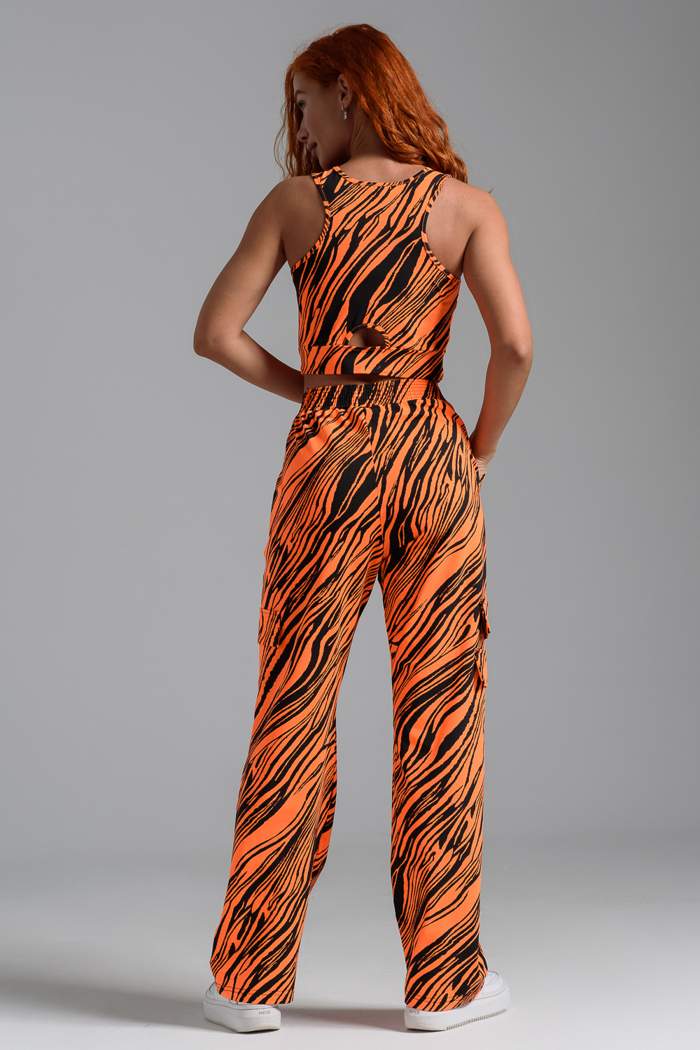 Брюки прямые, на поясе, с боковыми карманами. Декоративные клапаны расположены по бокам брюк.