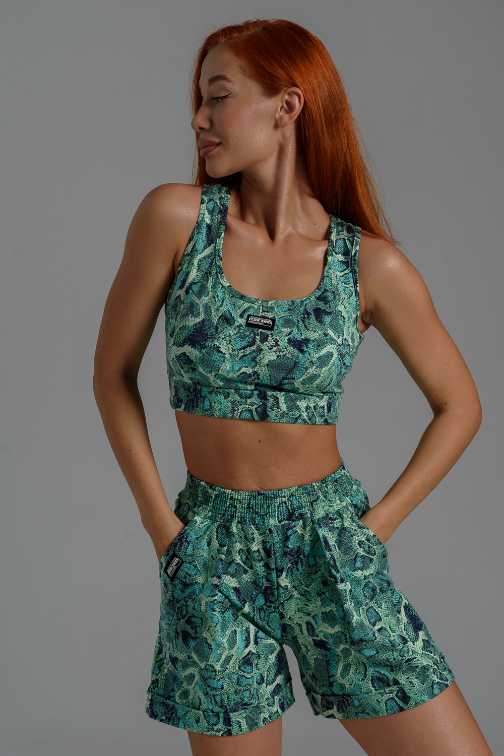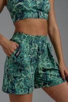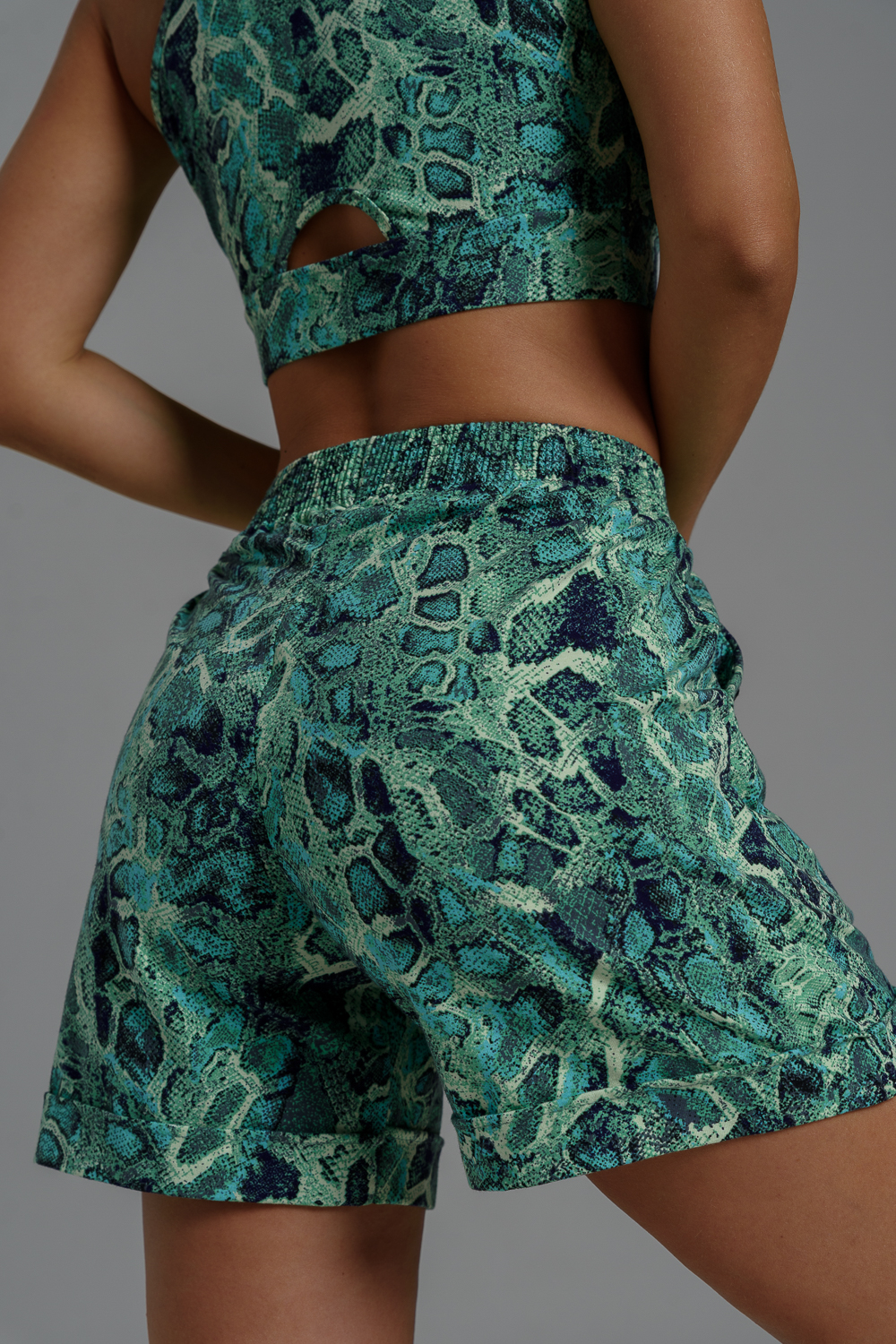 Комплект состоит из топа и шорт. Топ на узких бретелях, с округлой горловиной на полочке и вырезом "борцовка" сзади. Горловина, проймы и вырез на спинке обработаны бейкой из основного полотна. Шорты на поясе, свободные, с боковыми карманами, с декоративными отворотами по низу. В верхней части передних половинок по шву притачивания пояса расположены складки.