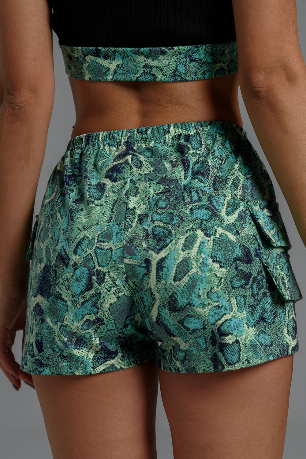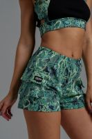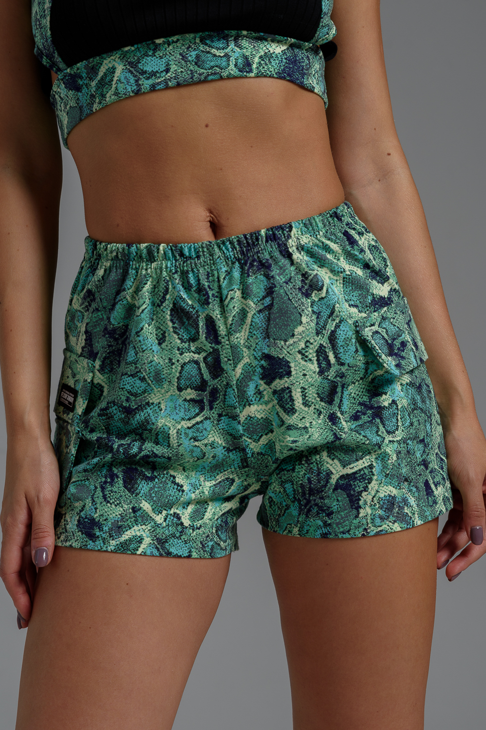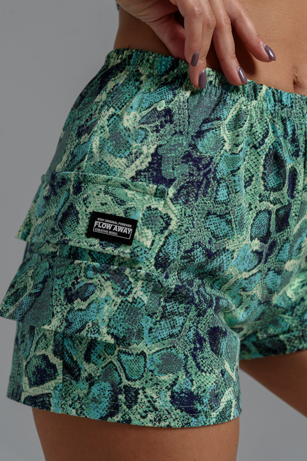 Шорты прямые, короткие, на резинке, с декоративными клапанами по бокам.